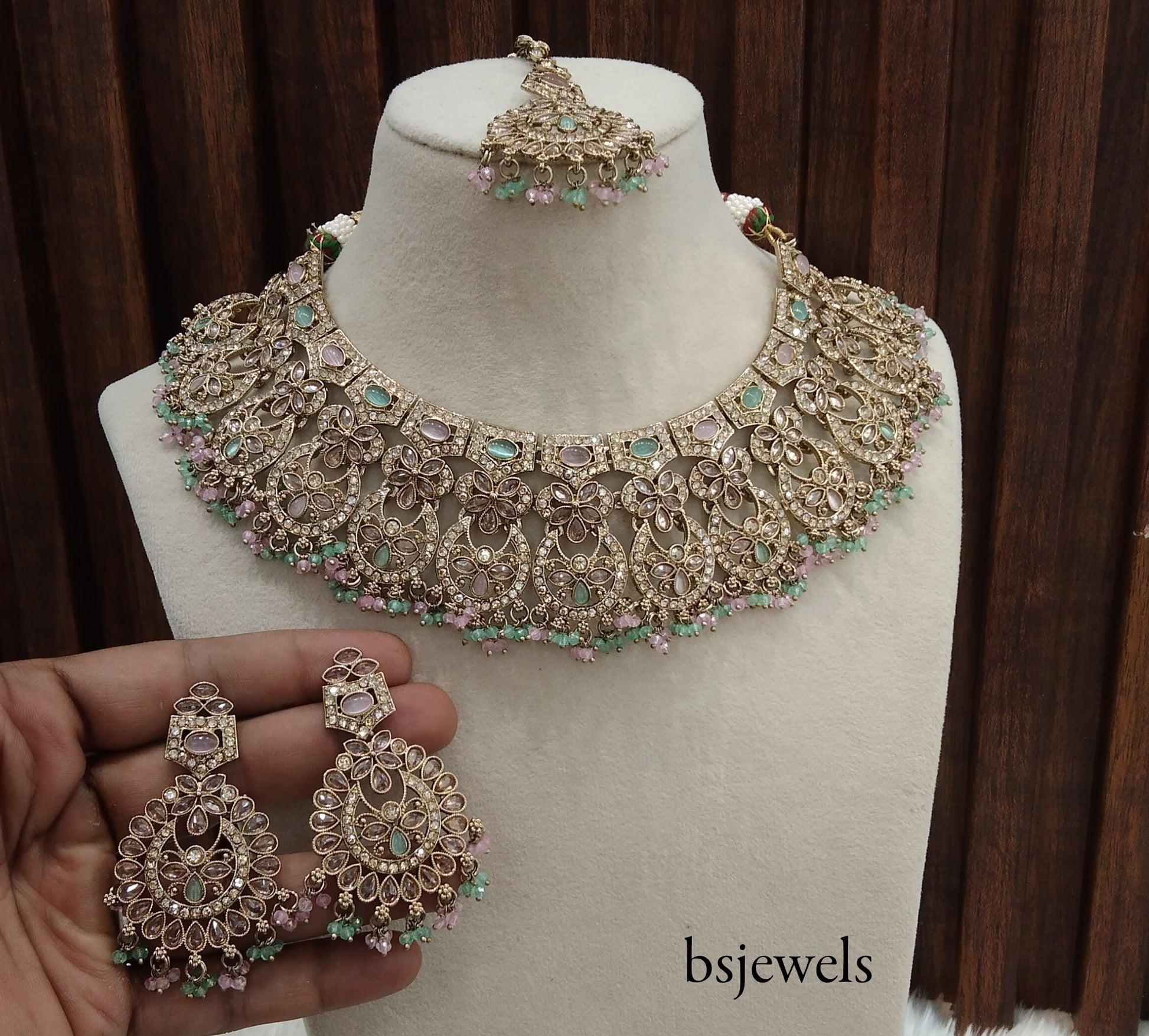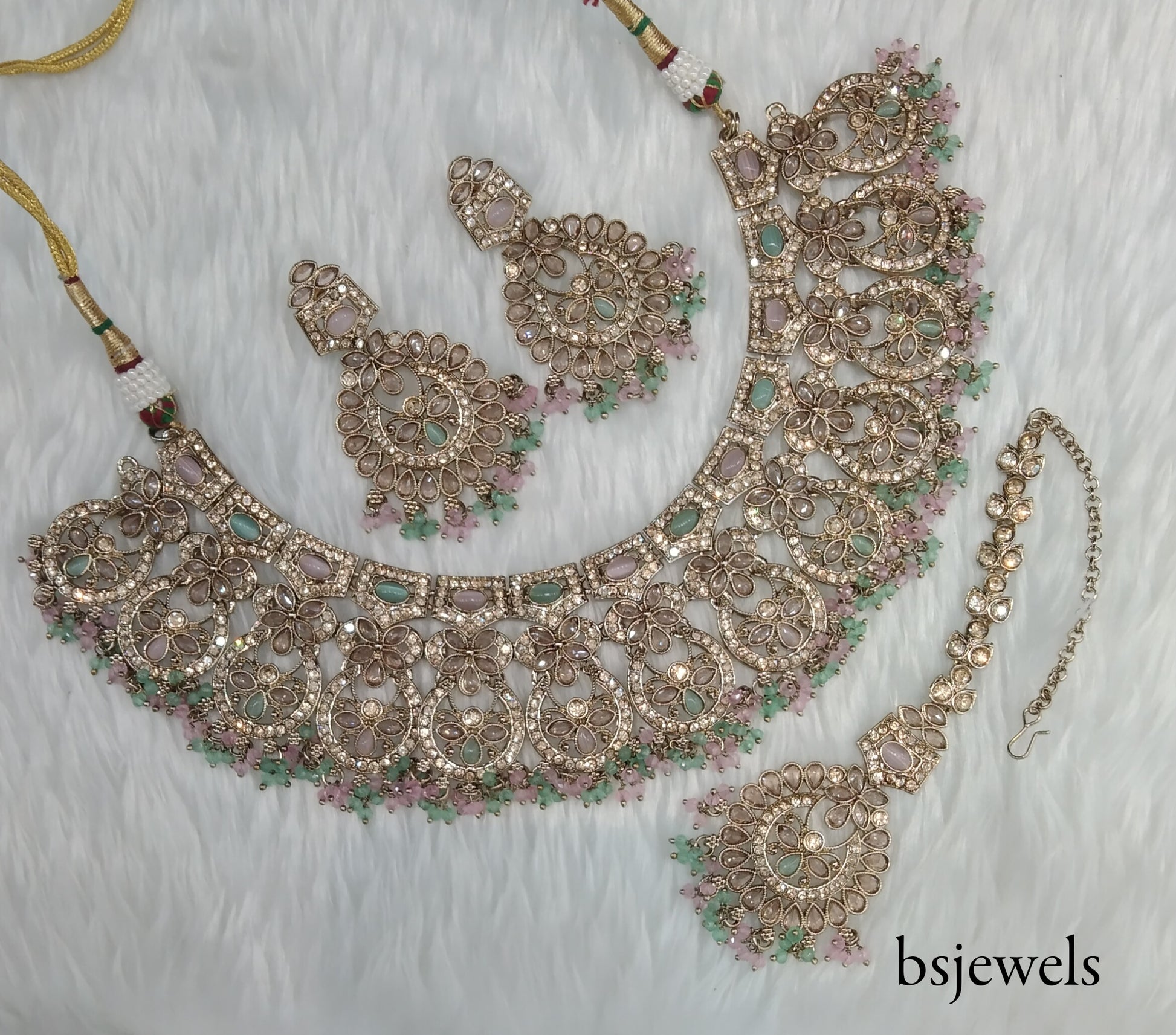 Antique Gold Mint Pink Necklace Jewellery Binder Bollywood Set