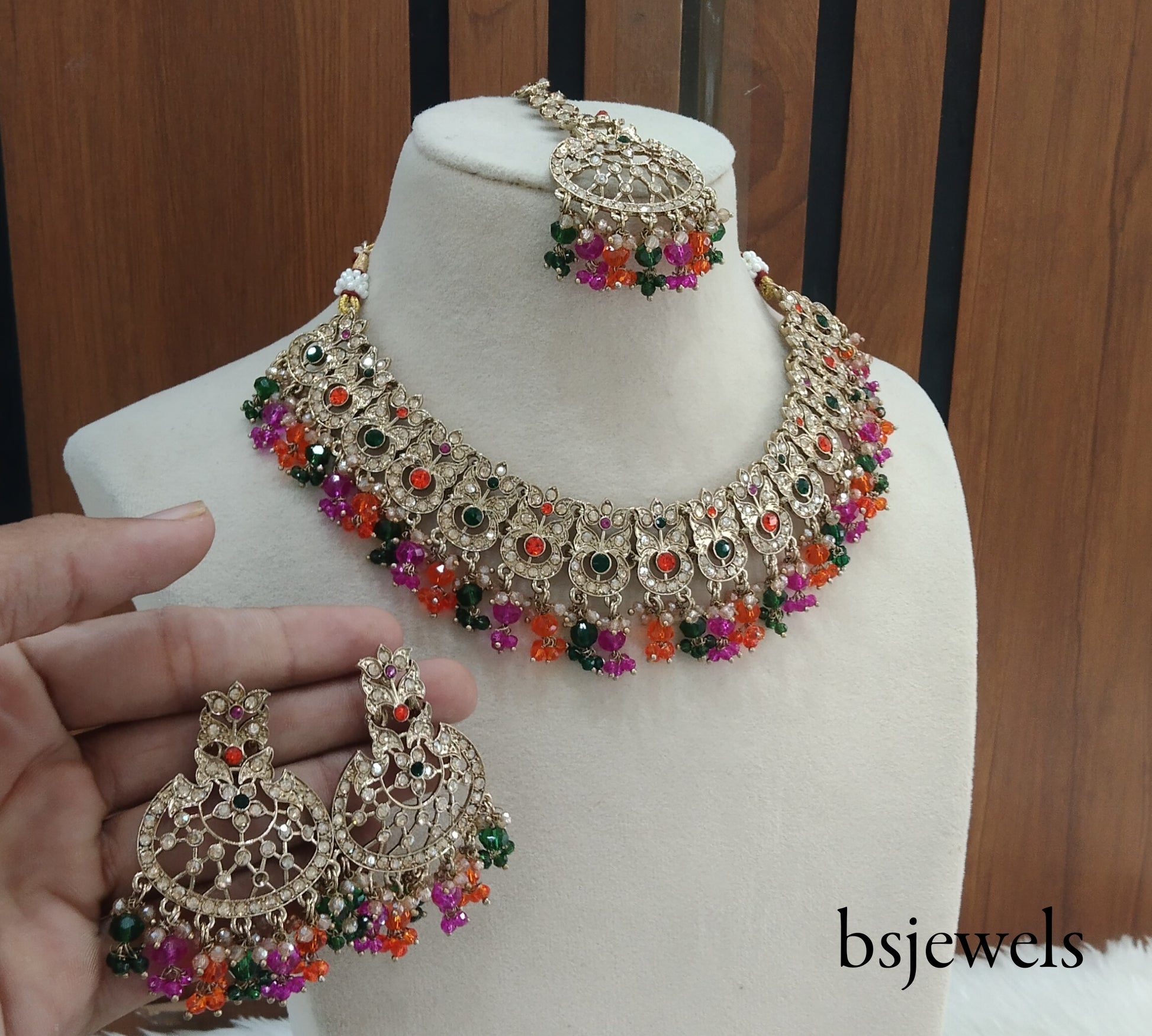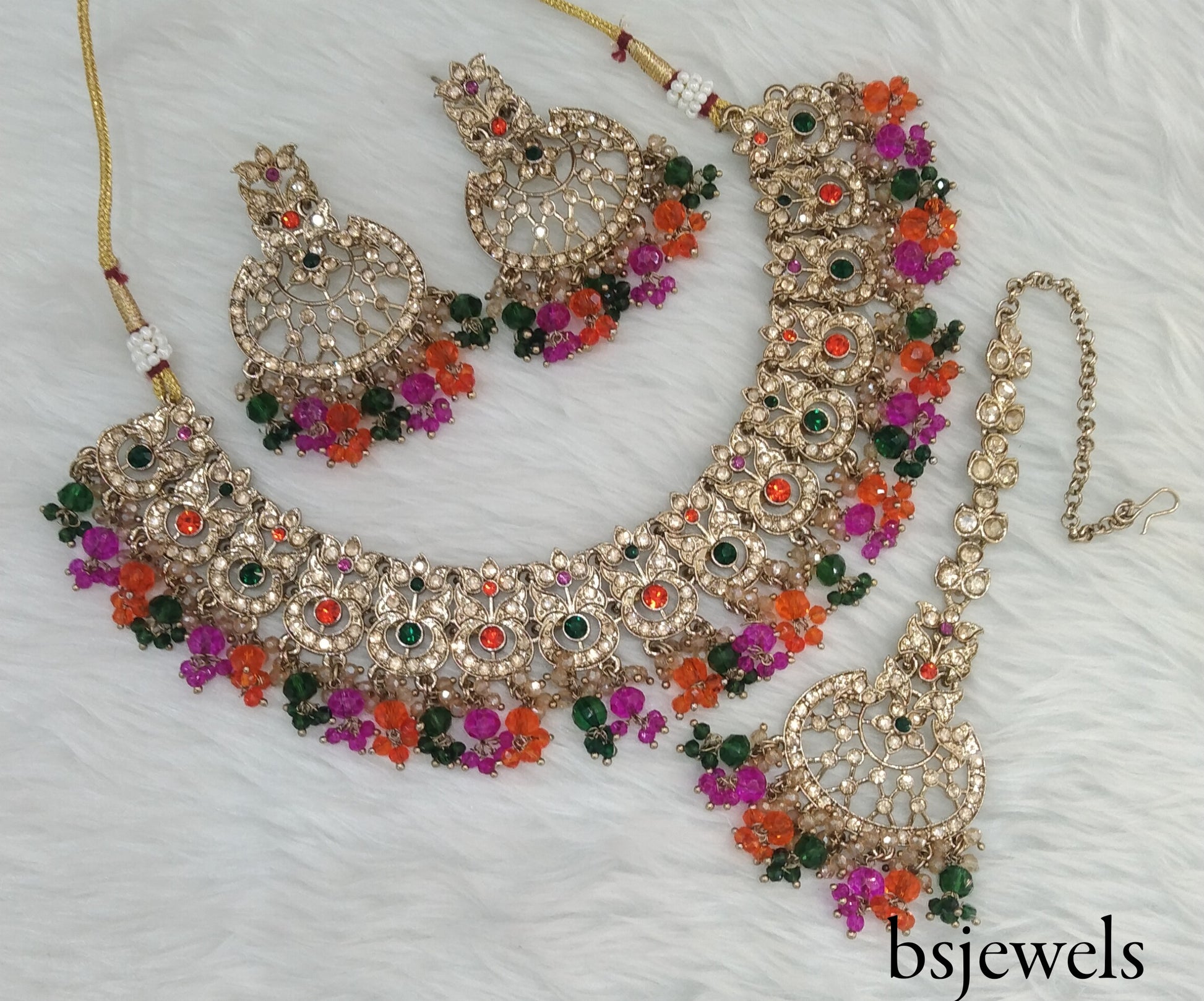 Antique Gold Multi Colour Necklace Jewellery Isha Bollywood Set