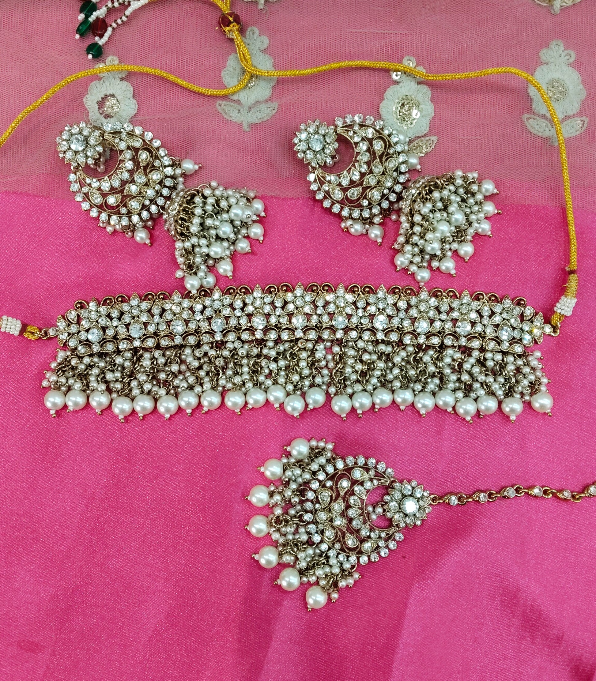 Antique White Crystal Stone Choker Jhumka Jewellery Siraj Set