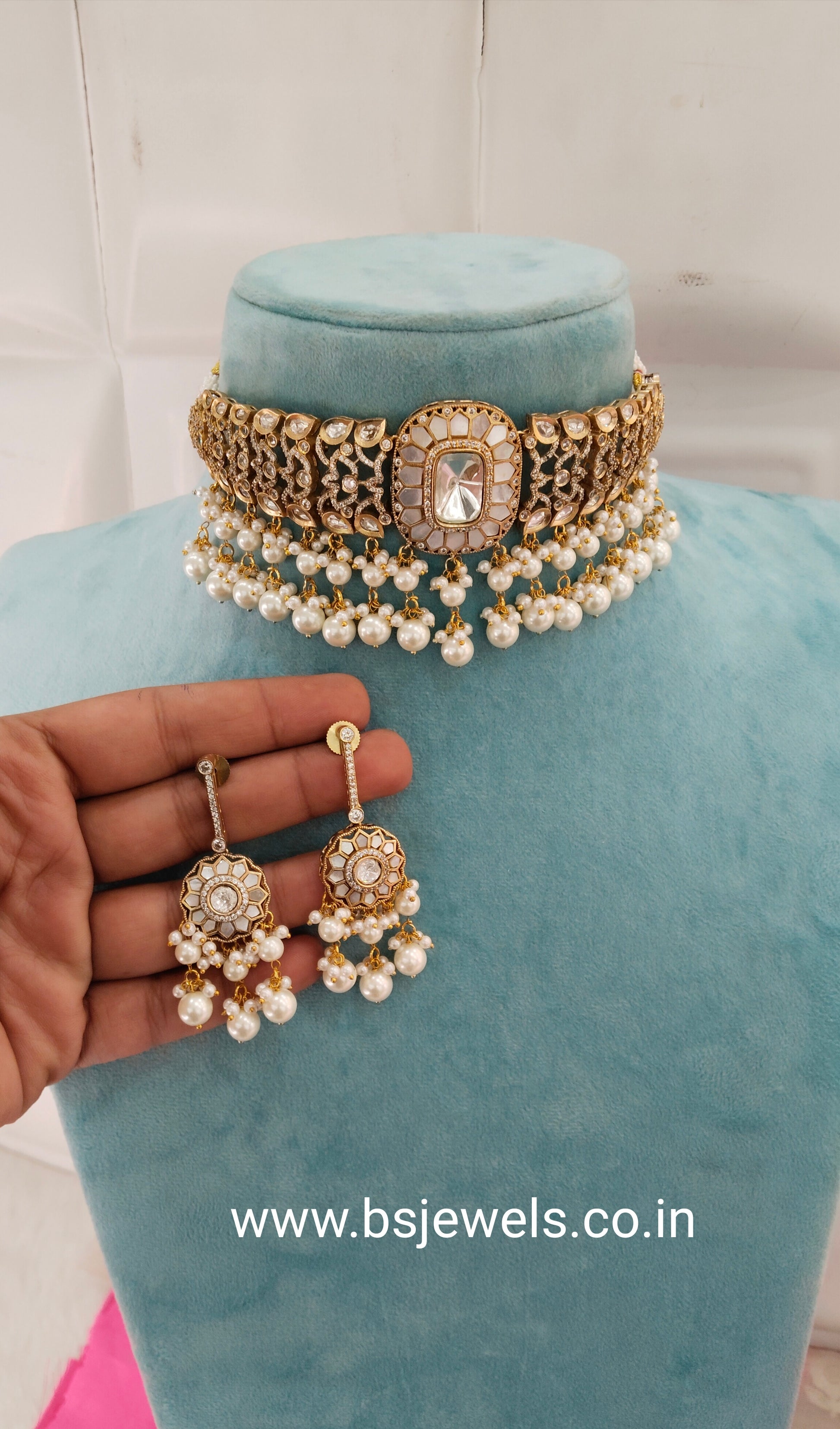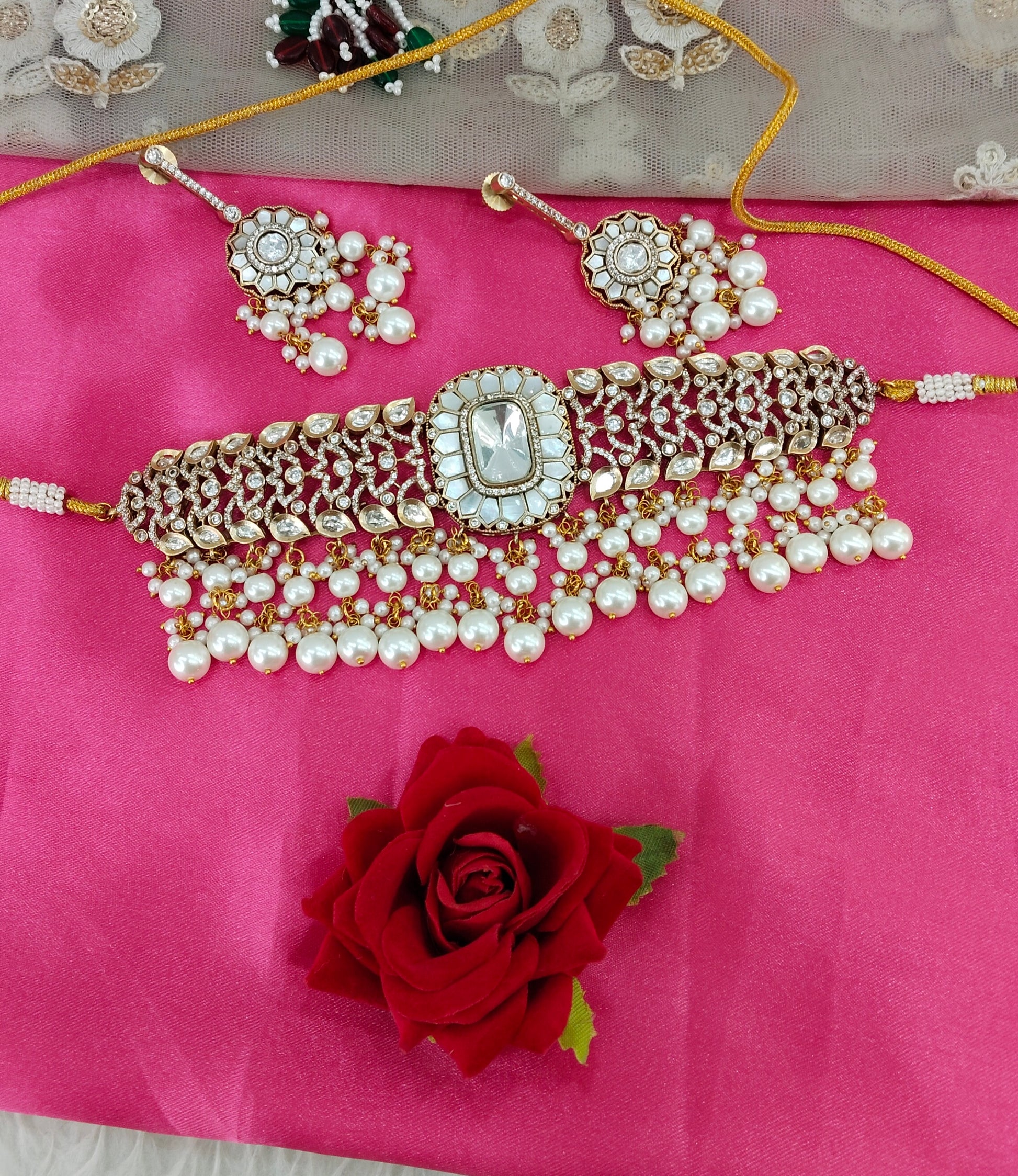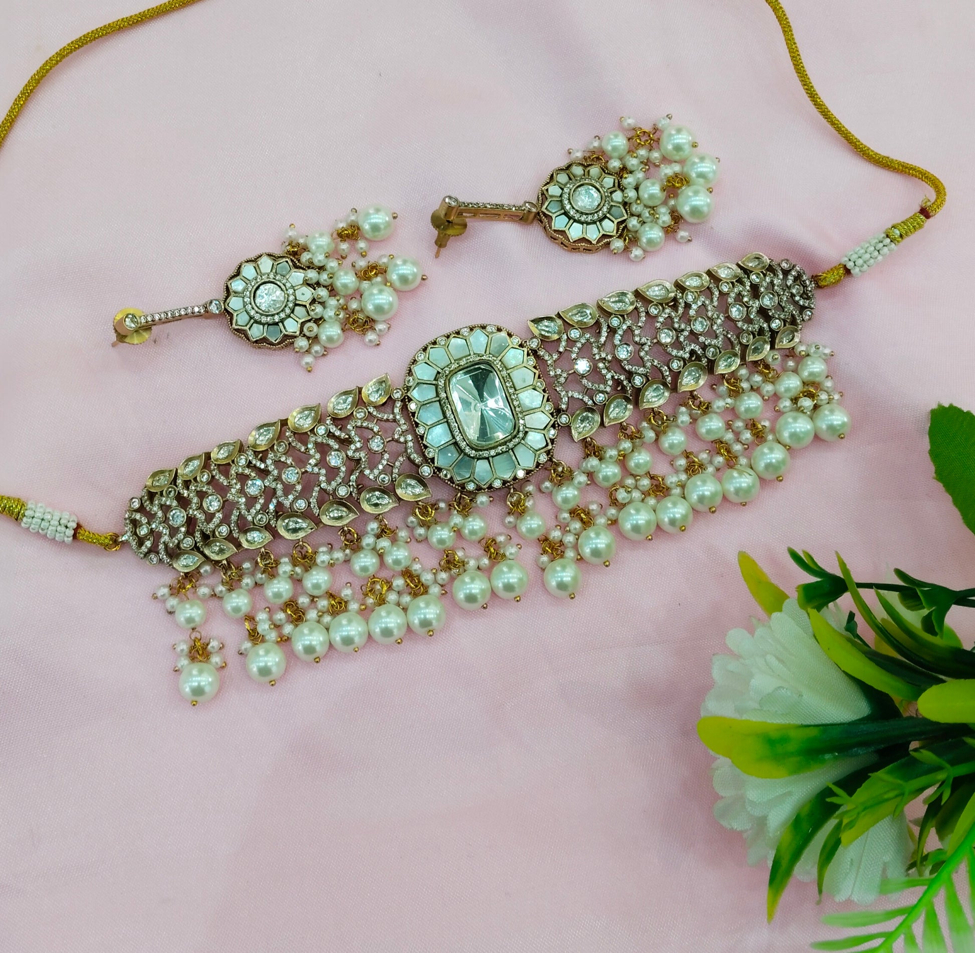Antique White Moissanite Kundan Mother Of Pearl Choker Jewellery Maya Set