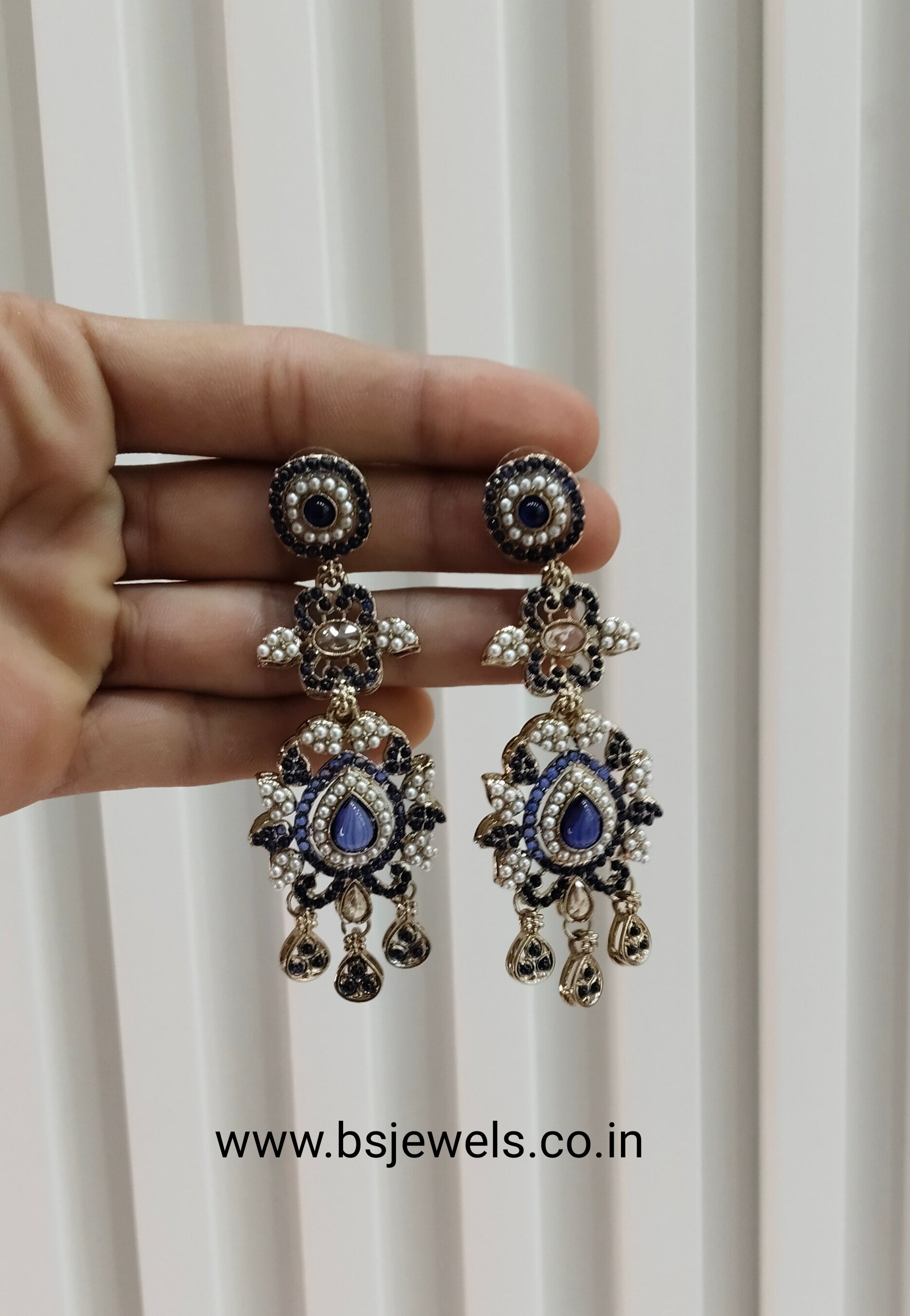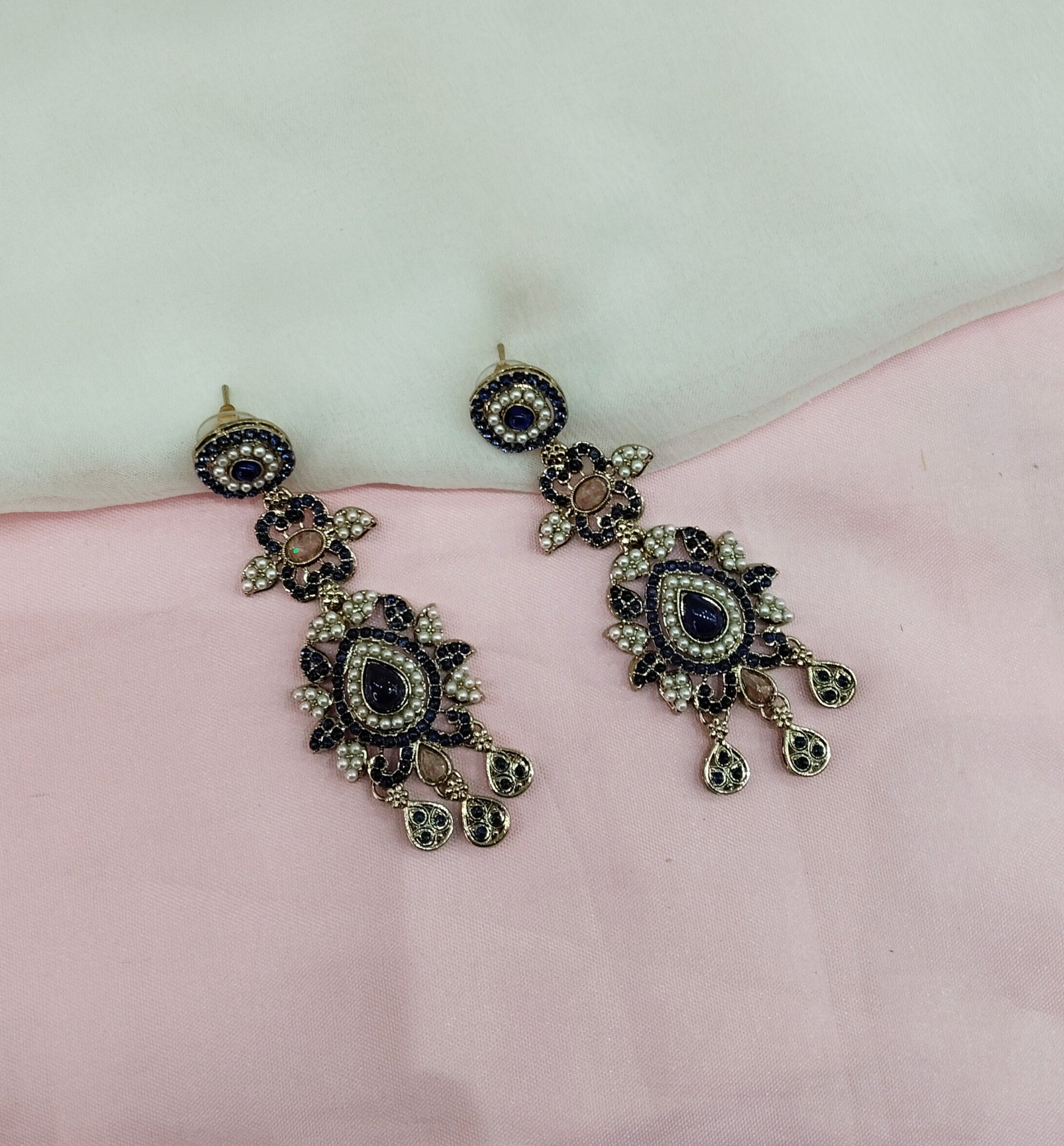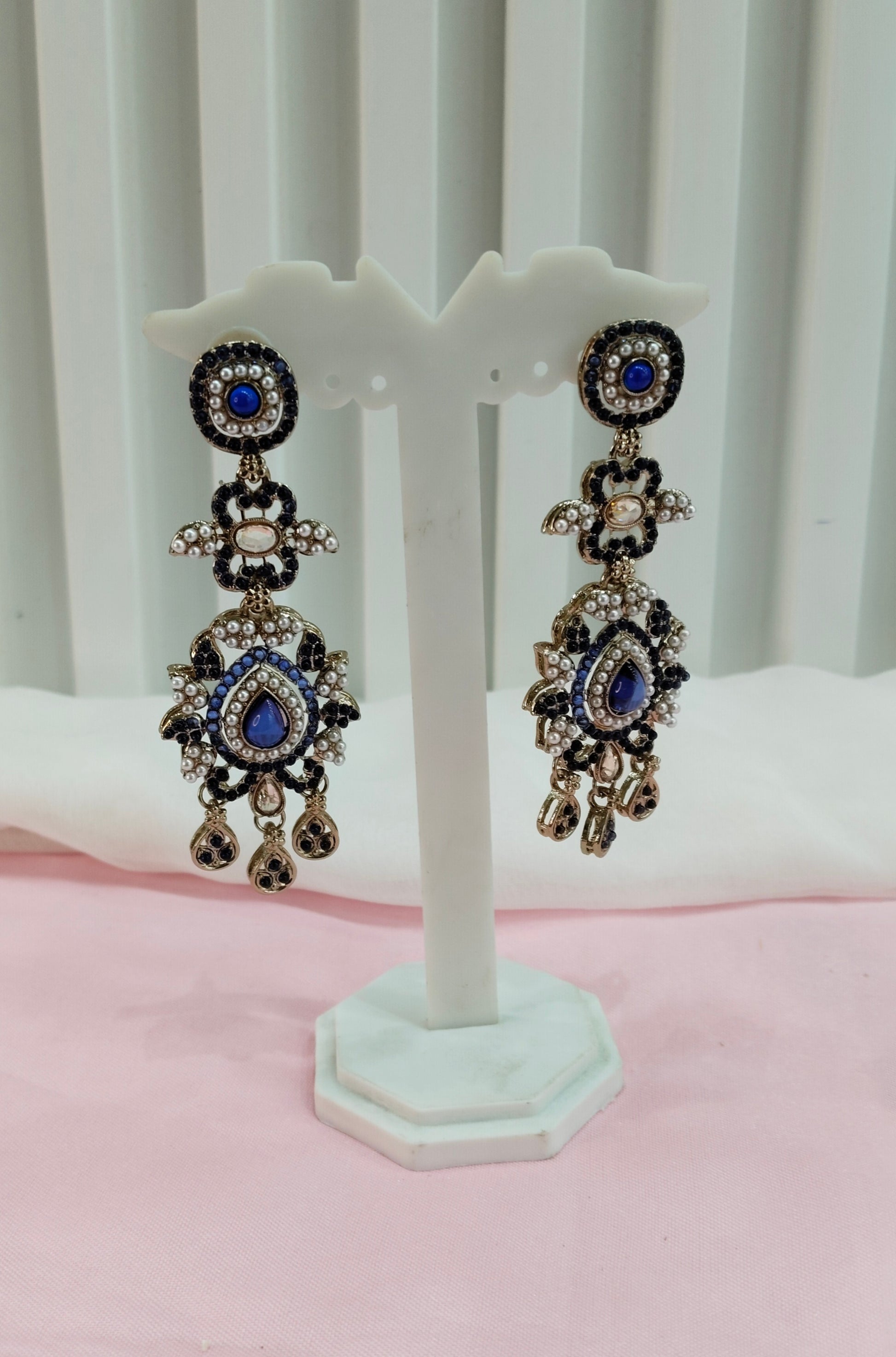 Blue Antique Gold Bollywood Earrings Nahar Set