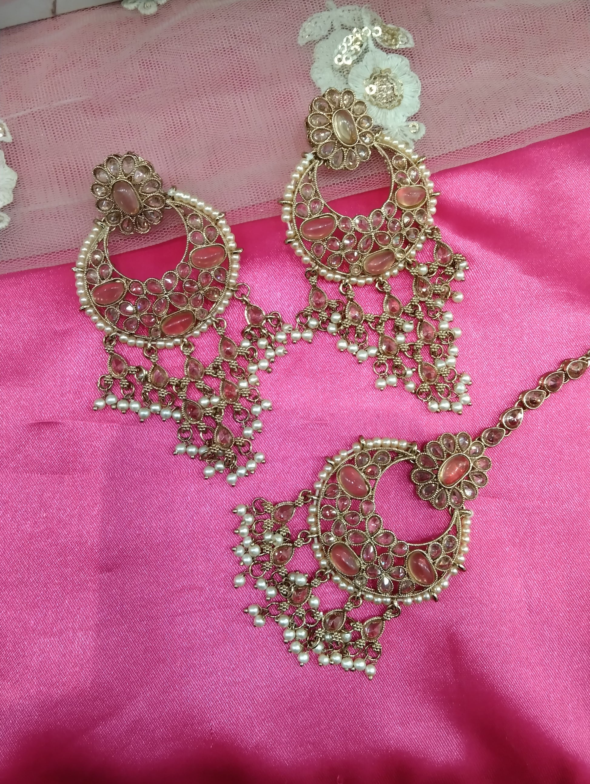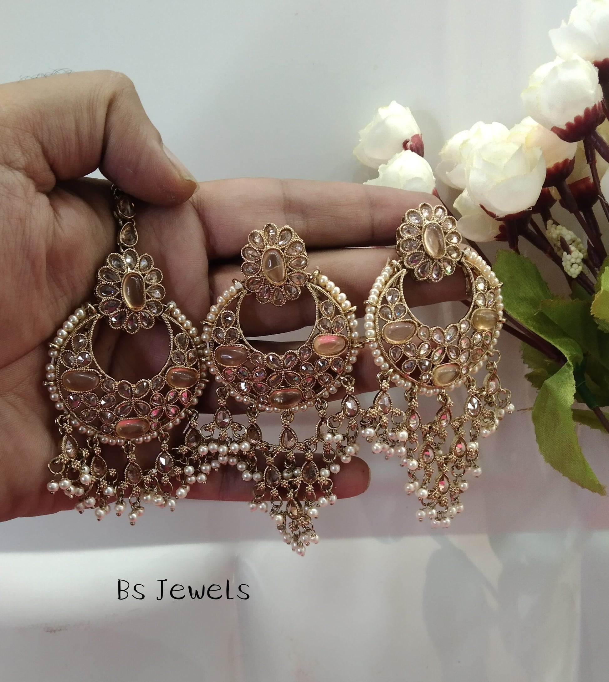 Champagne Gold Stone Meena Bollywood Earrings Tikka Set