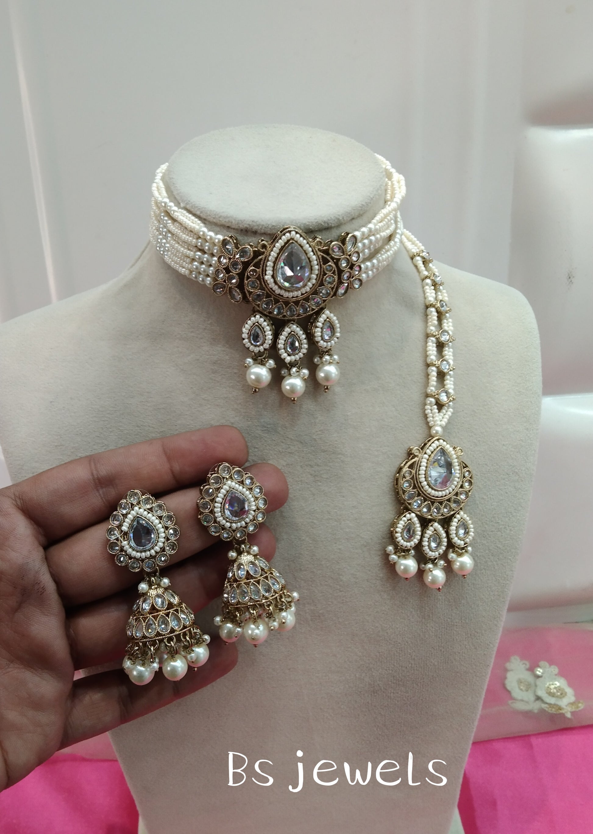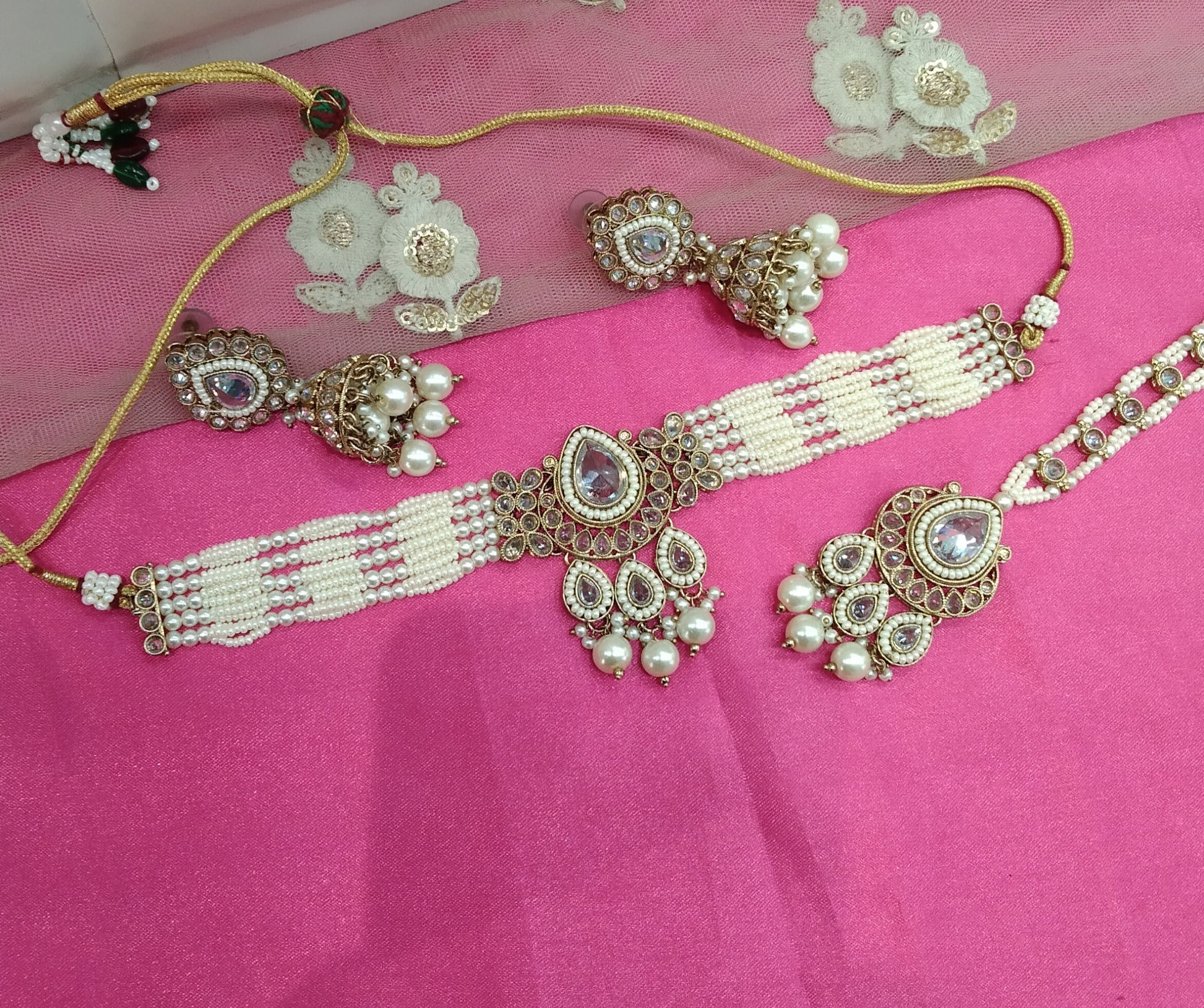 White Champagne Stone Choker Jhumka Jewellery Alan Set