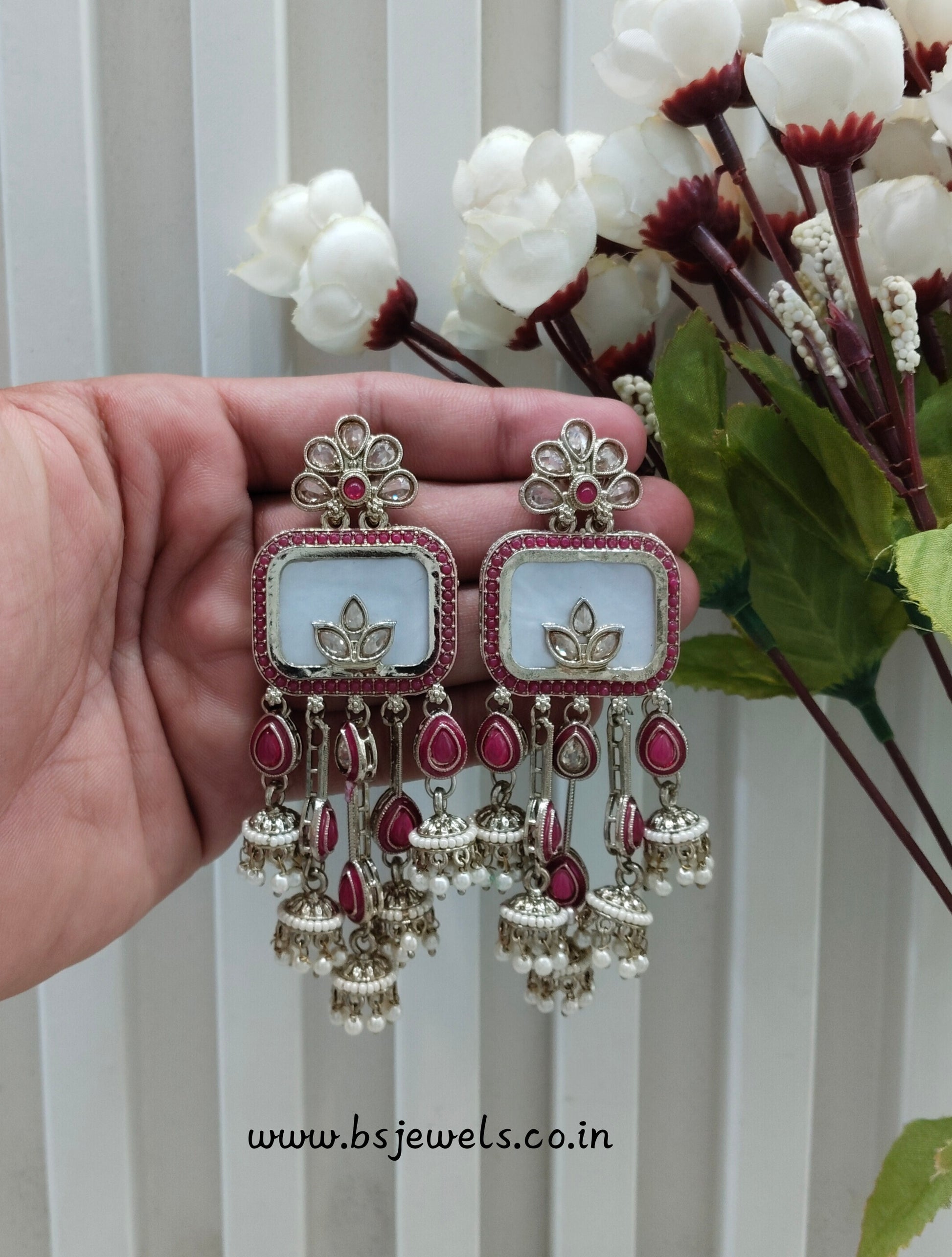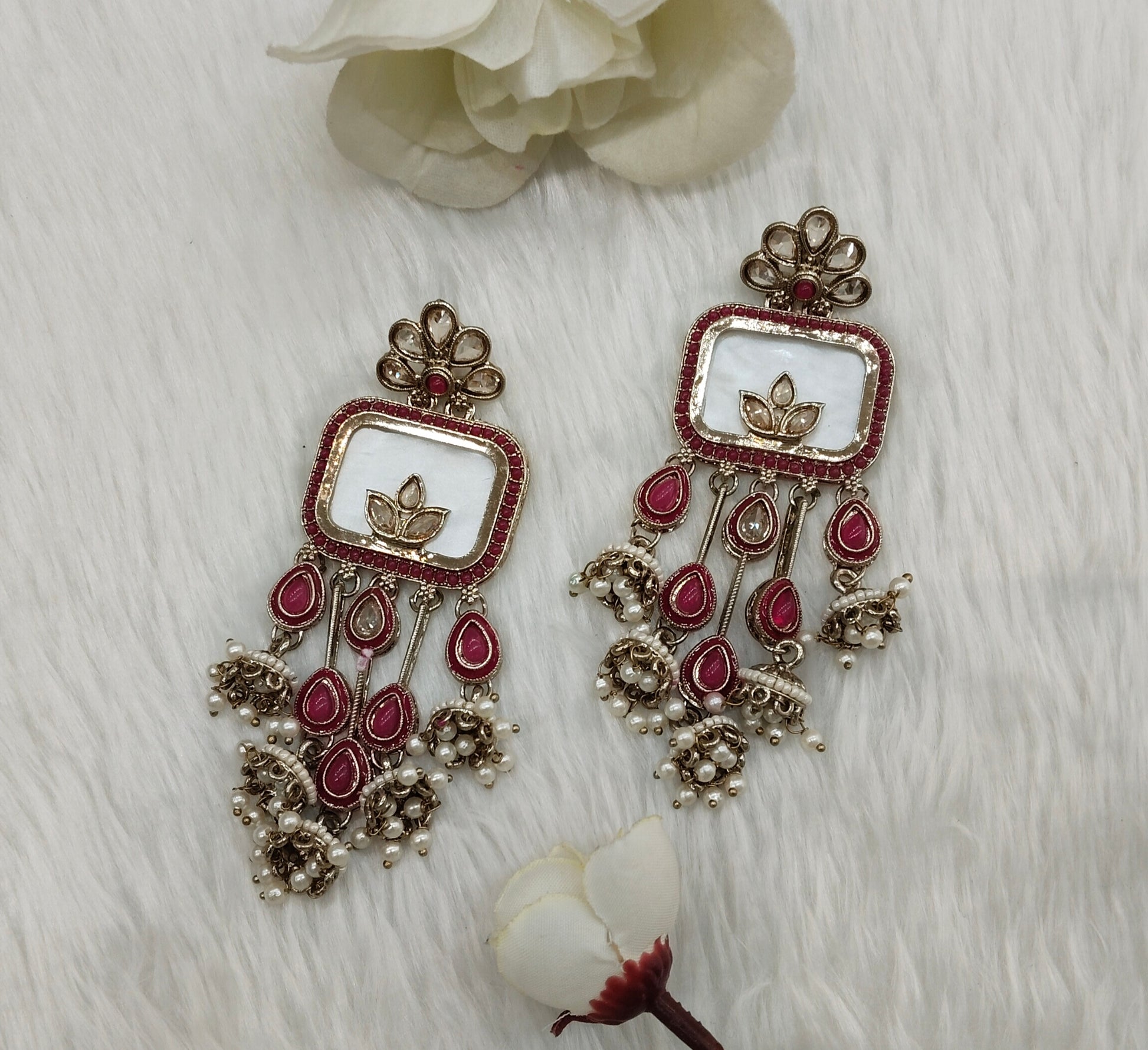 Dark Pink White Antique Gold Bollywood Ravi Earrings