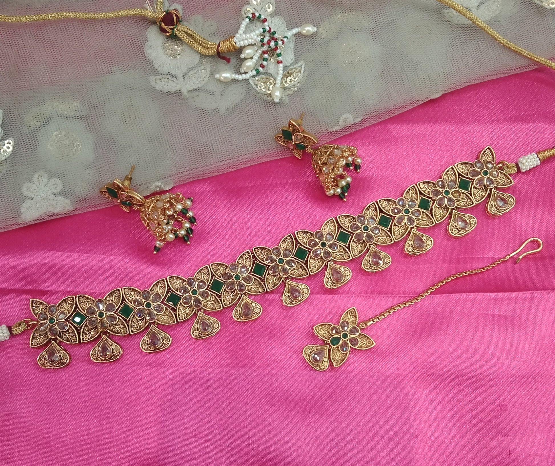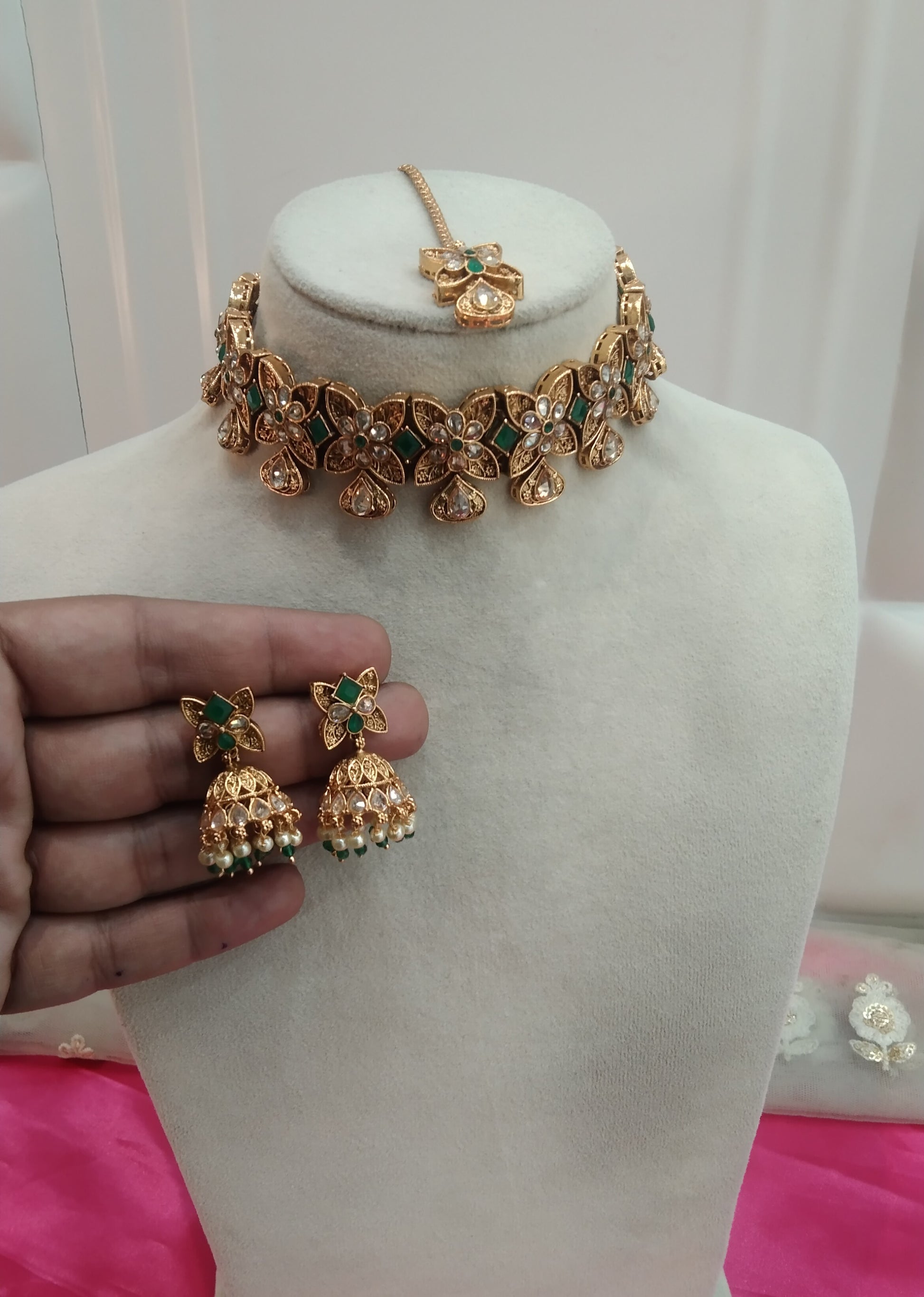Gold Green Polki Jhumki Choker Jewellery Levit Set
