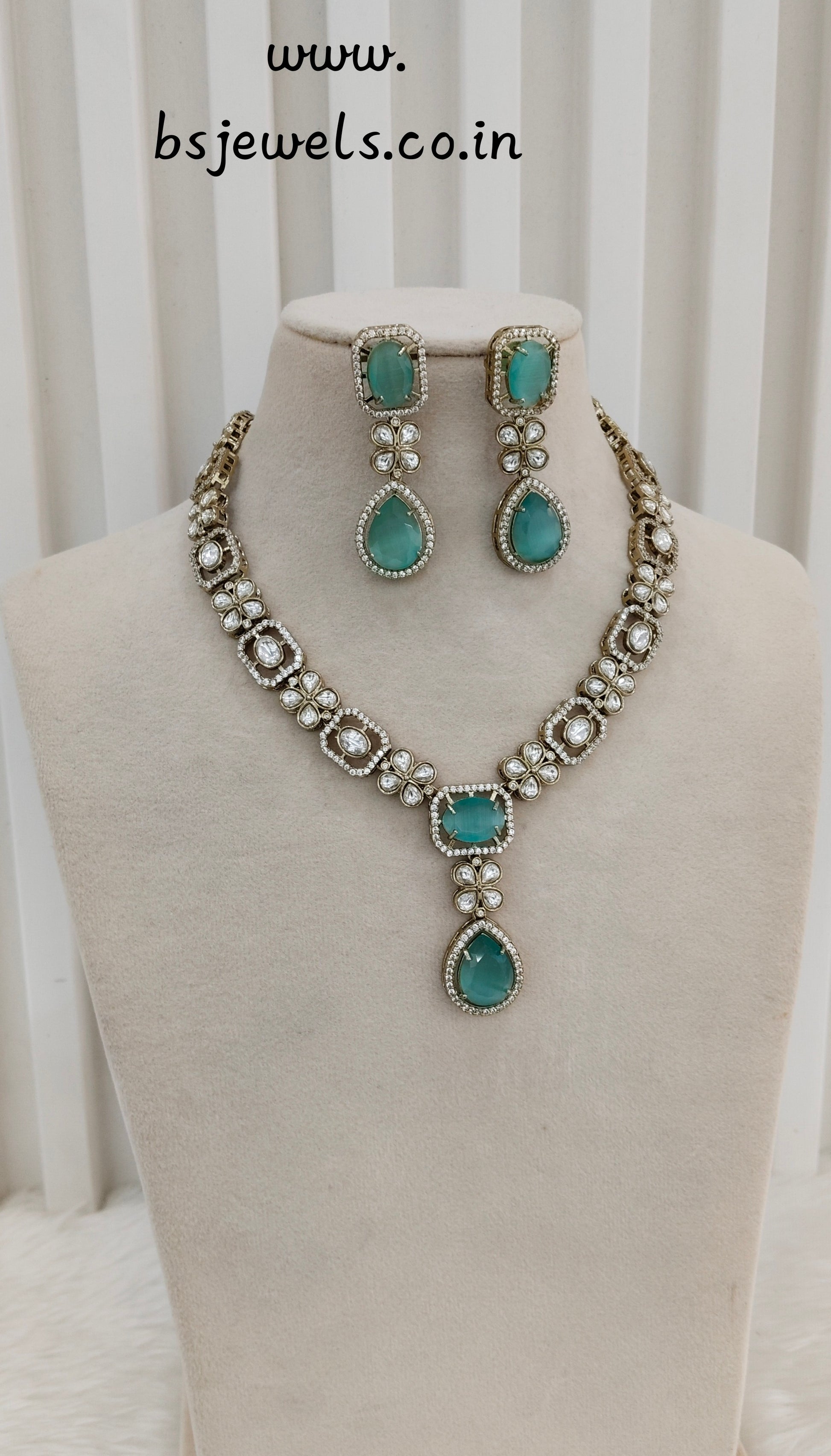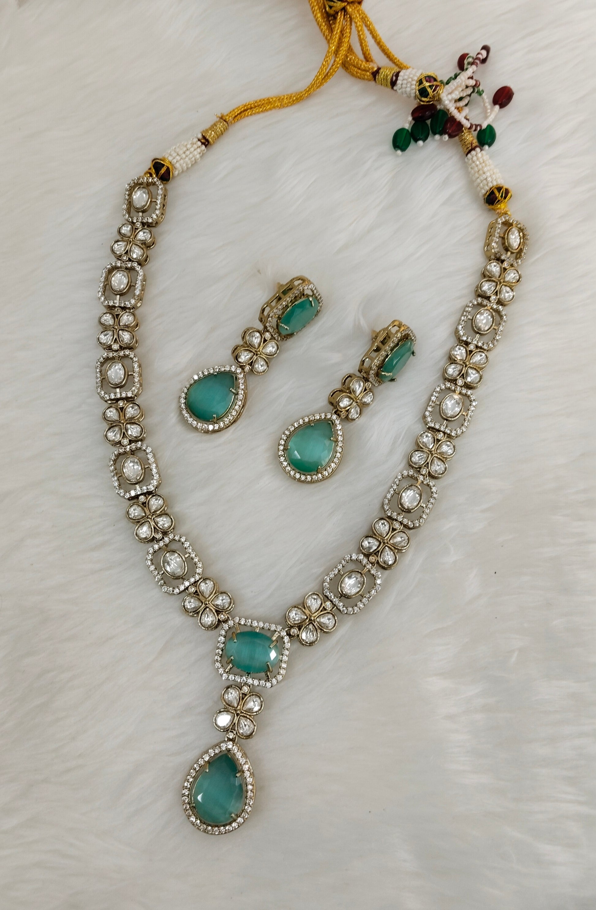 Sea Green Gold Moissanite Kundan Necklace Jewellery Kabota Set