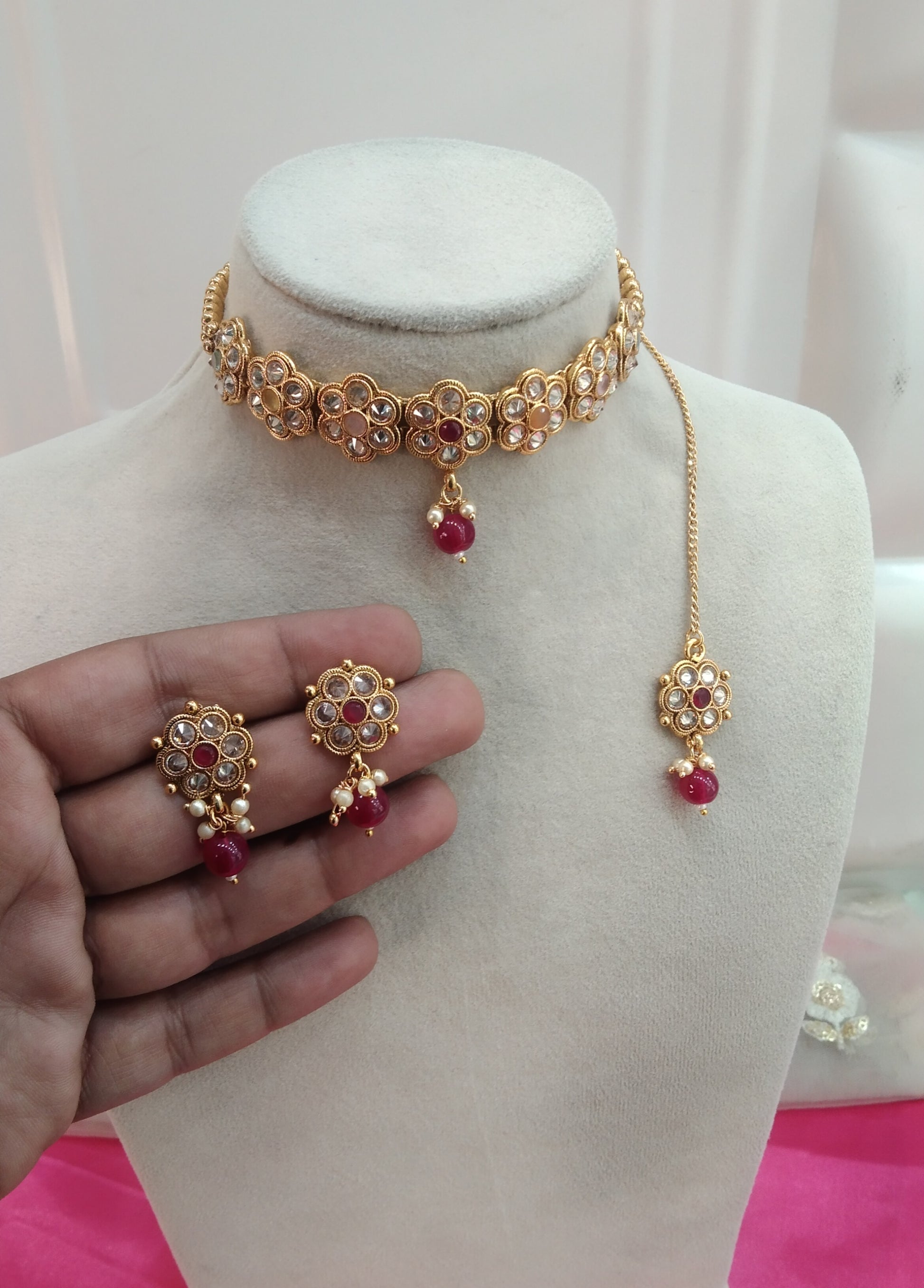 Gold Multi Color Polki Choker Jewellery Olean Tikka Set