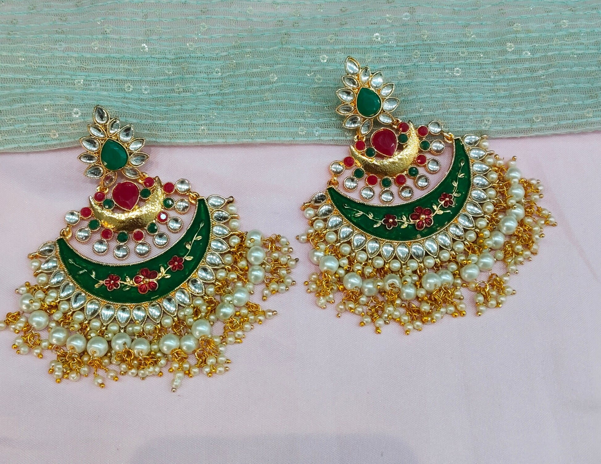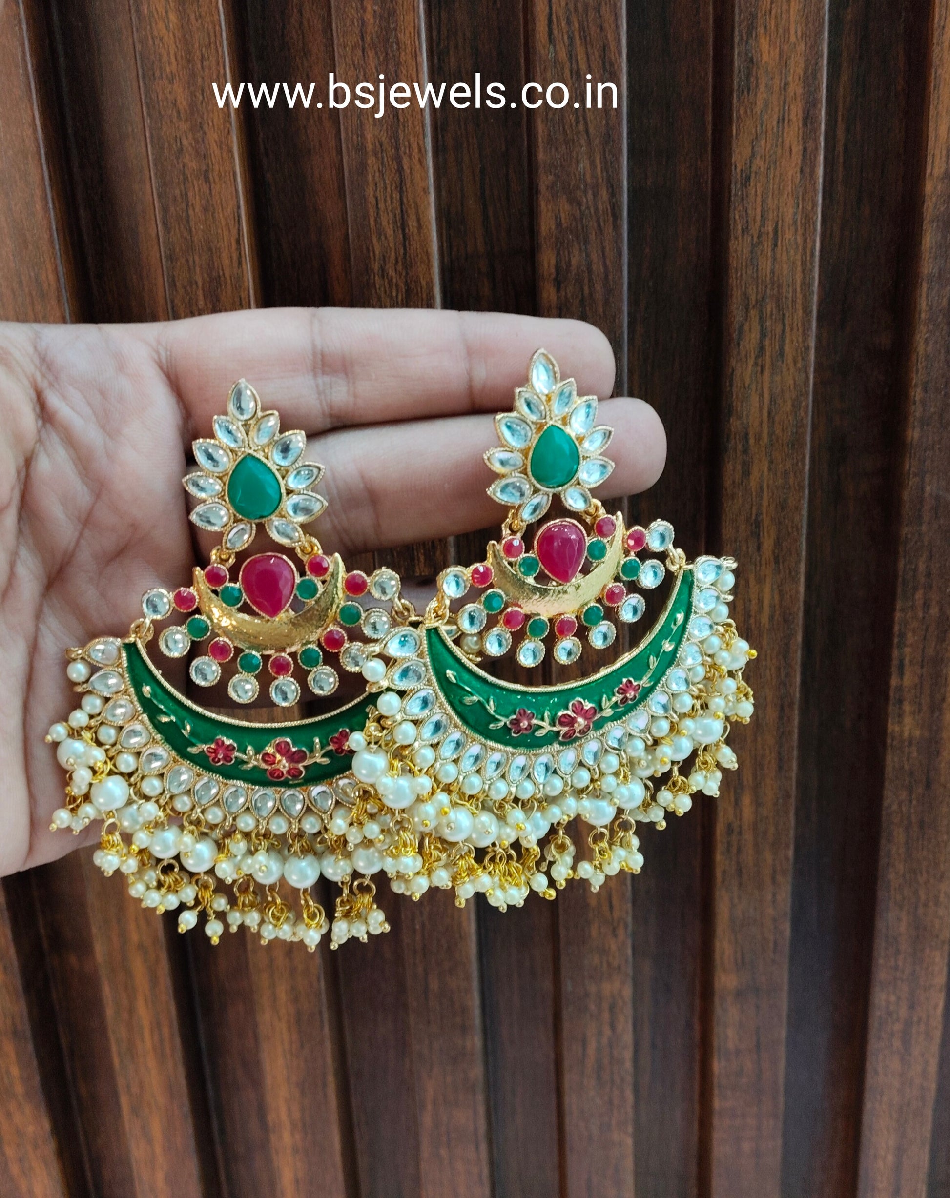 Gold Ruby Green Kundan Chandwali Bollywood Earrings Jewellery Gurpyar Set