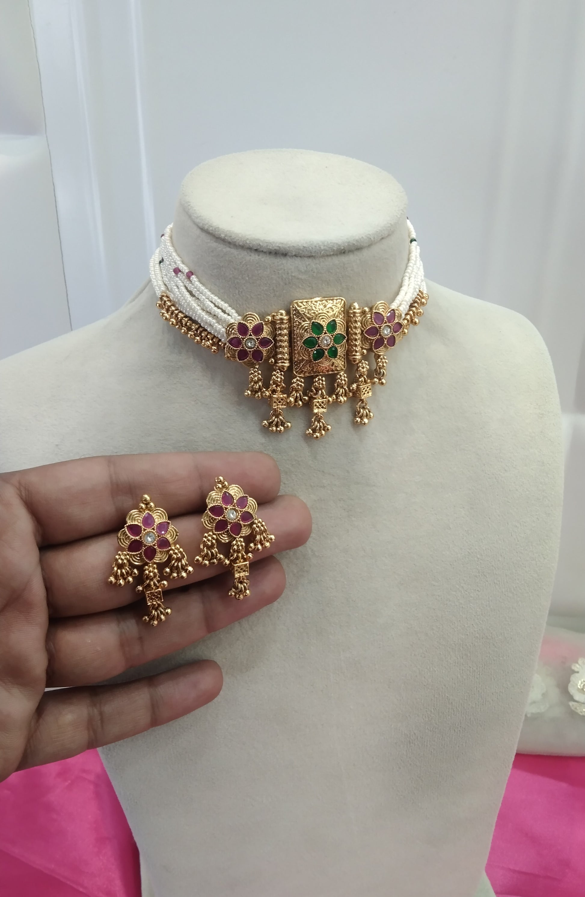 Gold Ruby Green polki Choker Jewellery Rishi Set