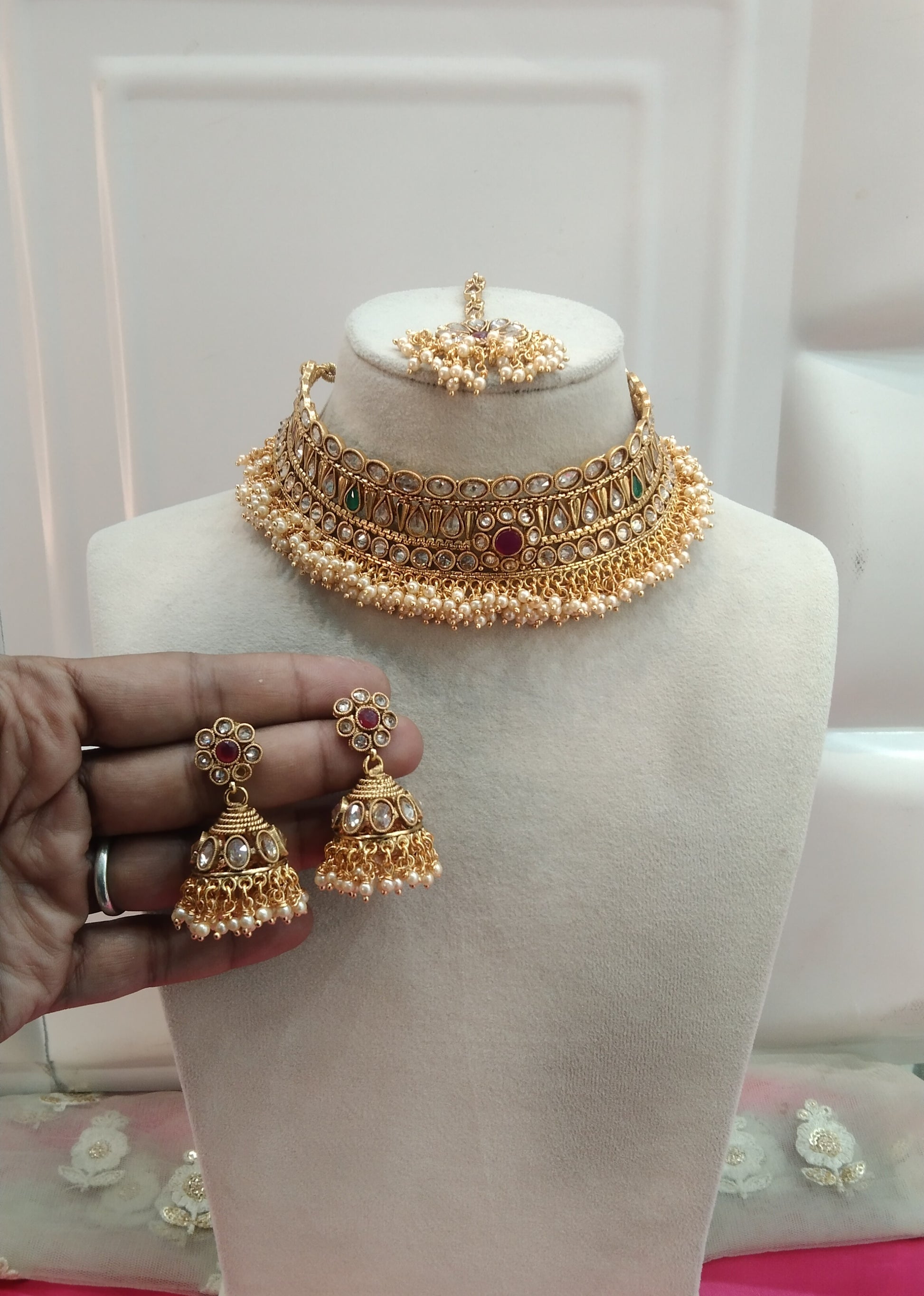 Gold Ruby Green Polki Jhumka Choker Jewellery Beams Set