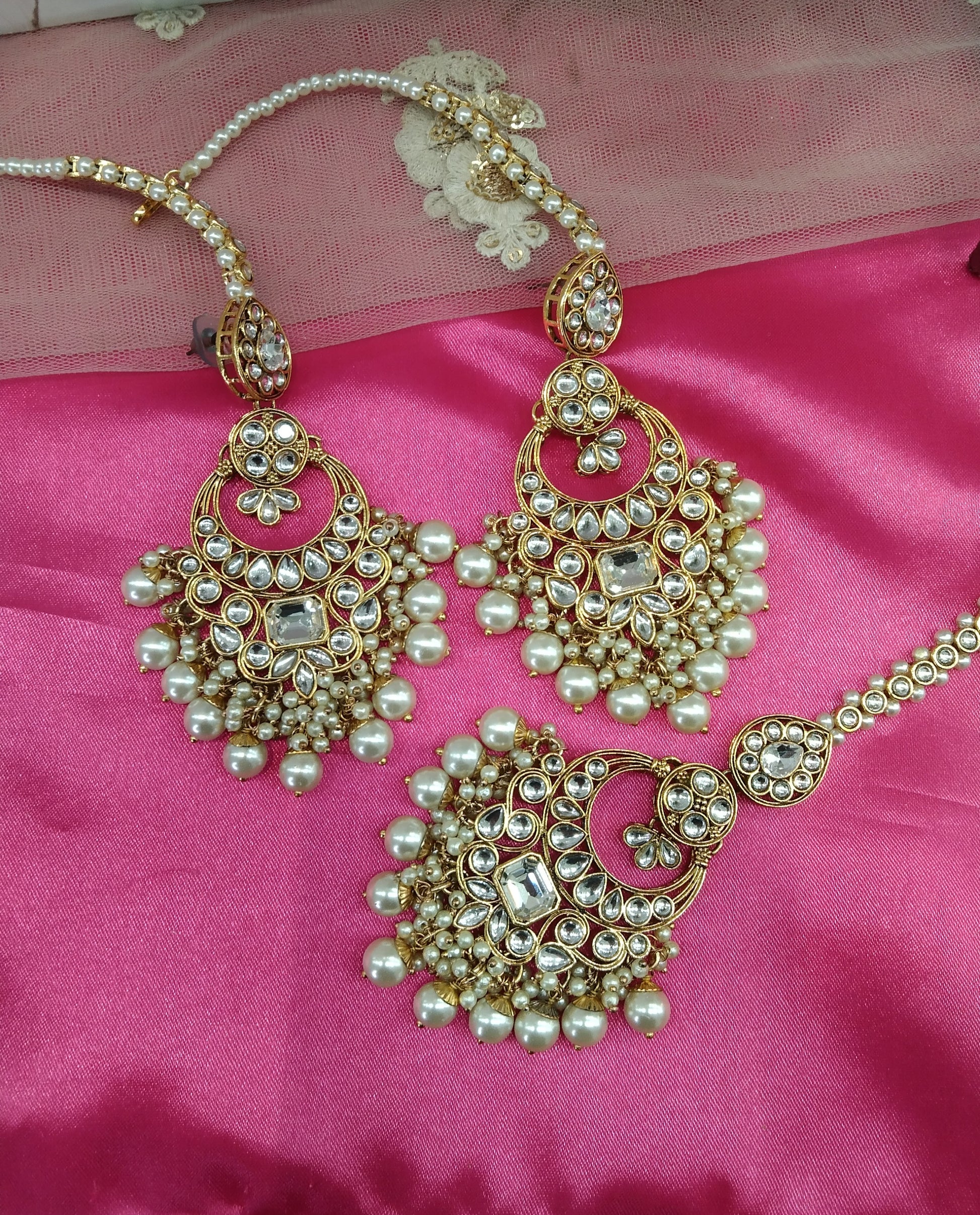 Gold White Kundan Chandbali Group Bollywood Earrings Tikka Set