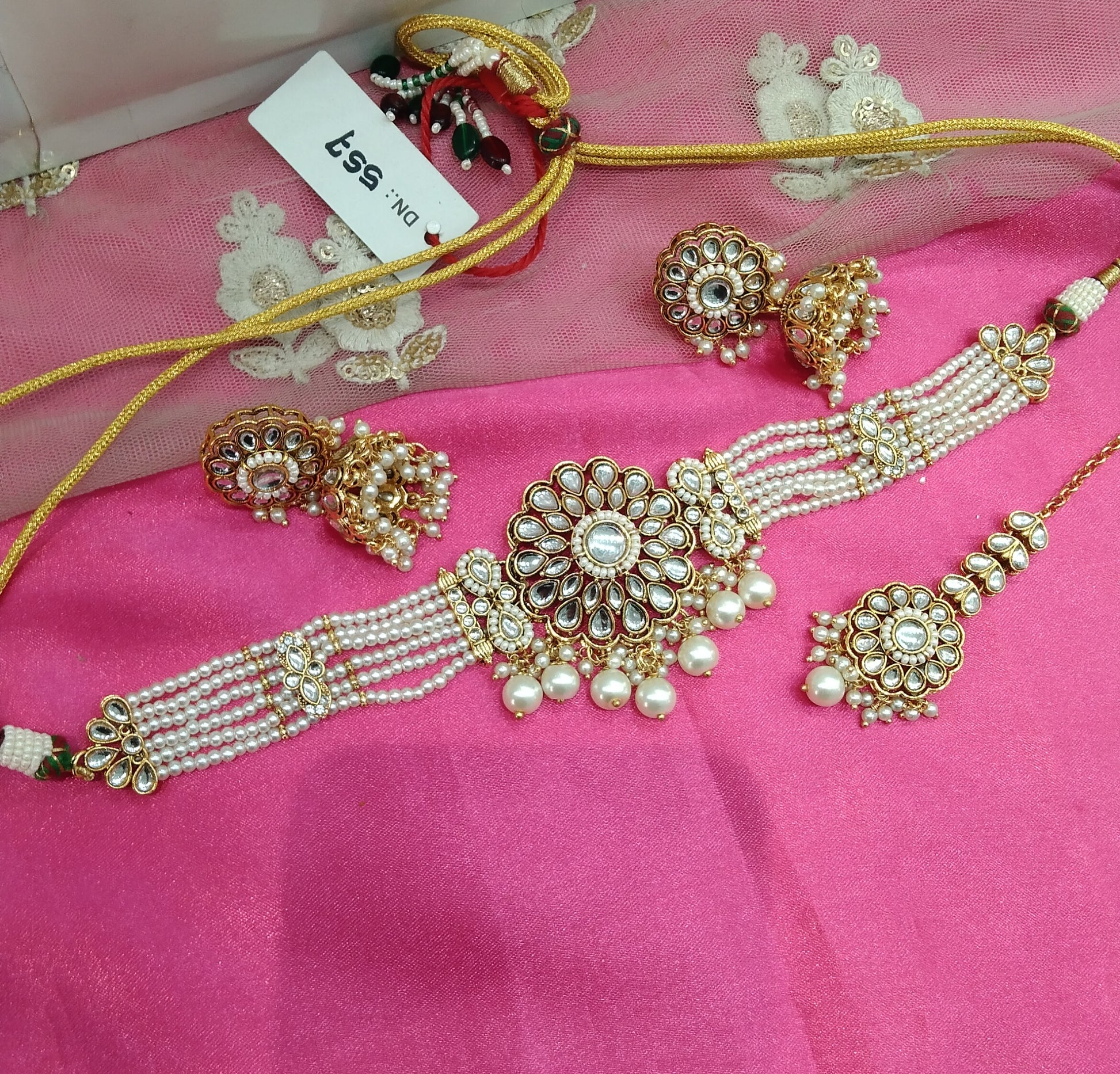 Gold White Kundan Choker Jhumka Jewellery Setin Set