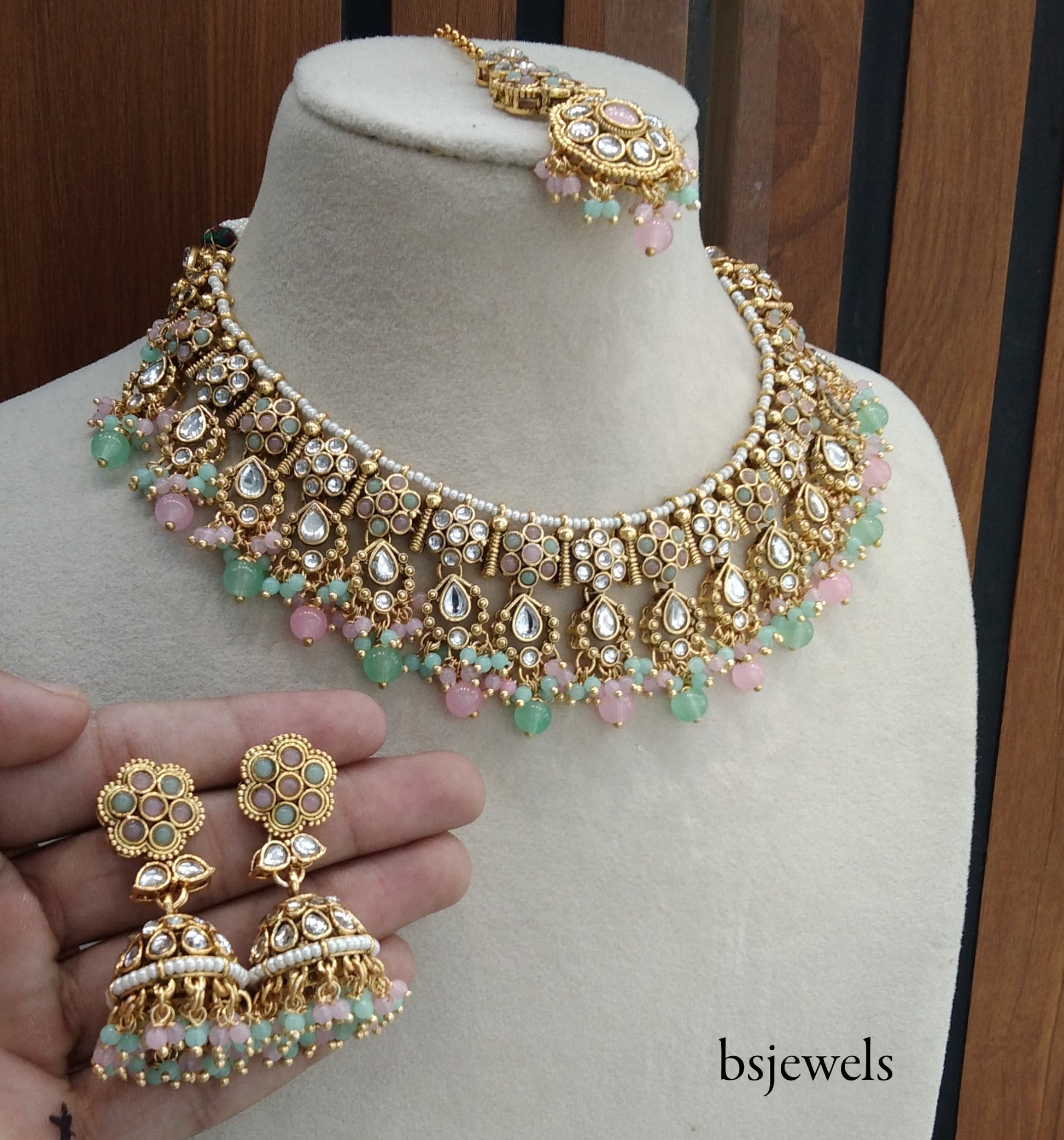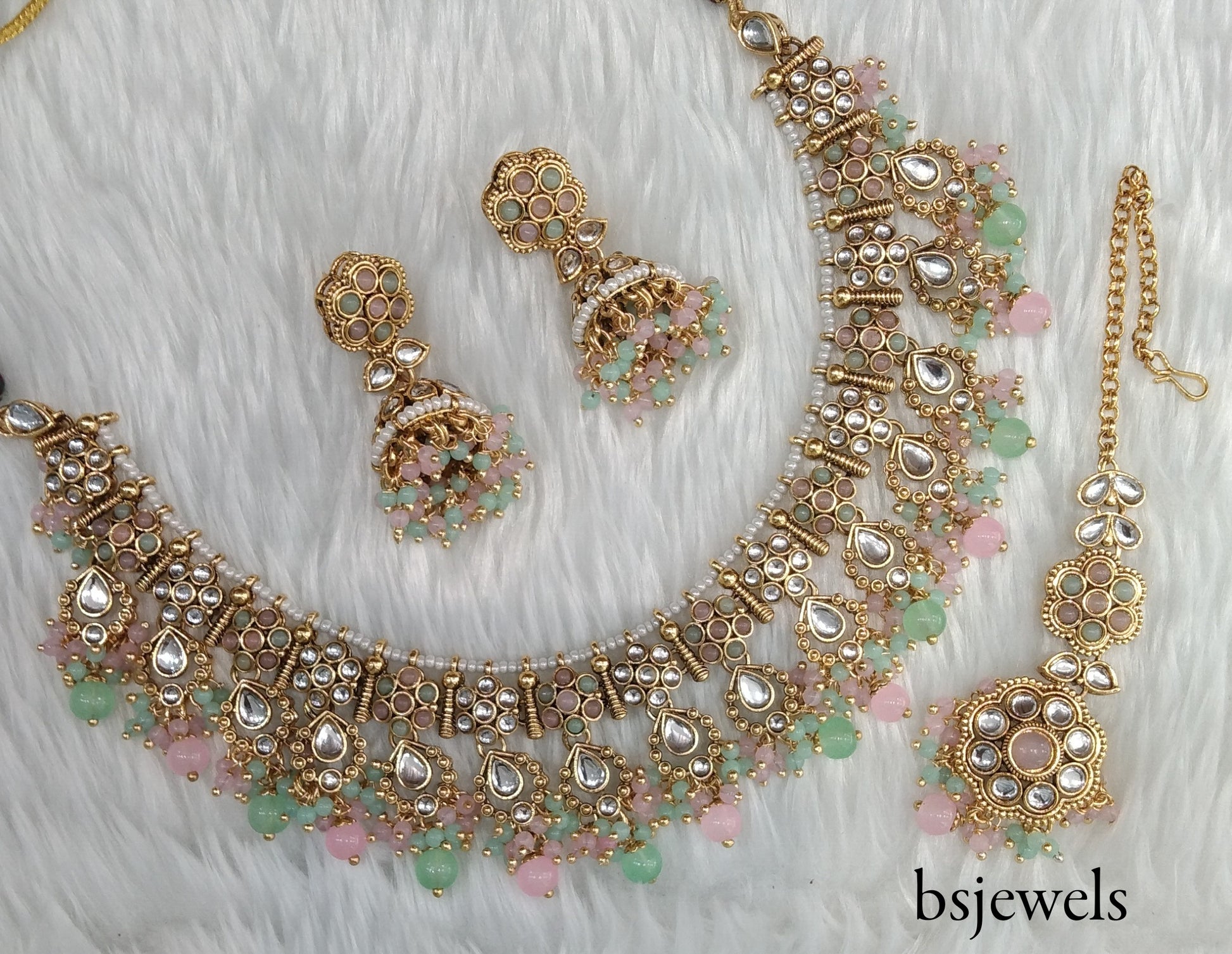 Mint Pink Kundan Necklace Jewellery Amrit Set