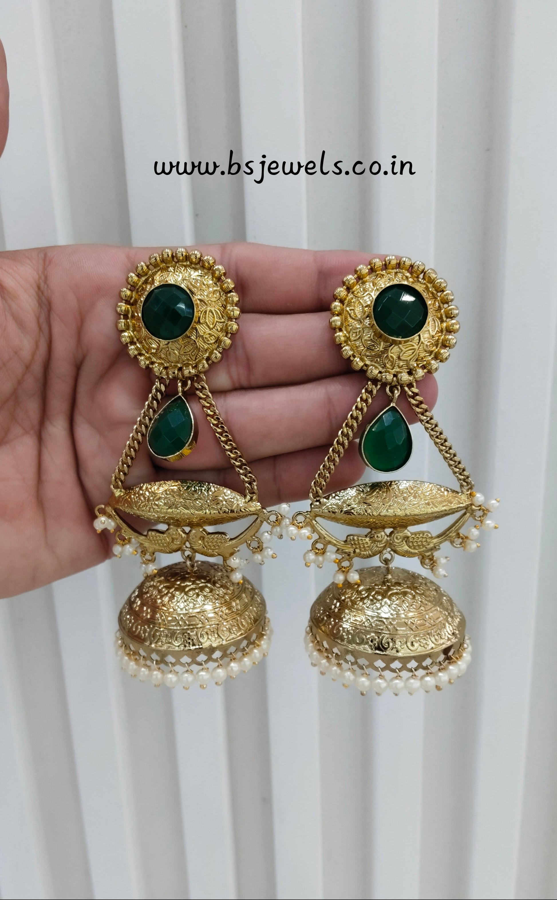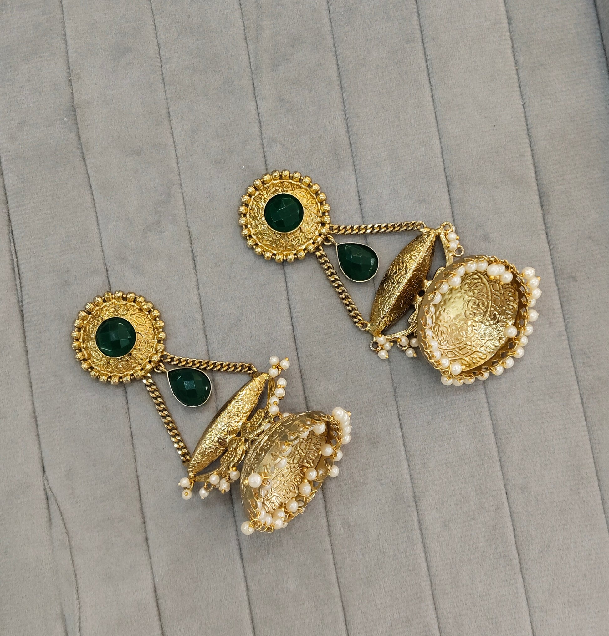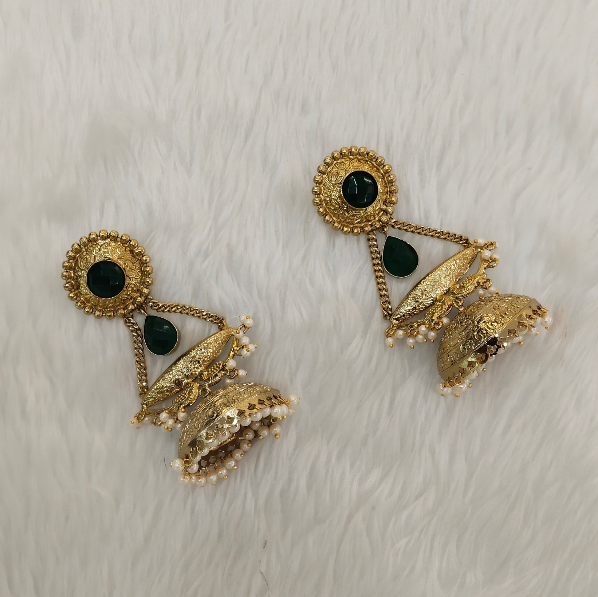 Green Antique Gold Jhumka Bollywood Keshav Earrings