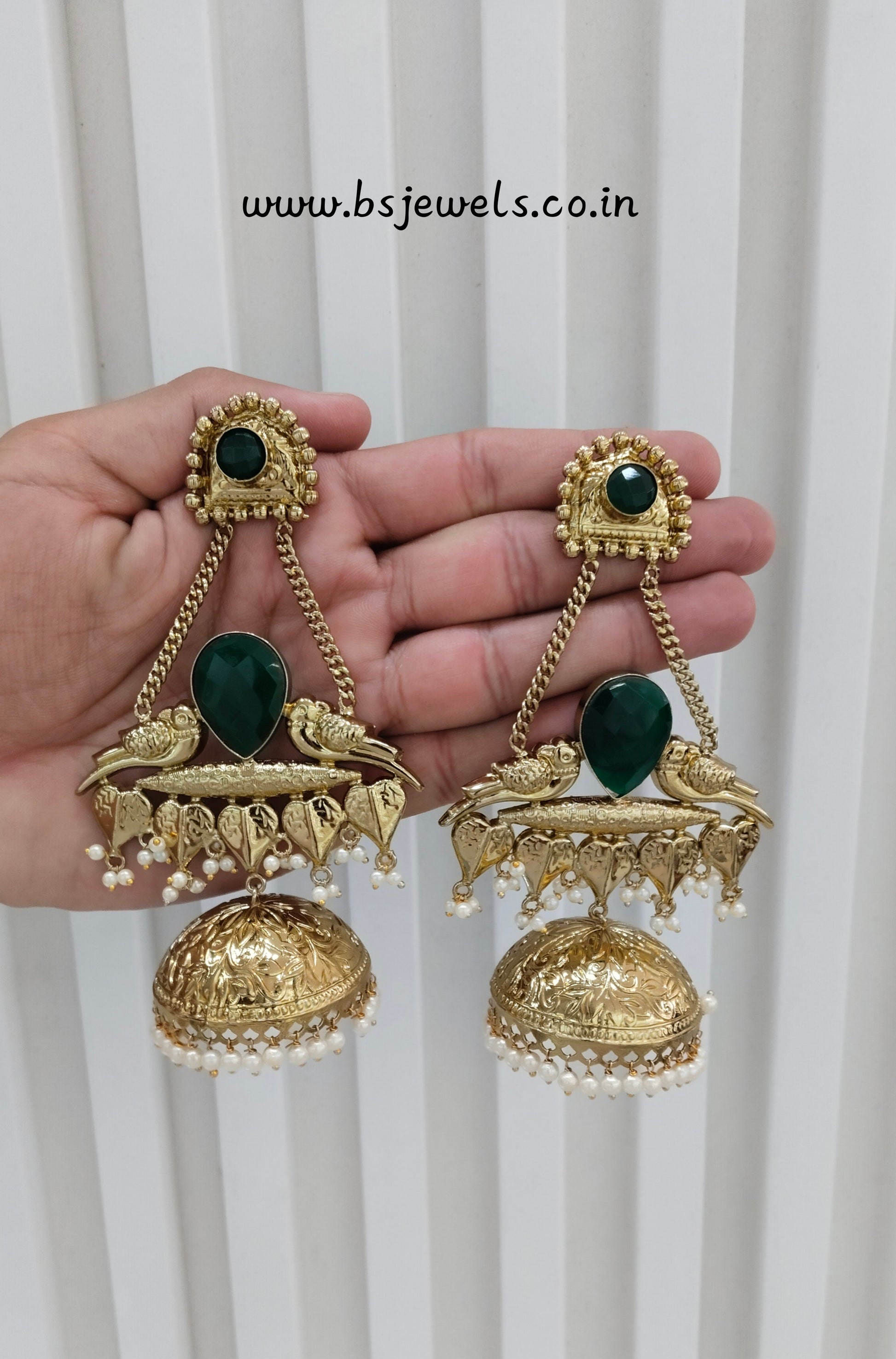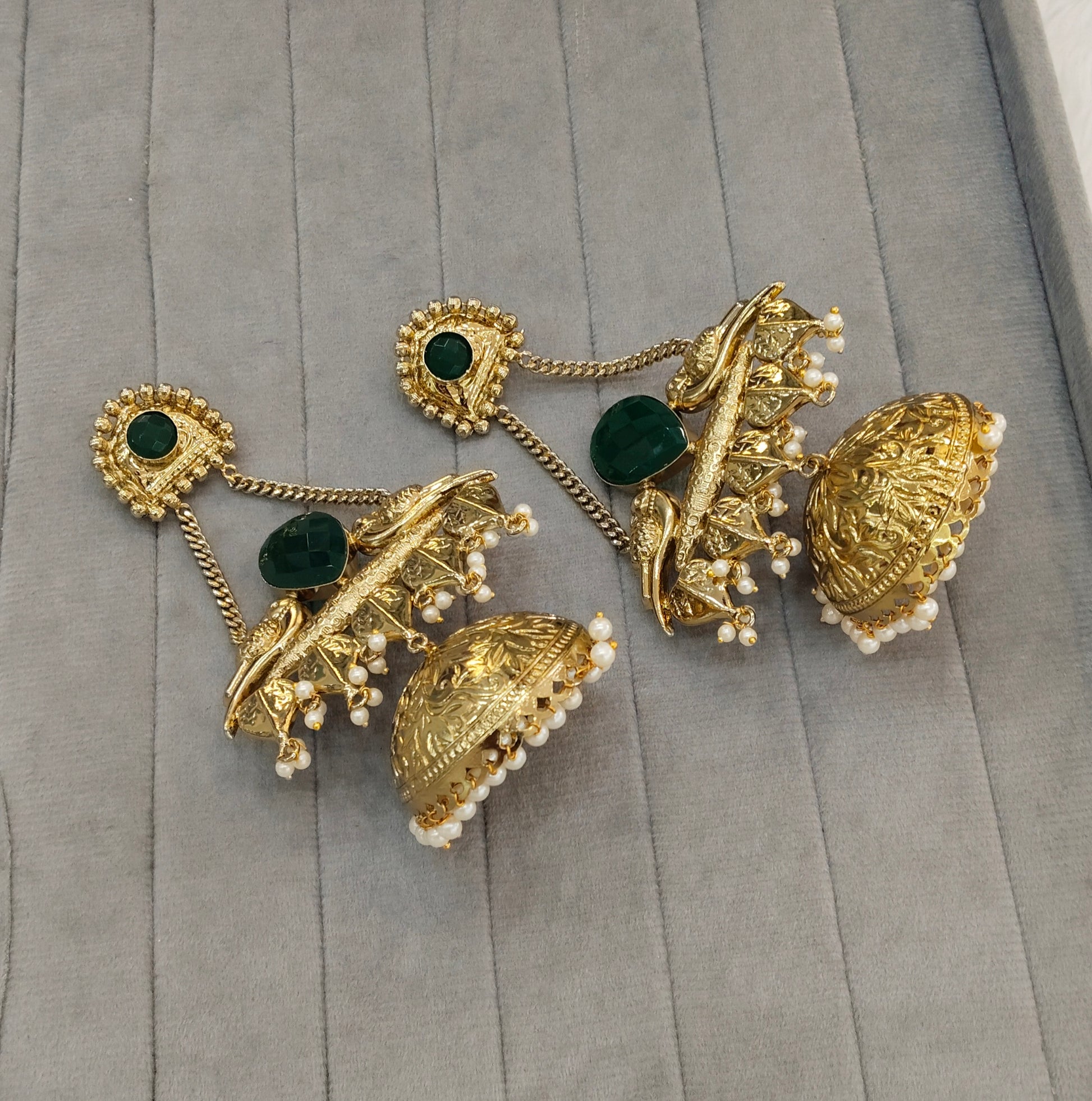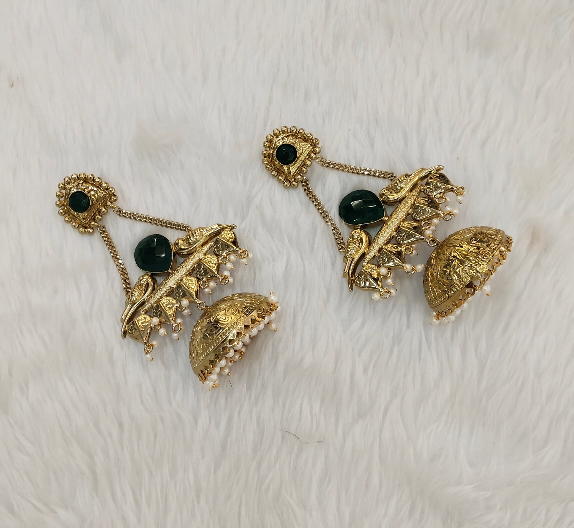 Green Antique Gold Jhumka Bollywood Keshav Earrings