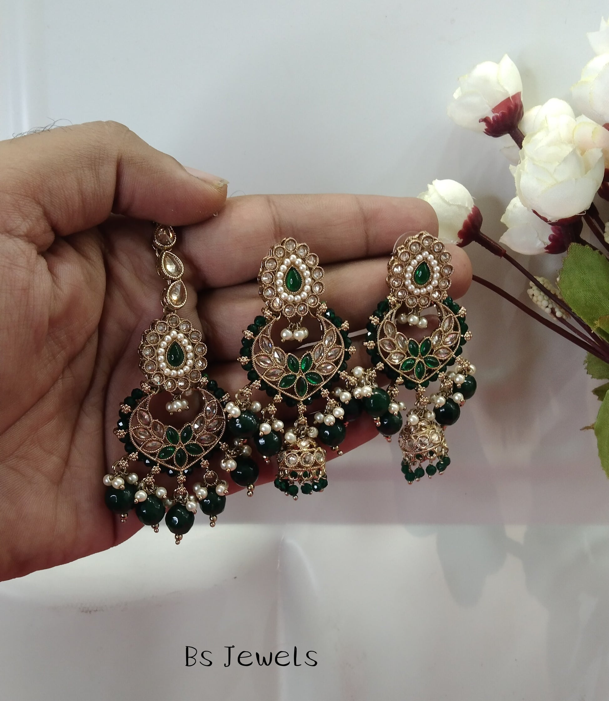 Green Champagne Gold Chandbali Jhumka Support Bollywood Earrings Tikka Set