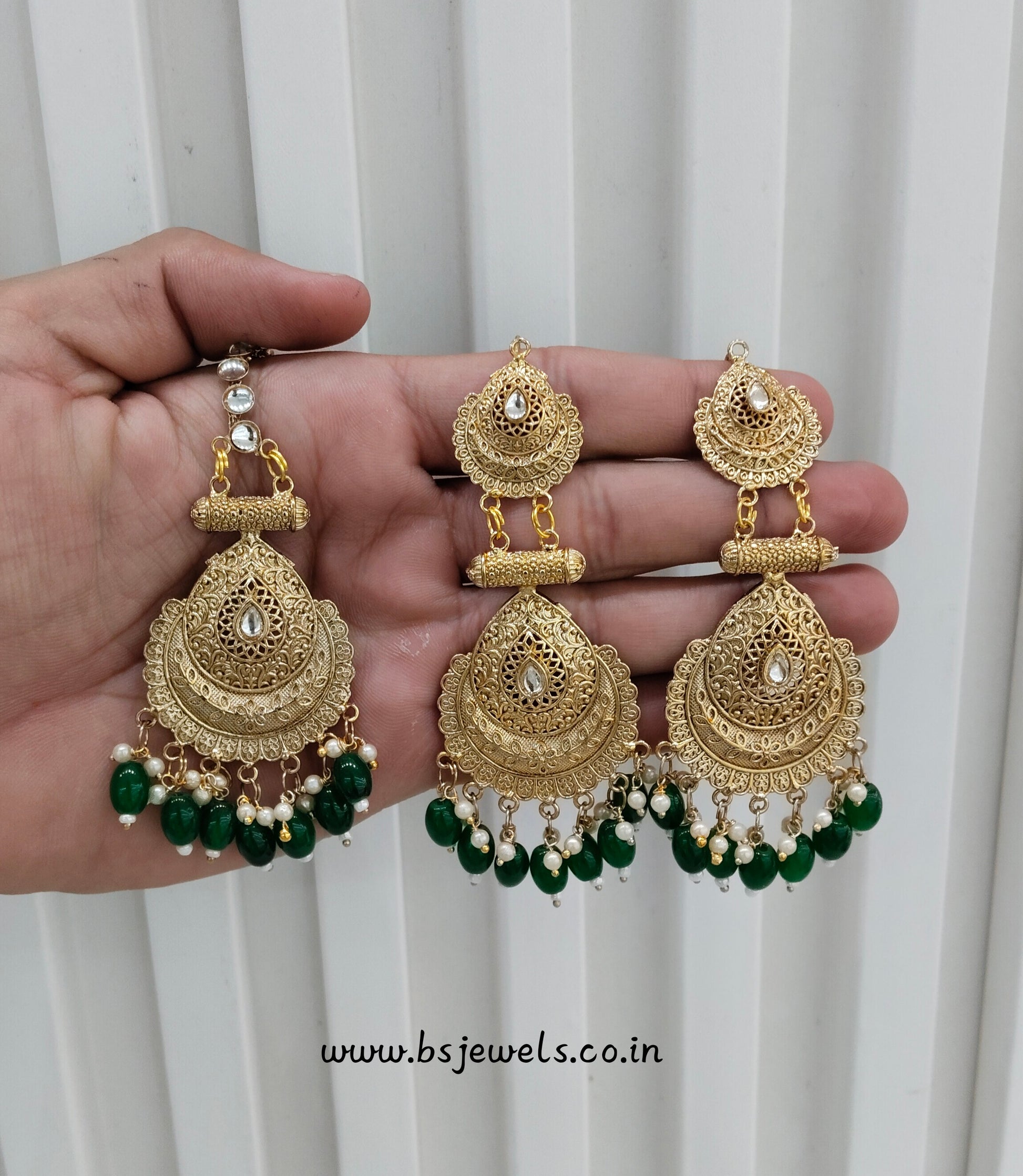Green Gold Polki Punjabi Style Earrings and Tikka