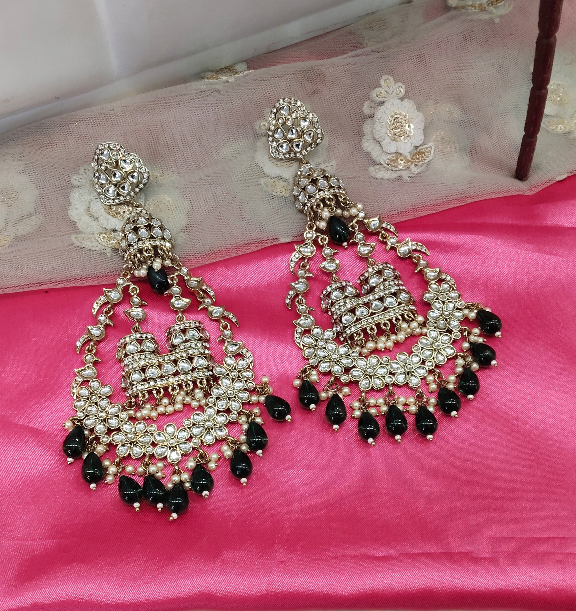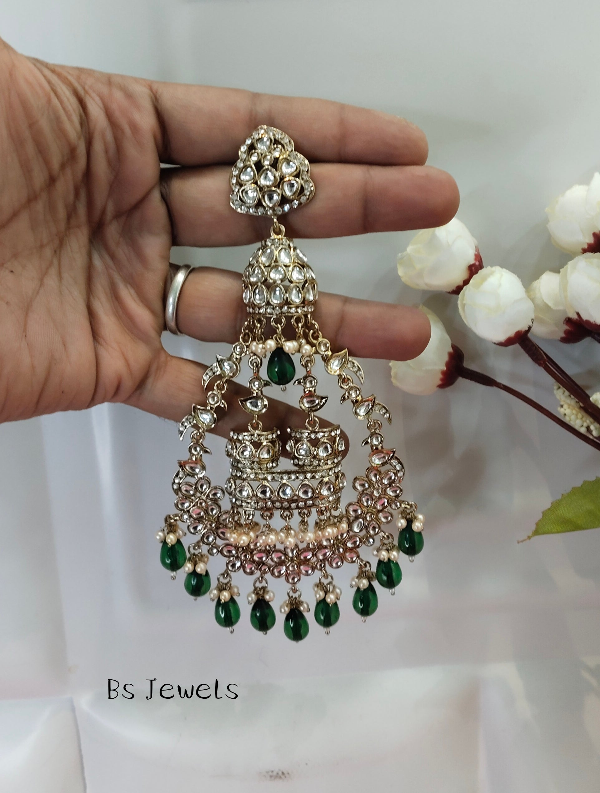 Green Kundan ChandBali Staff Bollywood Long Earrings