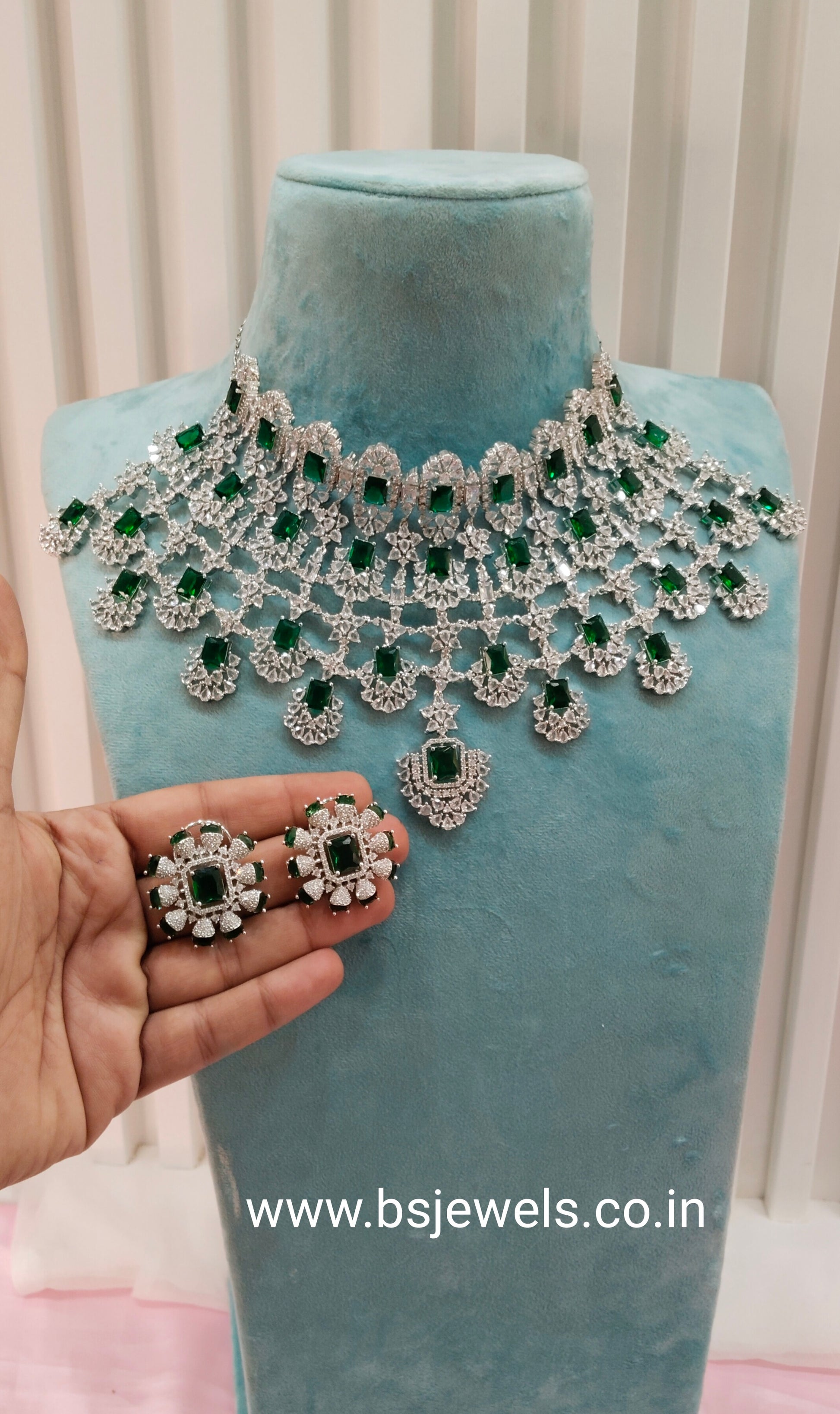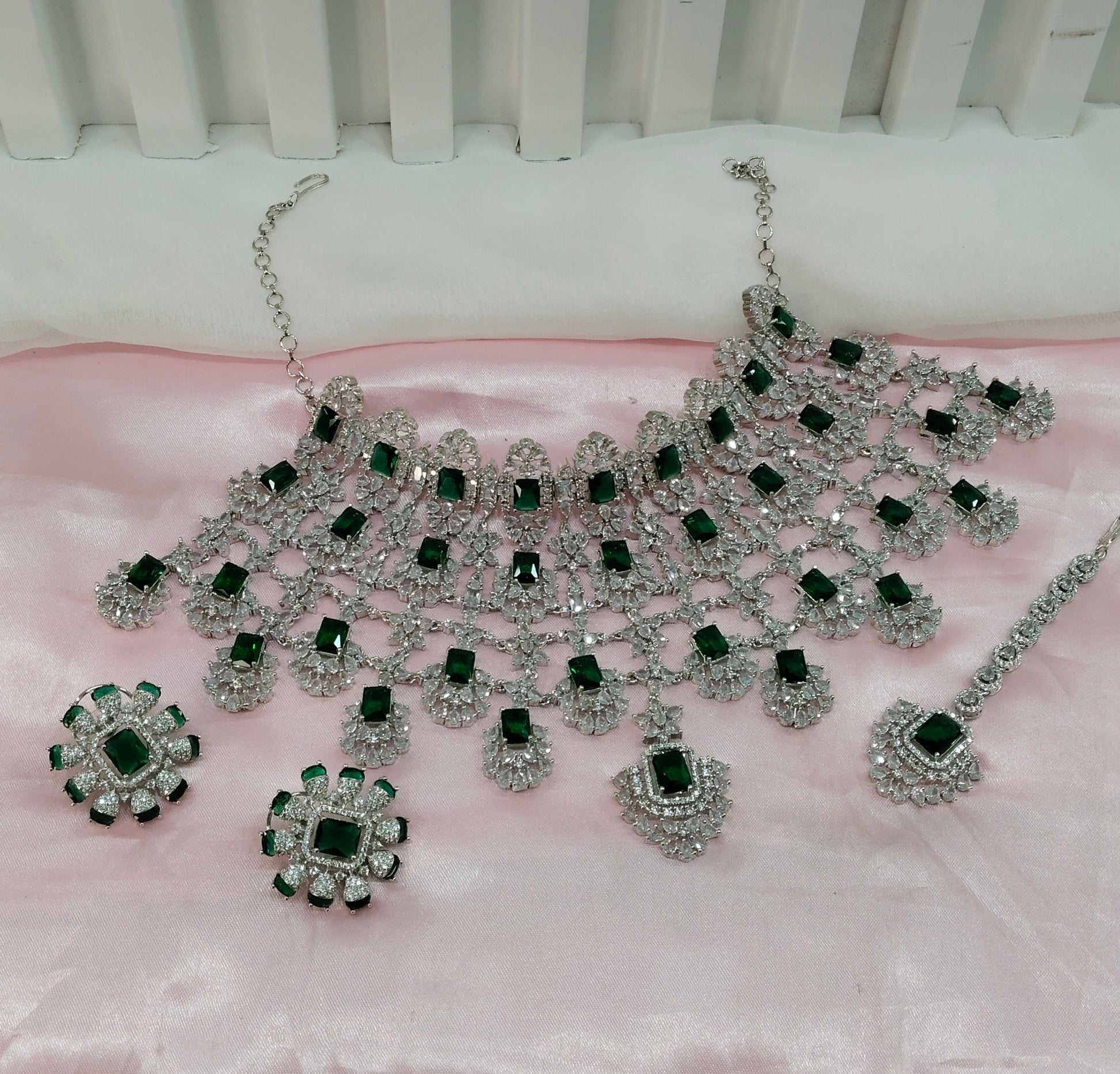Green Silver CZ Bridal Necklace Choker Jewellery Kiara Set