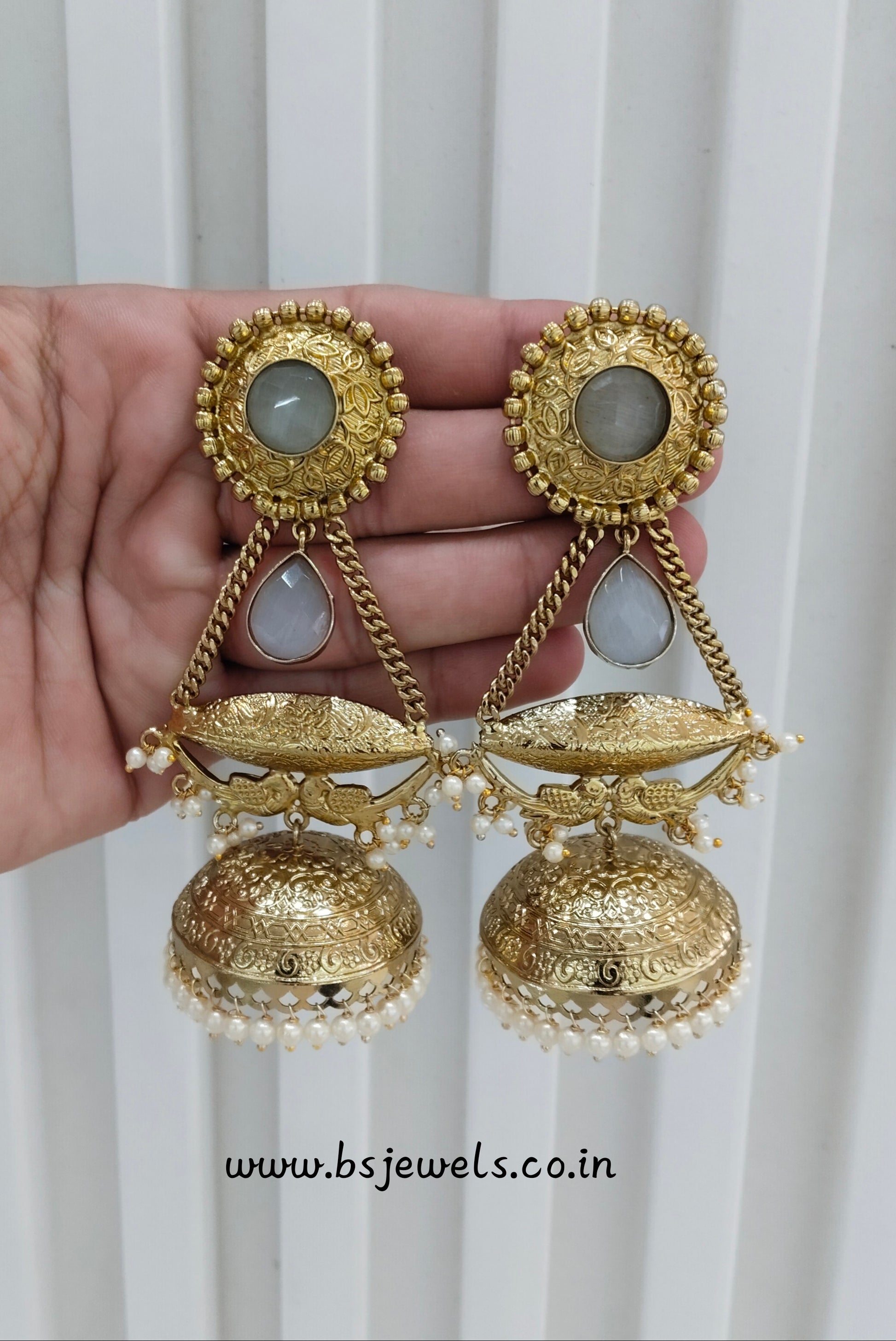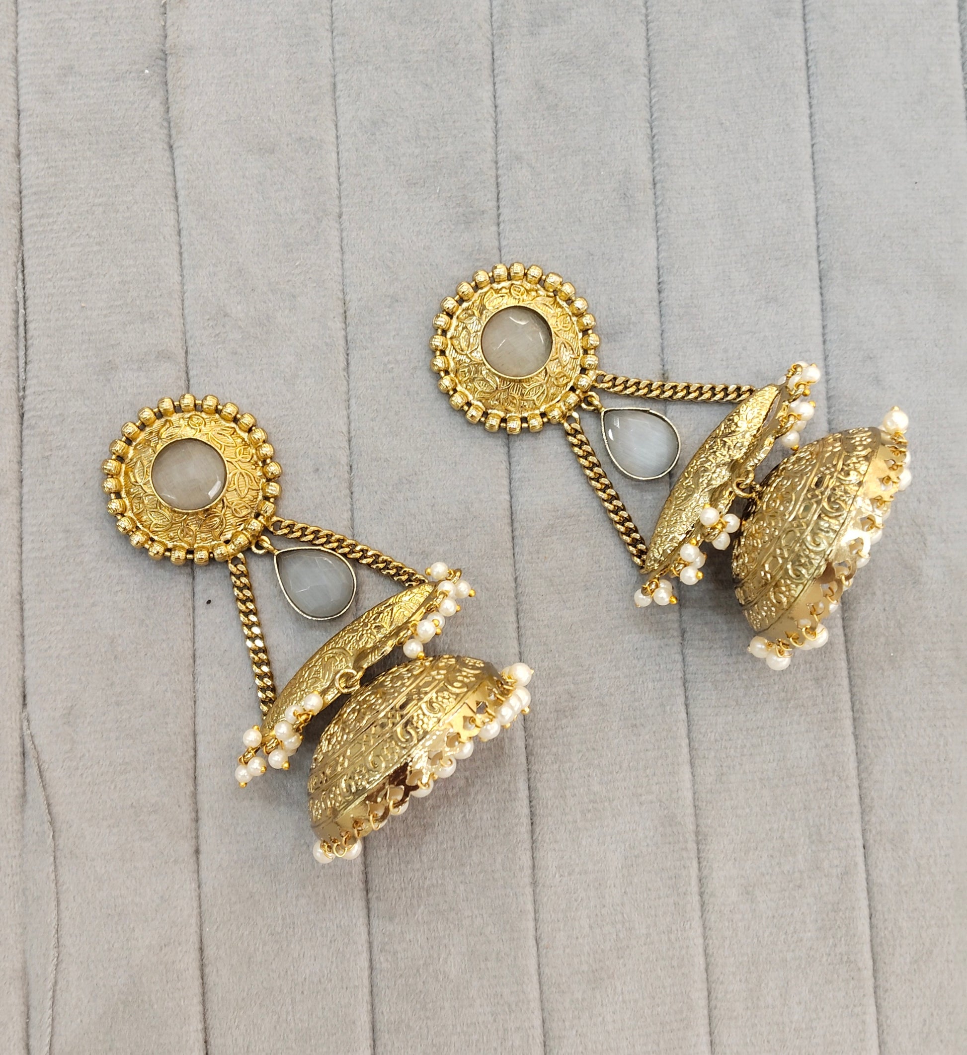 Grey Antique Gold Jhumka Bollywood Keshav Earrings