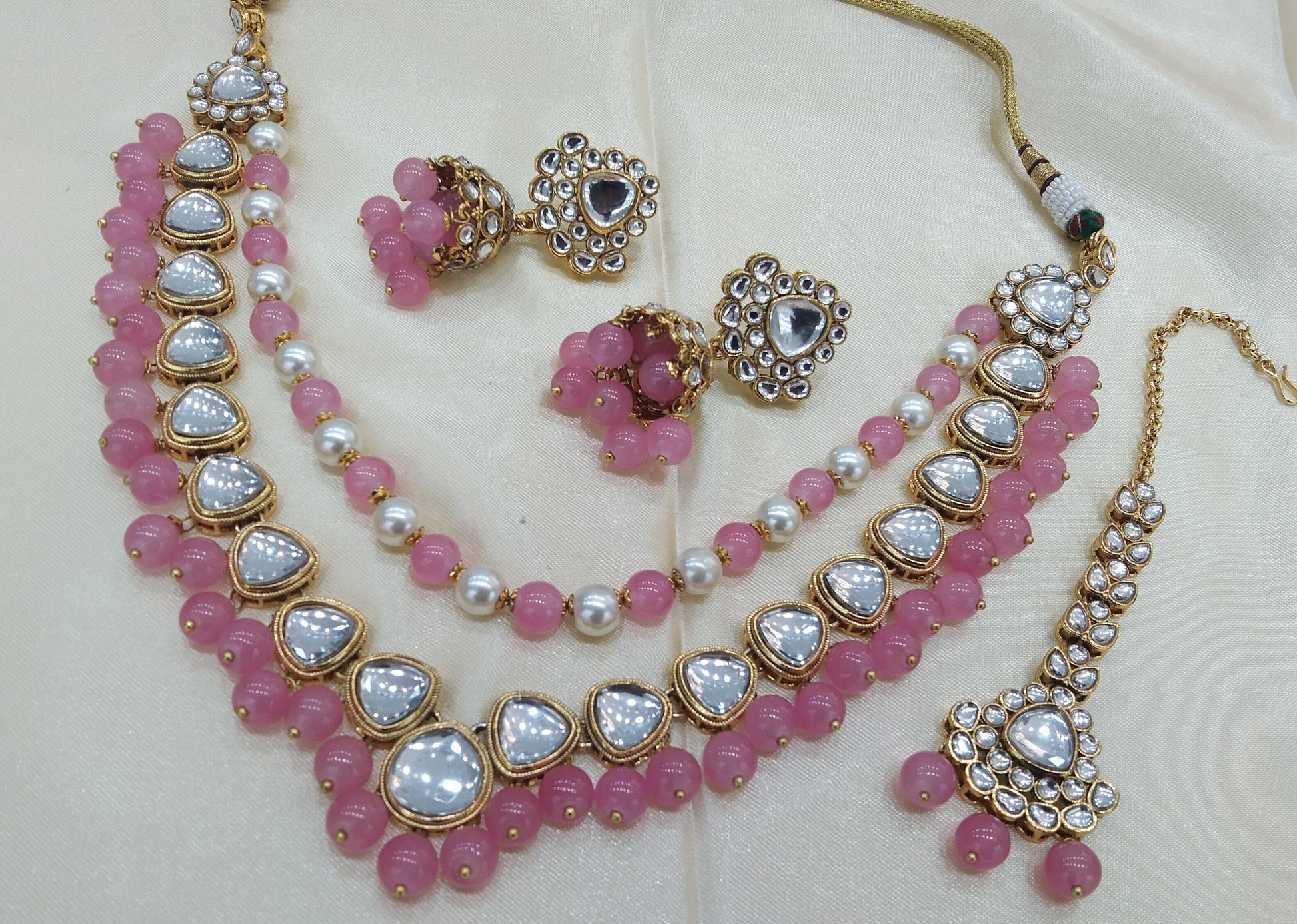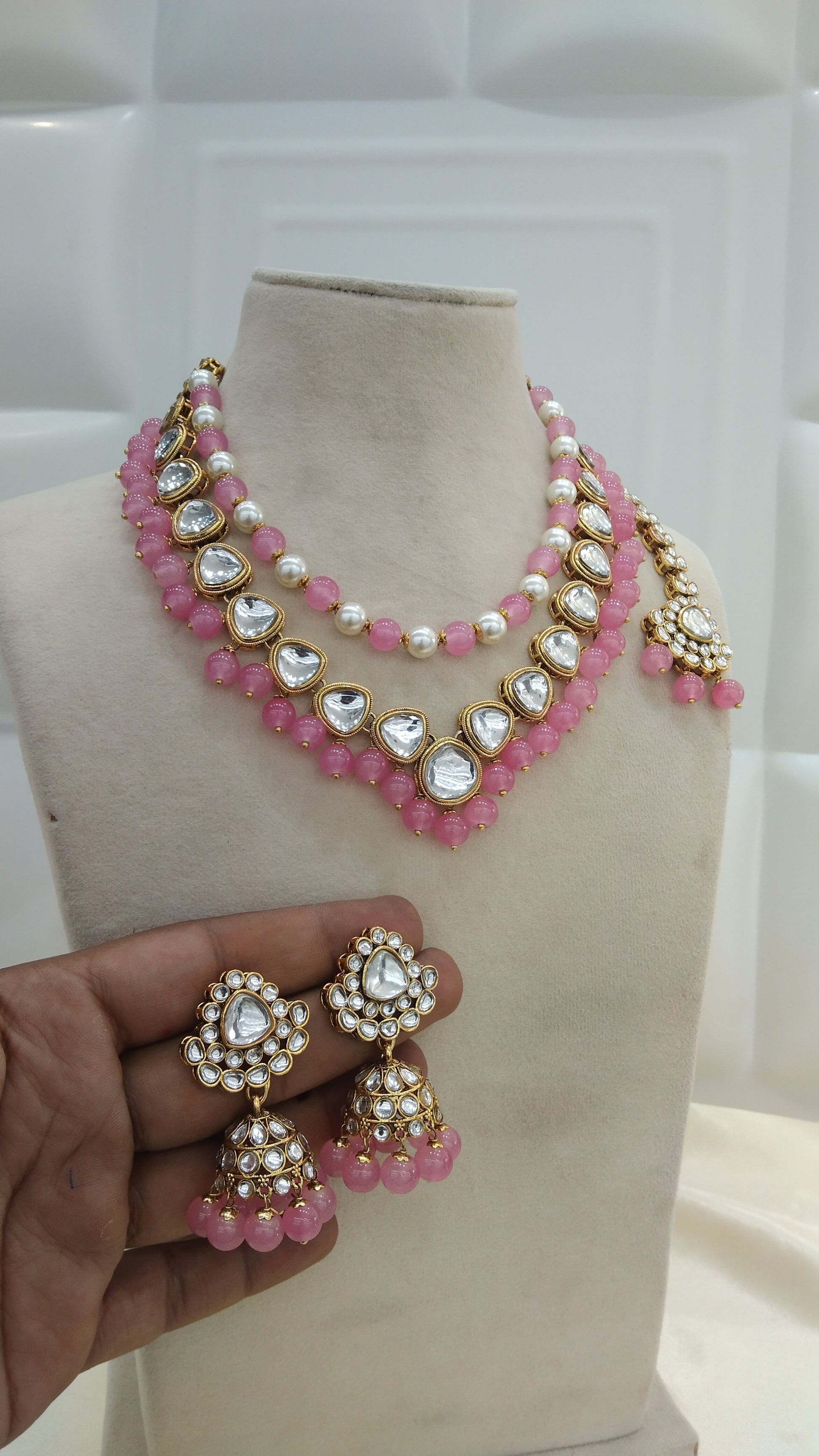 Hanisha Pink kundan Indian Necklace Layerd Jewellery Set