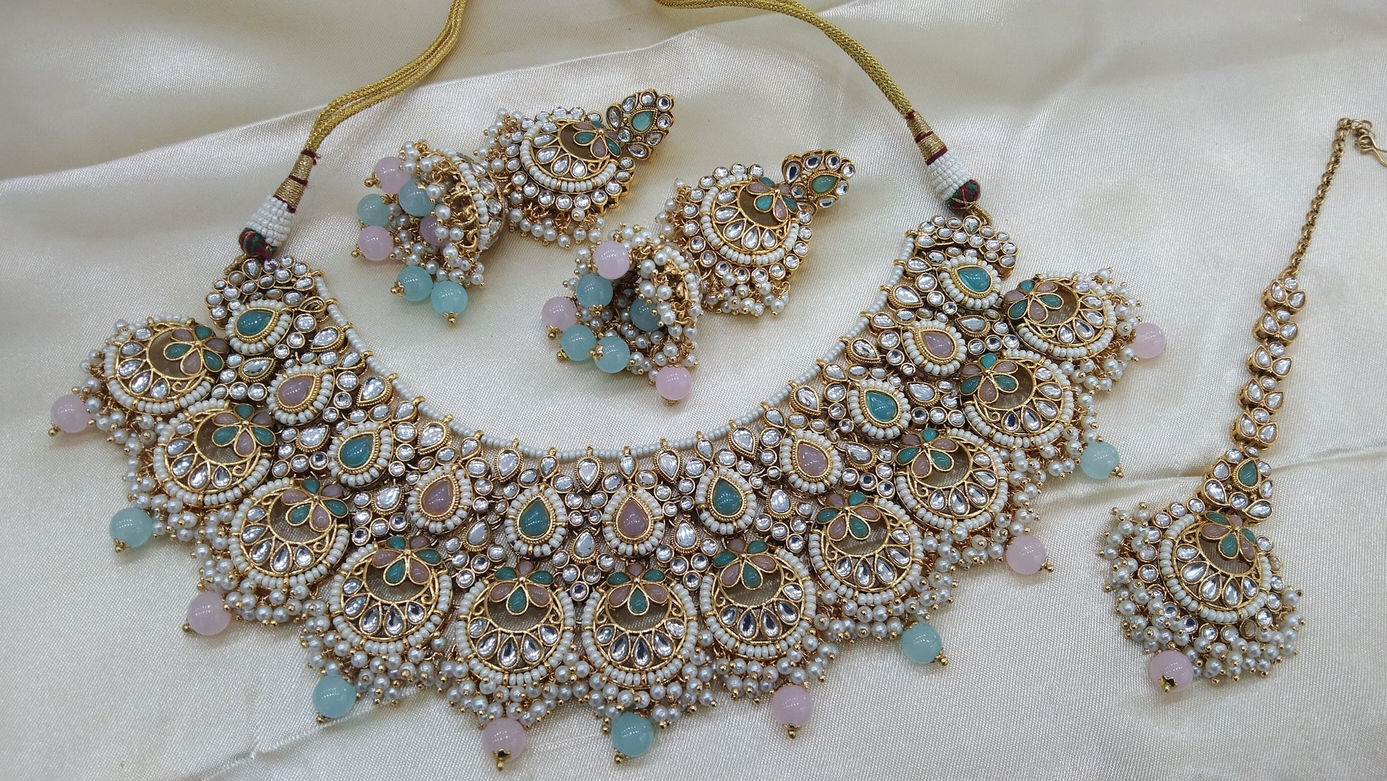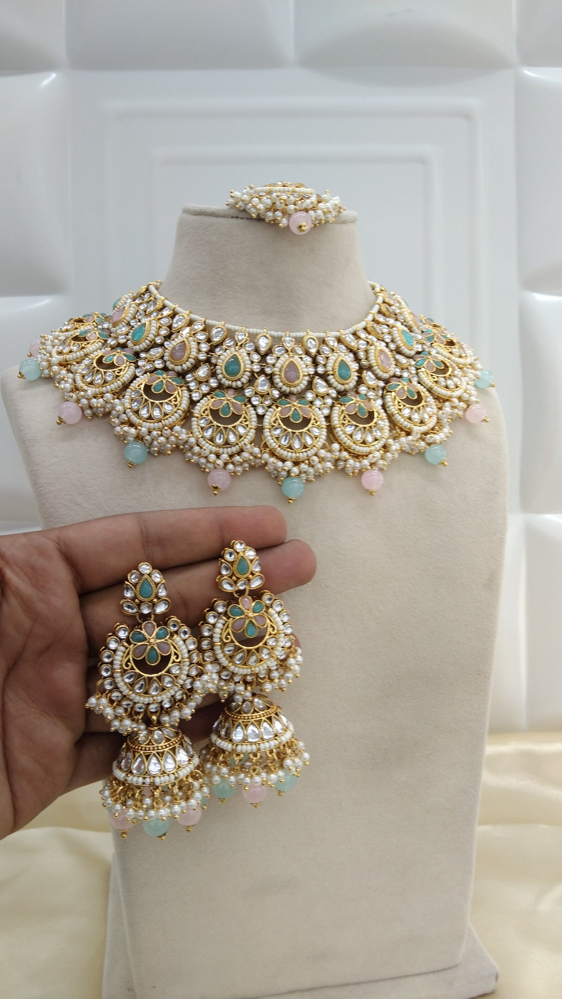 Harpreet Sky blue Pink kundan Indian Necklace Jewellery Set