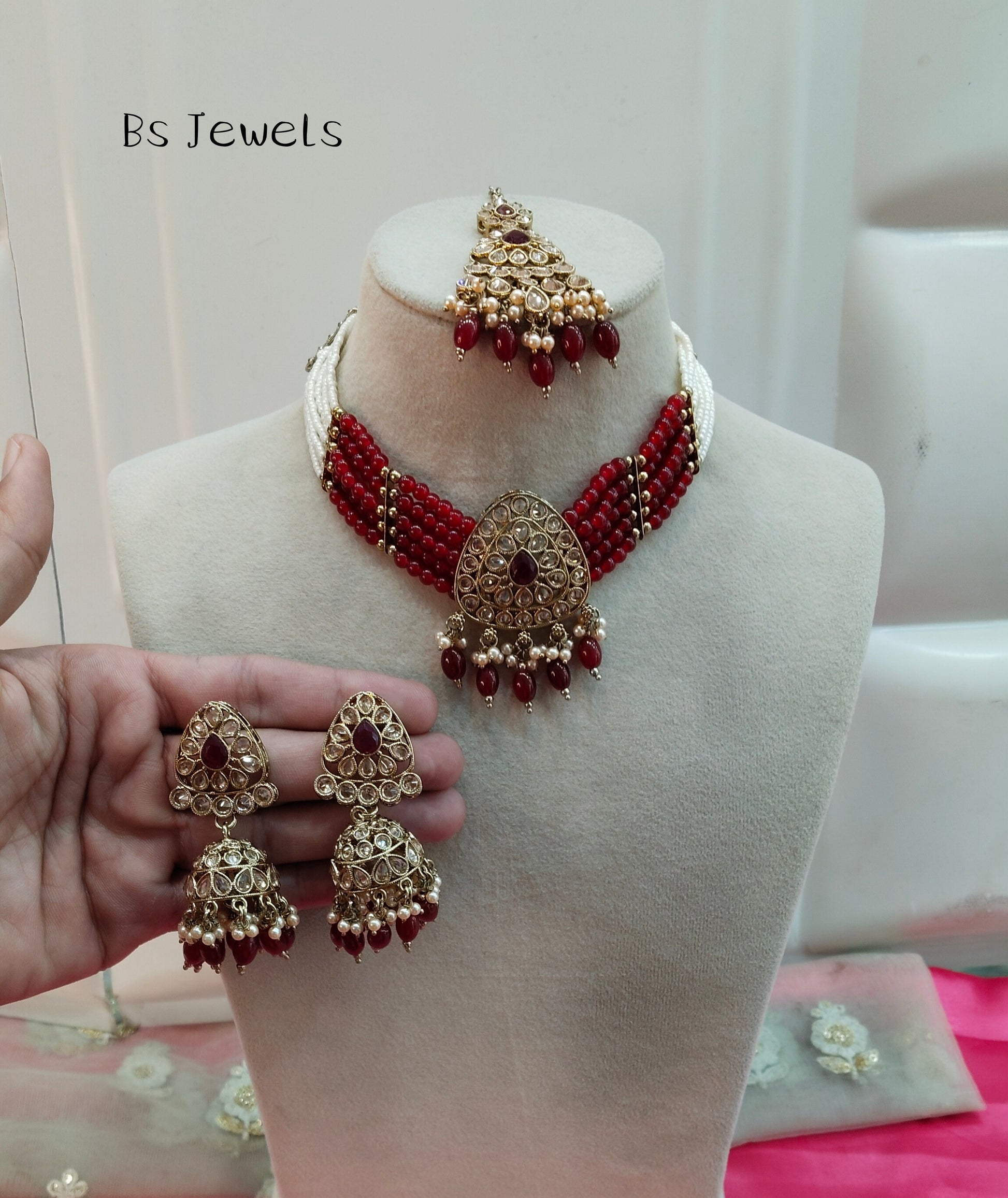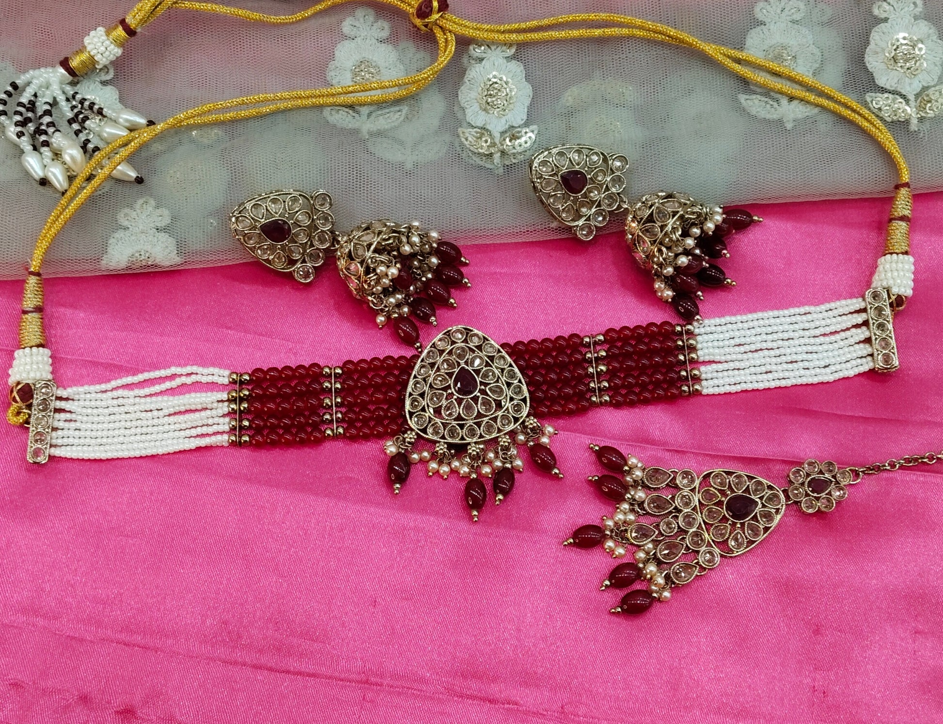 Maroon Champagne Stone Jhumka Choker Jewellery Rasha Set