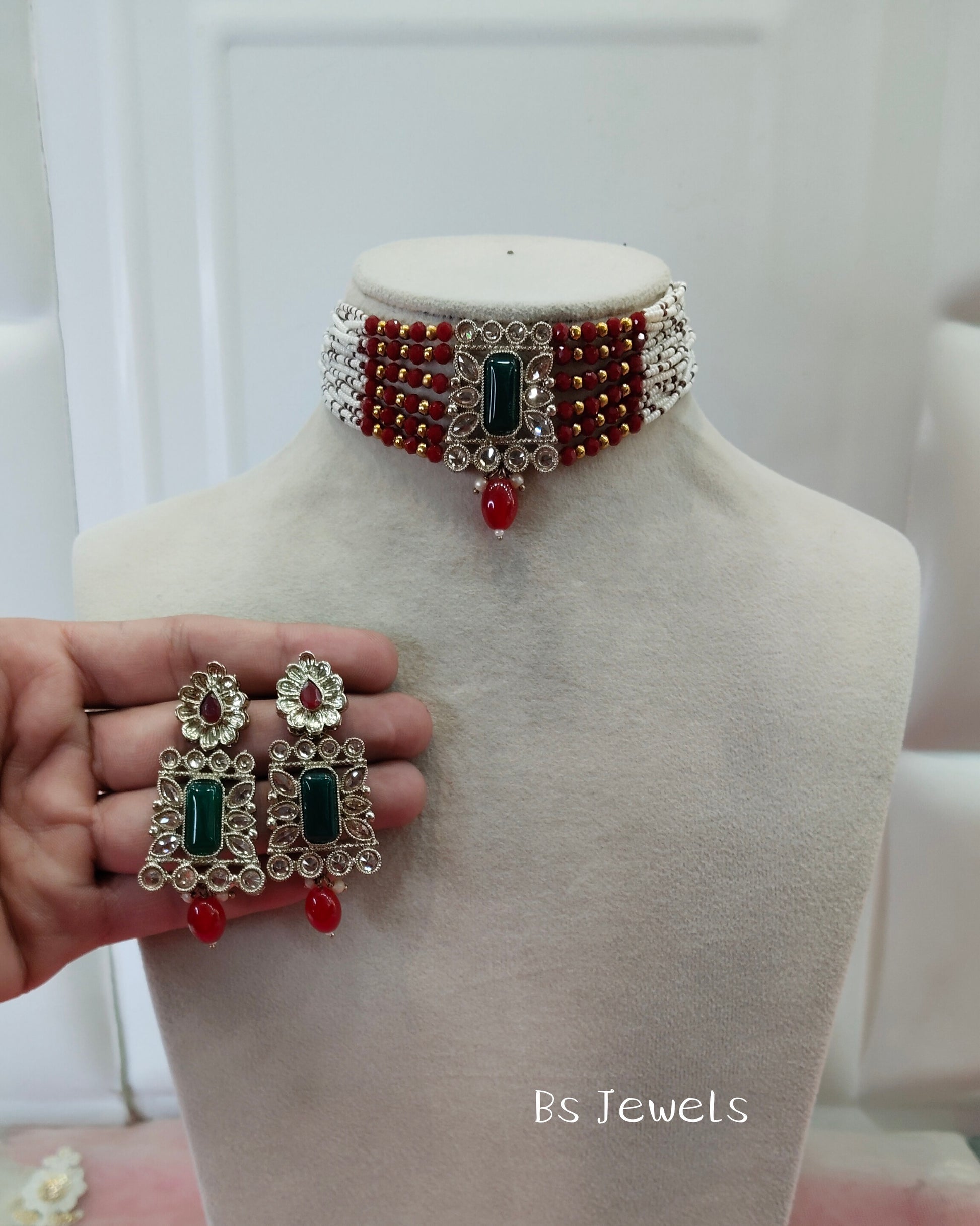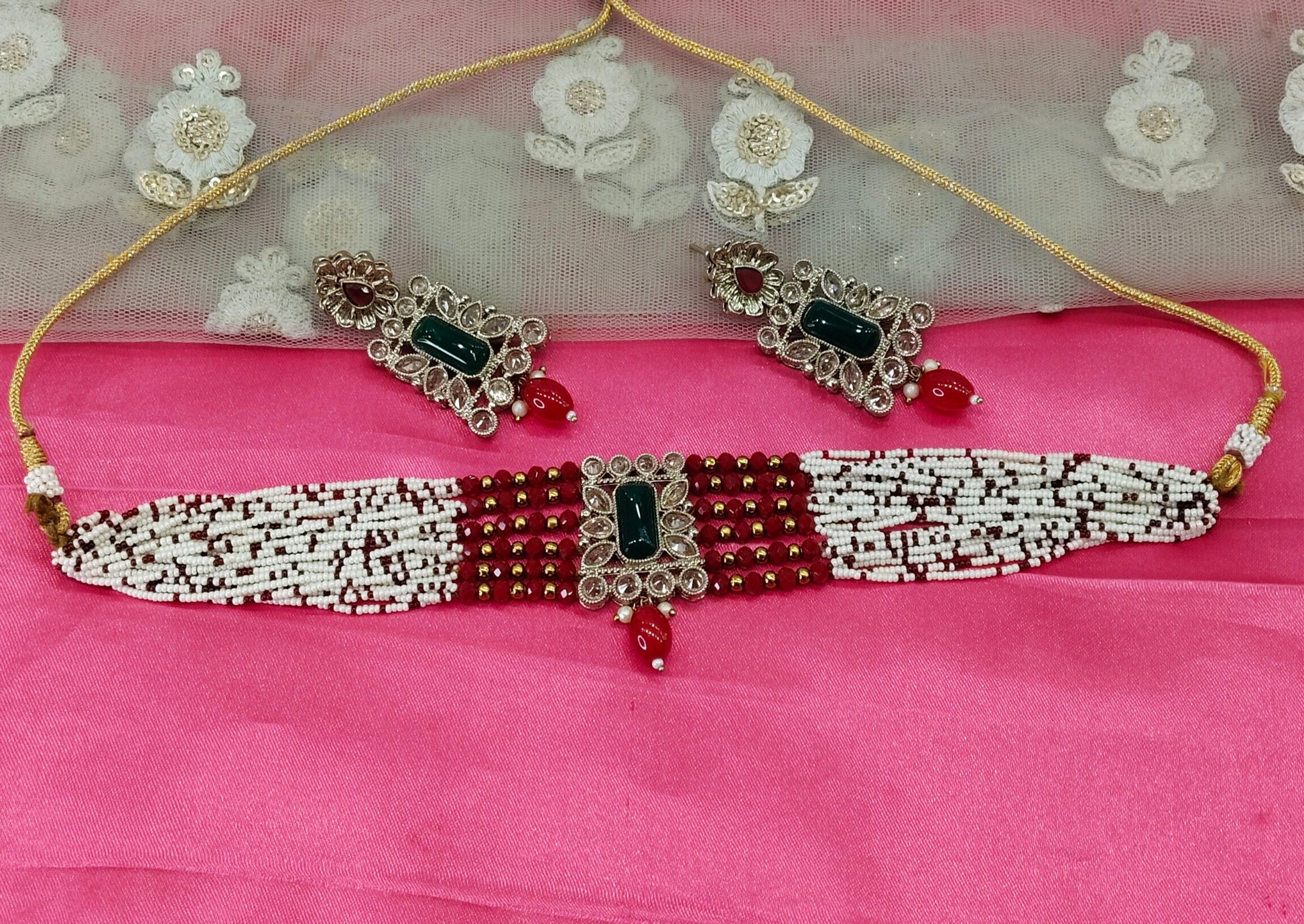 Maroon Green Champagne Stone Choker Jewellery Narayan Set