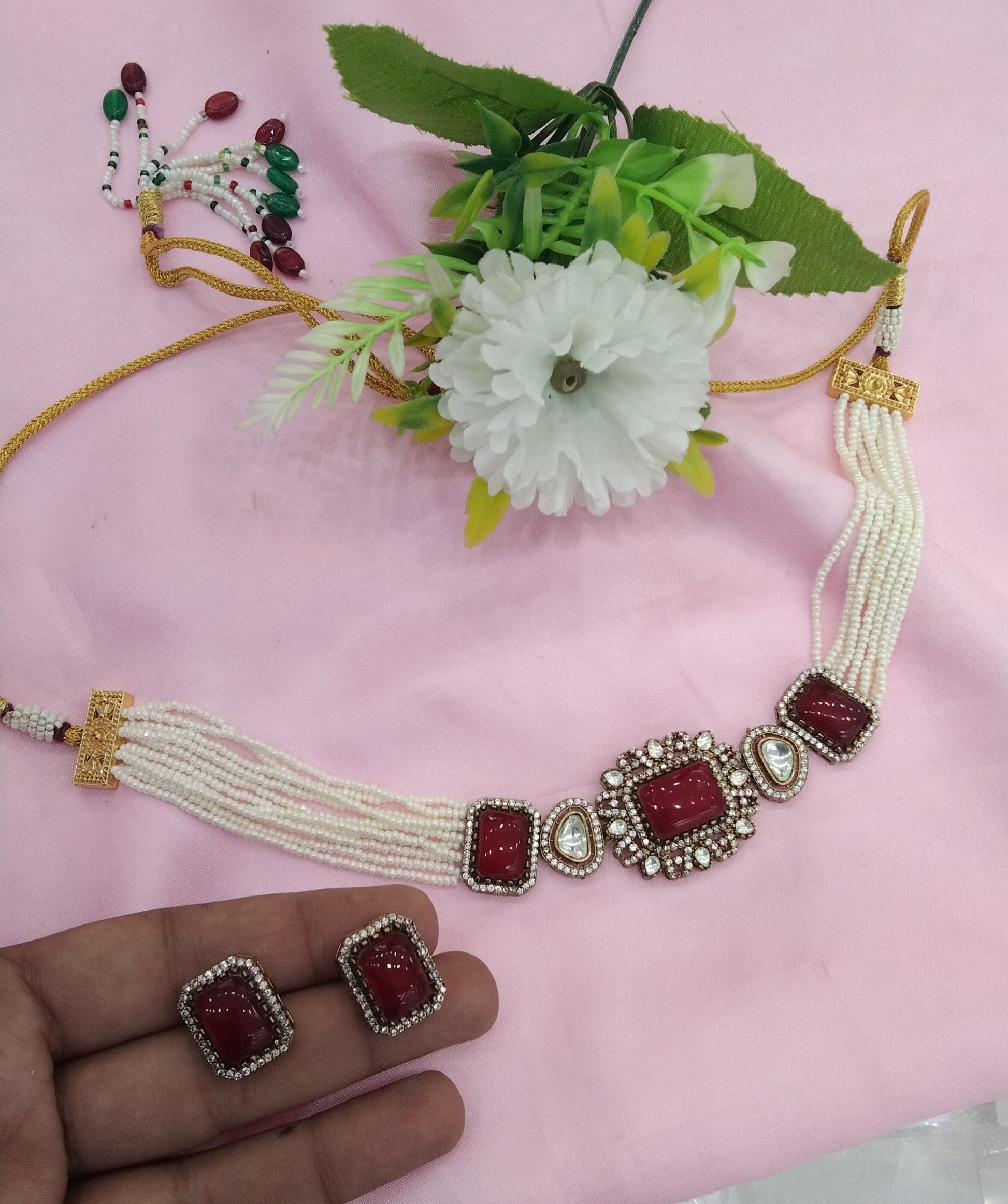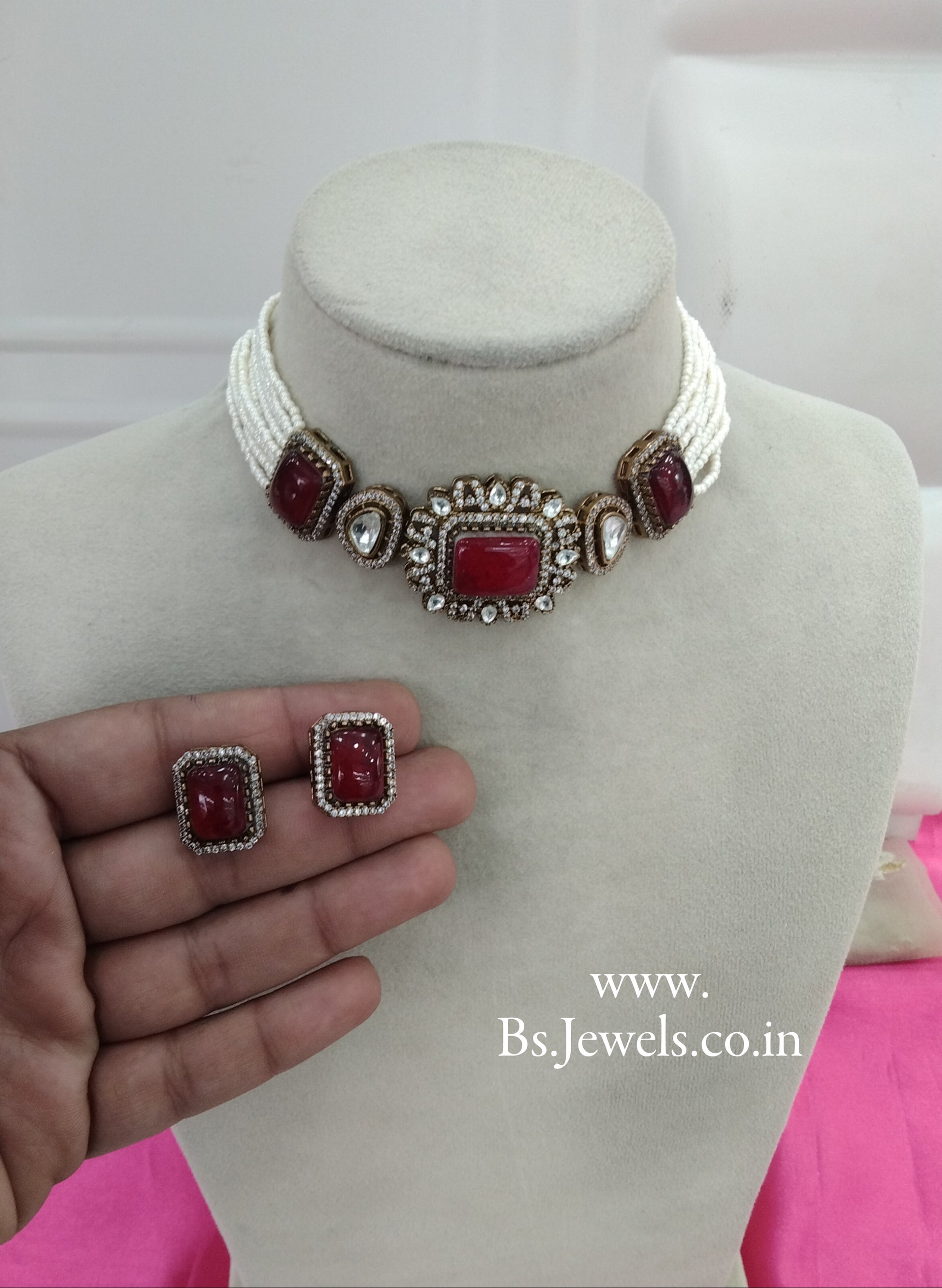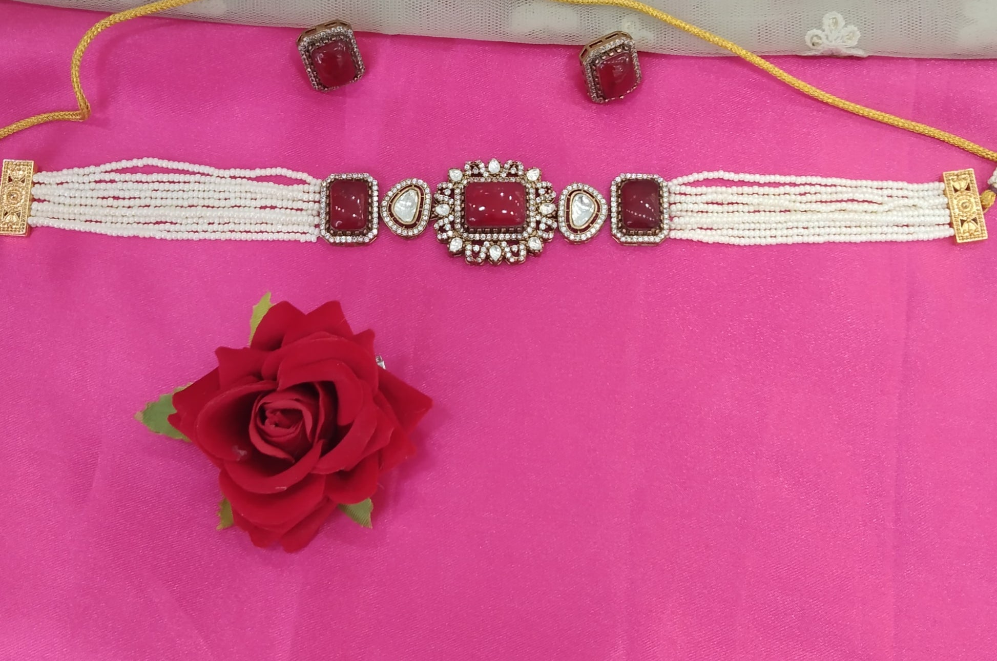 Maroon Moissanite Kundan Victorian Choker Jewellery Sunita Set