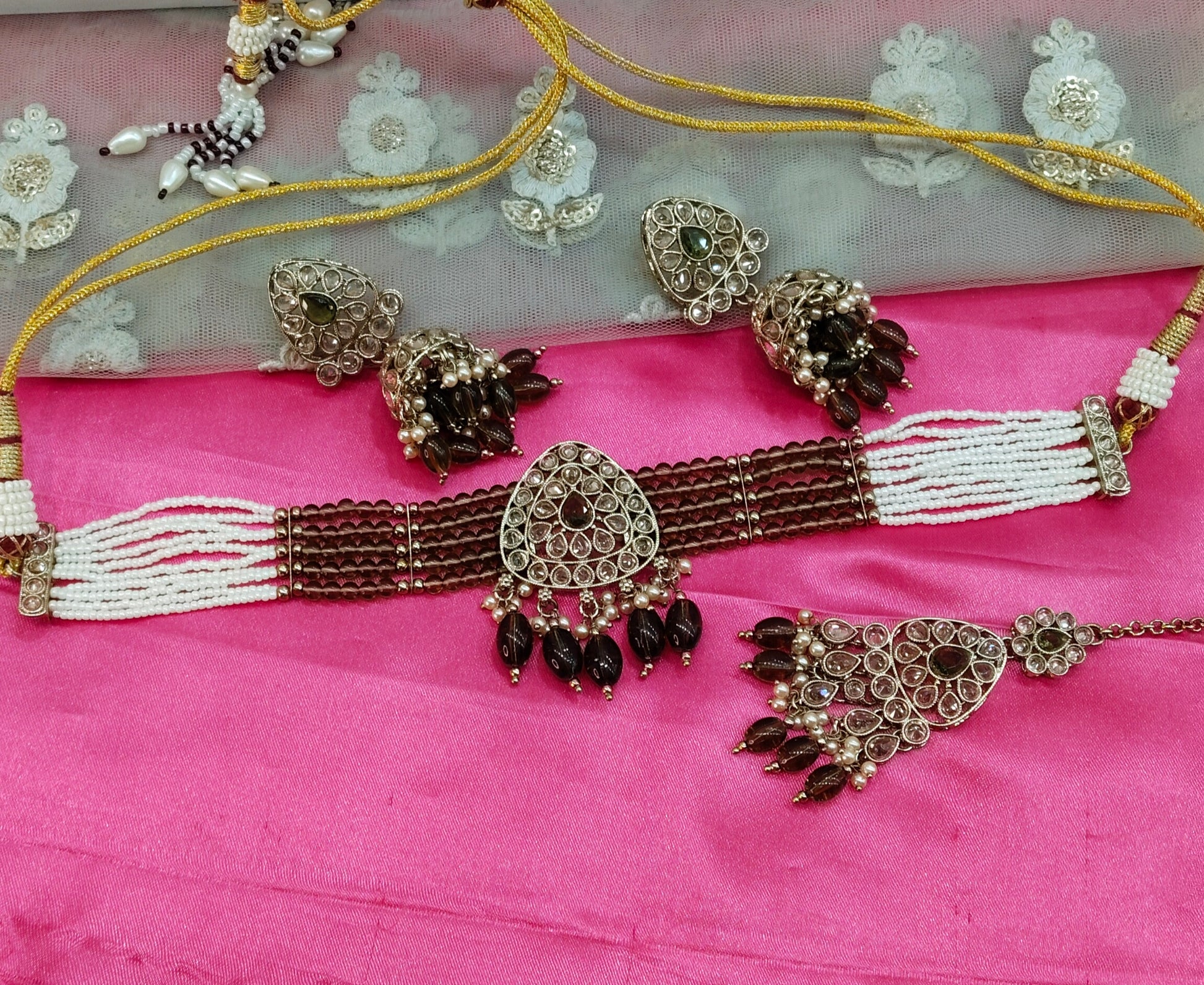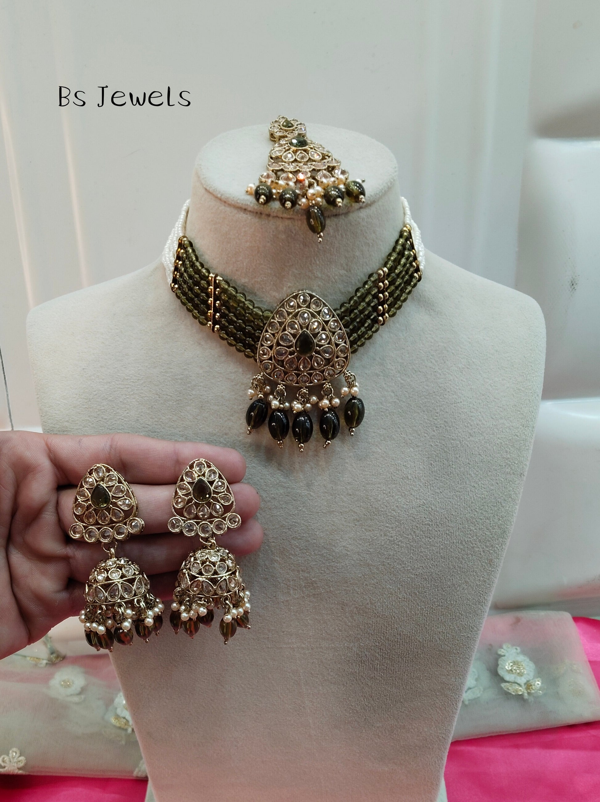 Mehndi Champagne Stone Jhumka Choker Jewellery Rasha Set