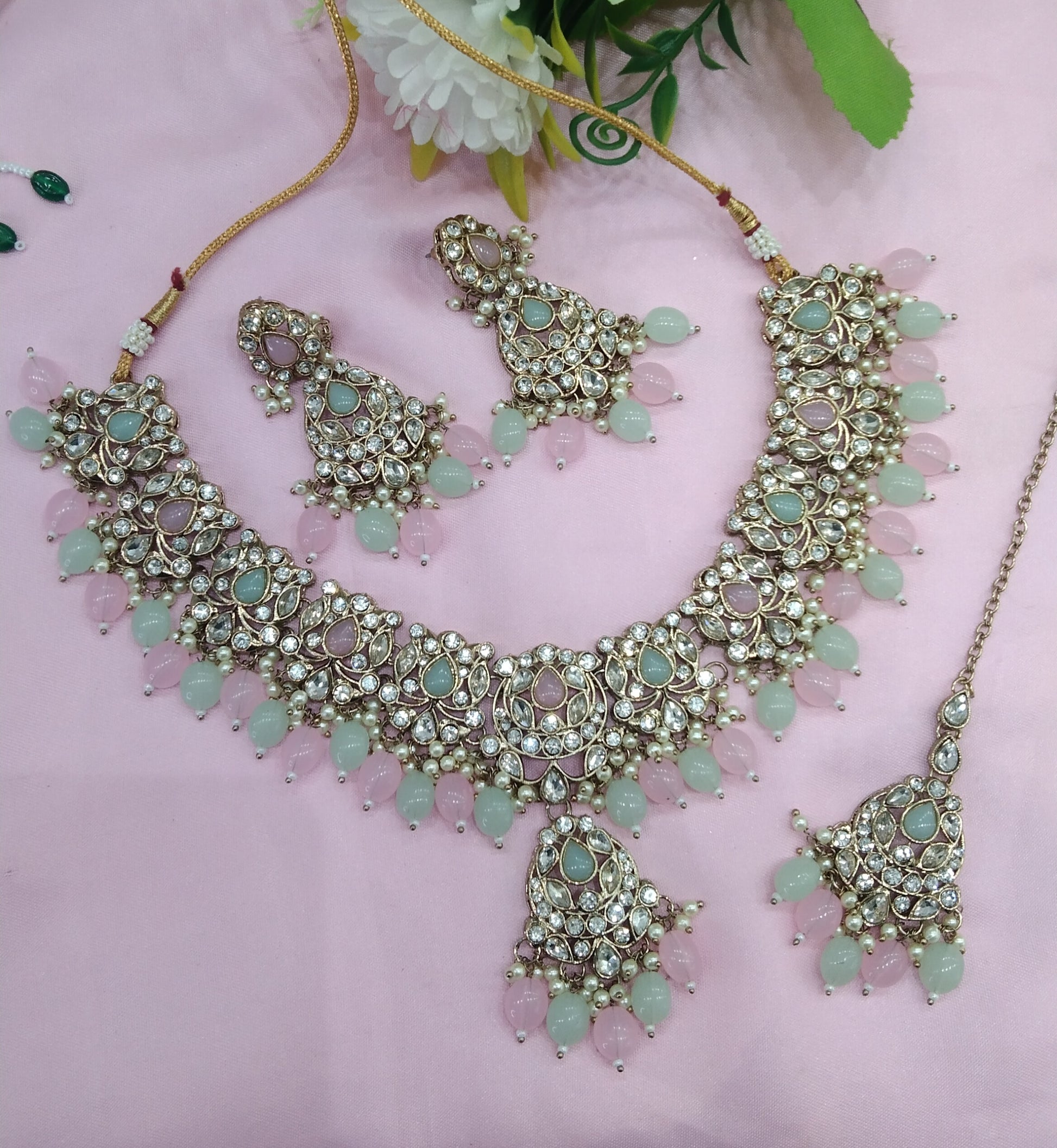 Mint Pink Antique Gold Necklace Jewellery Fjay Set