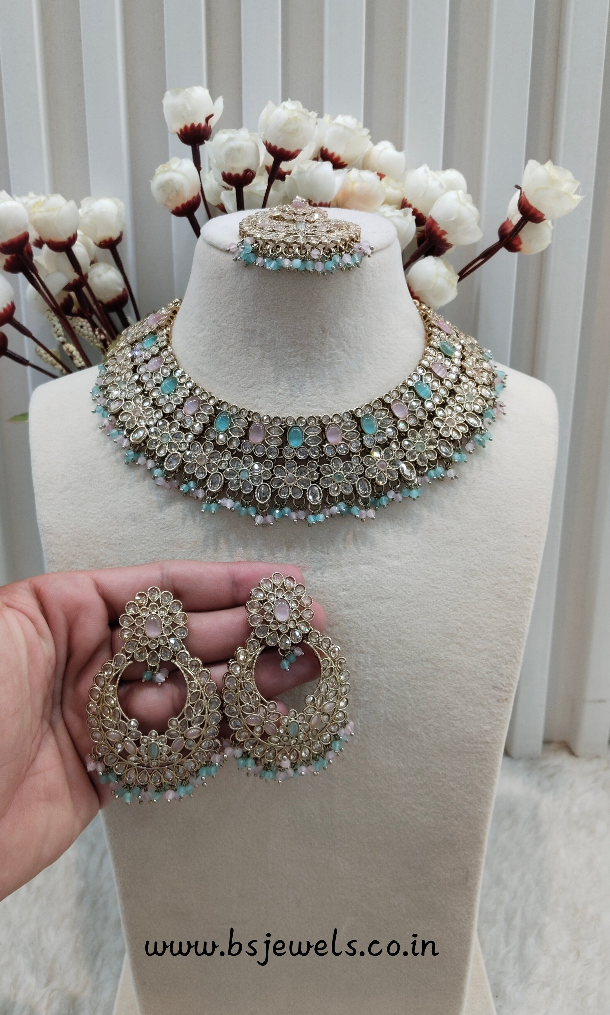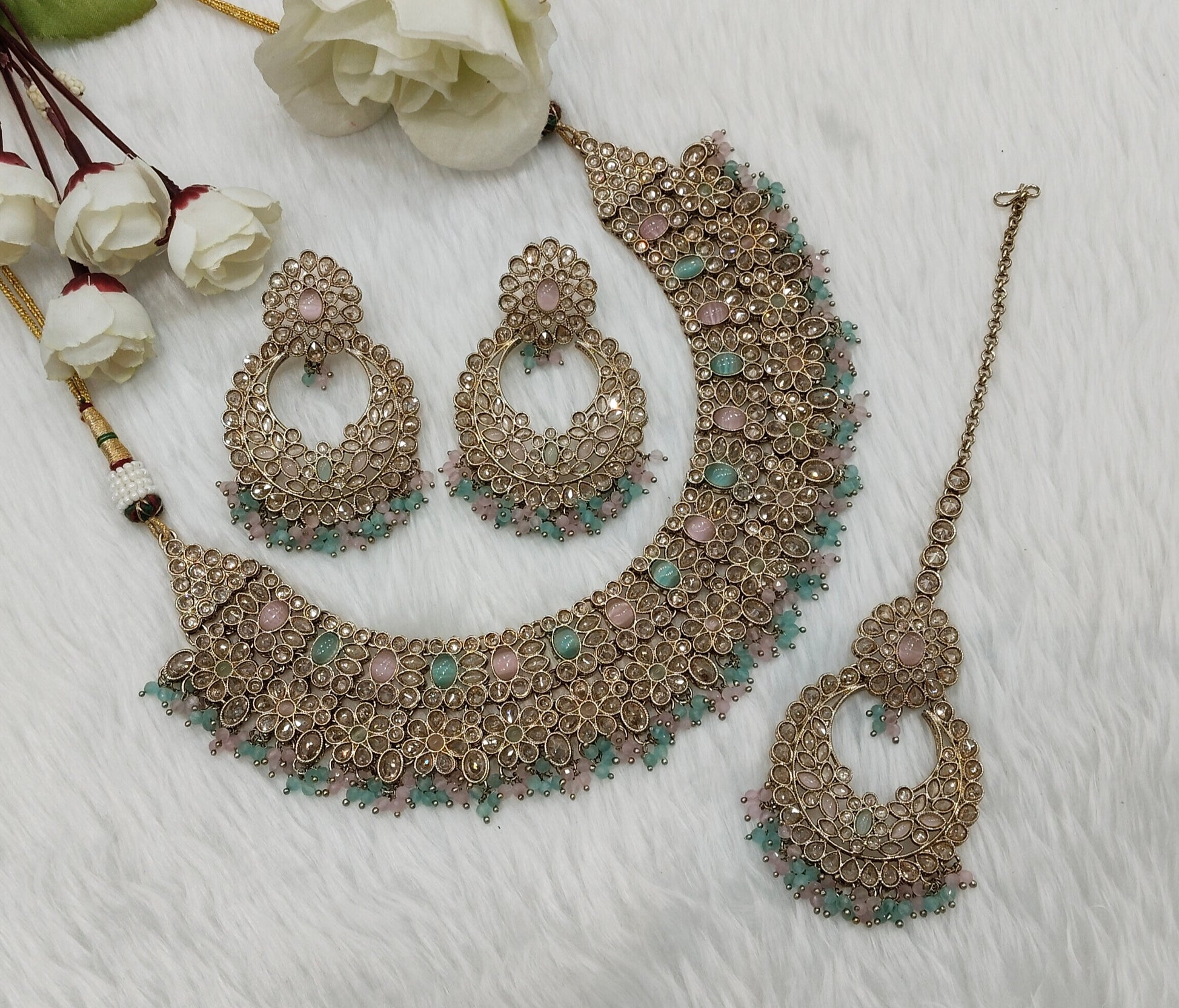 Mint Pink Antique Gold Necklace Jewellery Gopi Set