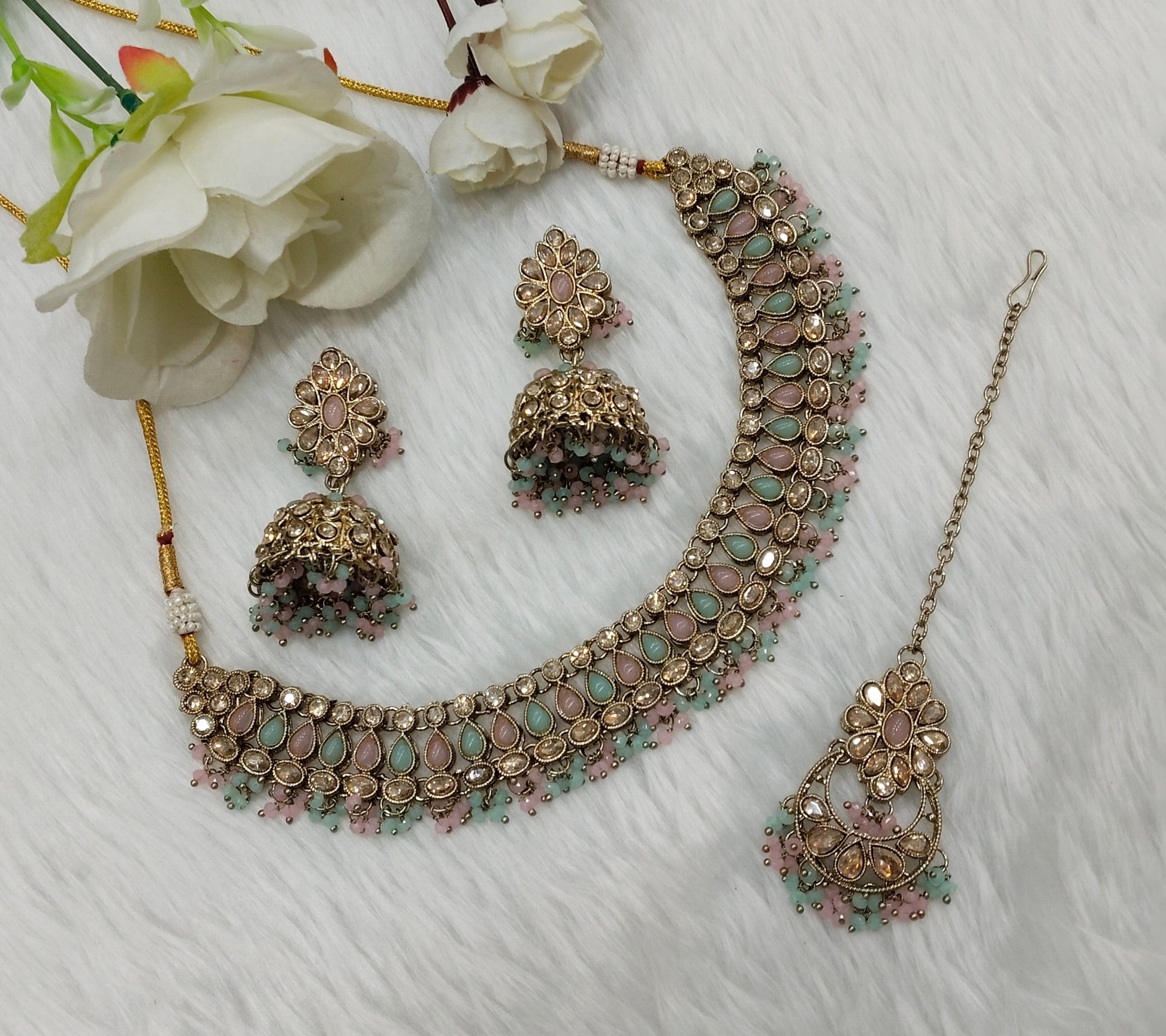 Mint Pink Antique Gold Necklace Jewellery Gora Set