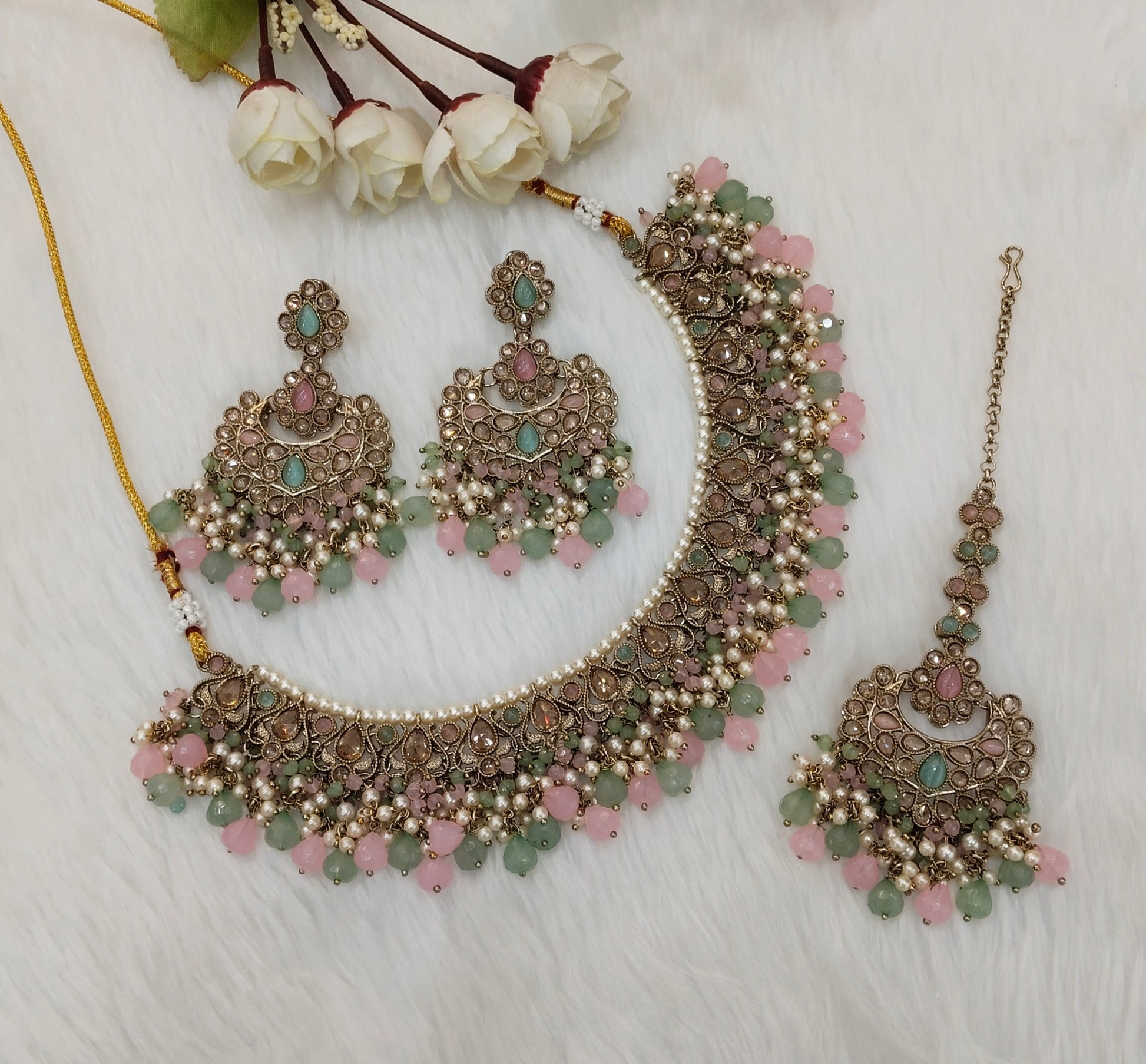 Mint Pink Antique Gold Necklace Jewellery Prisha Set