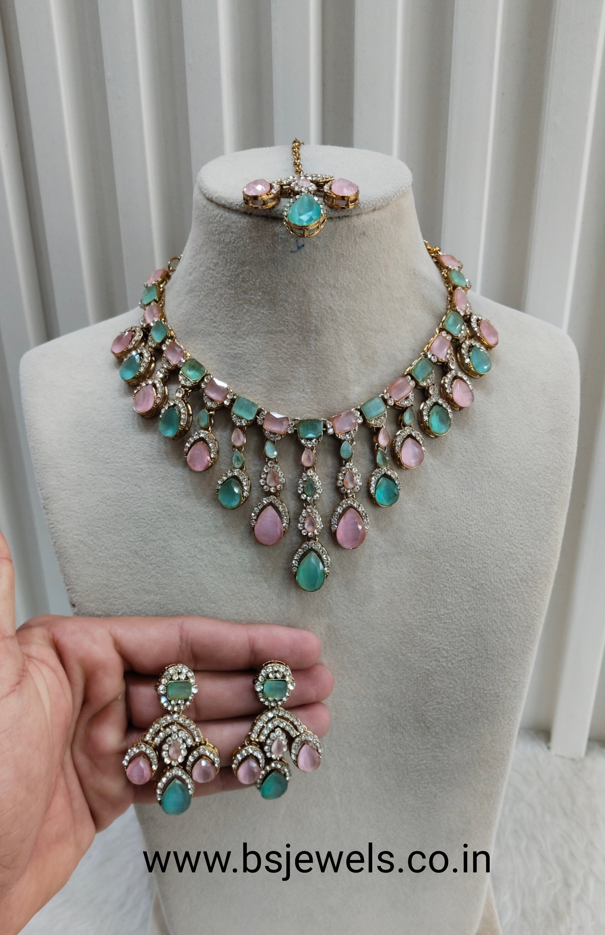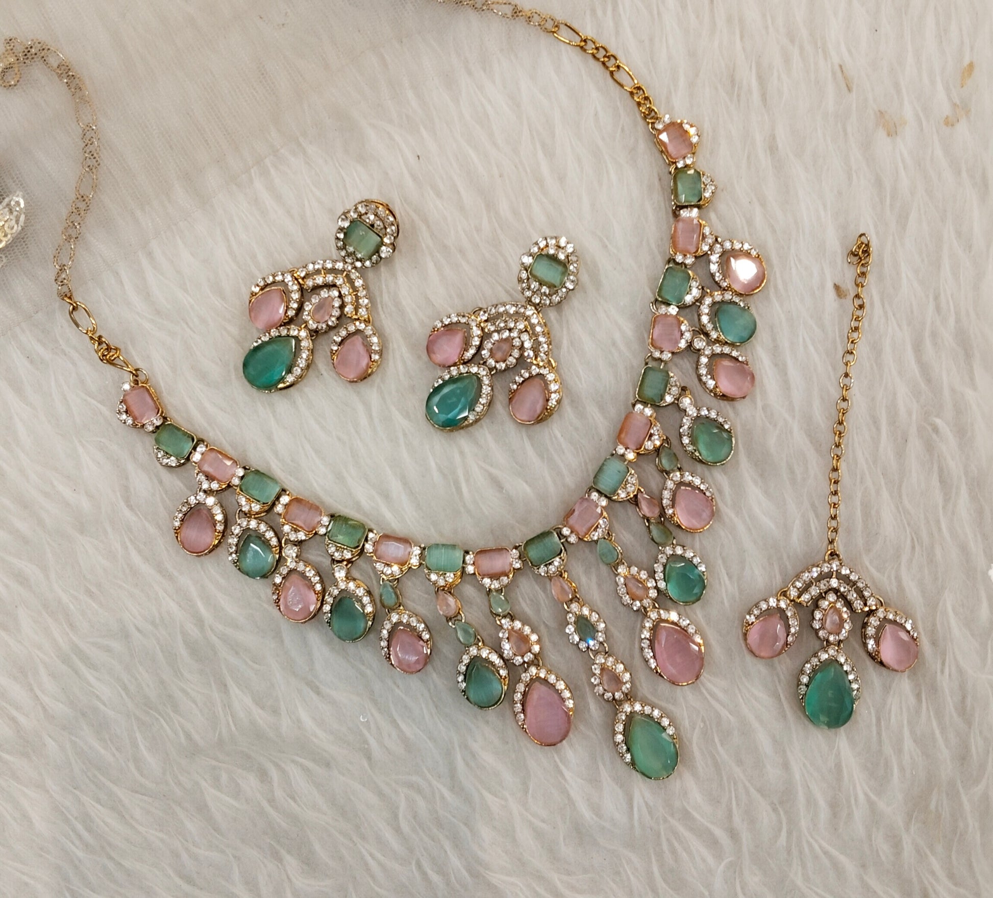Mint Pink Antique Gold Zircon Necklace Jewellery Ekaksh Set