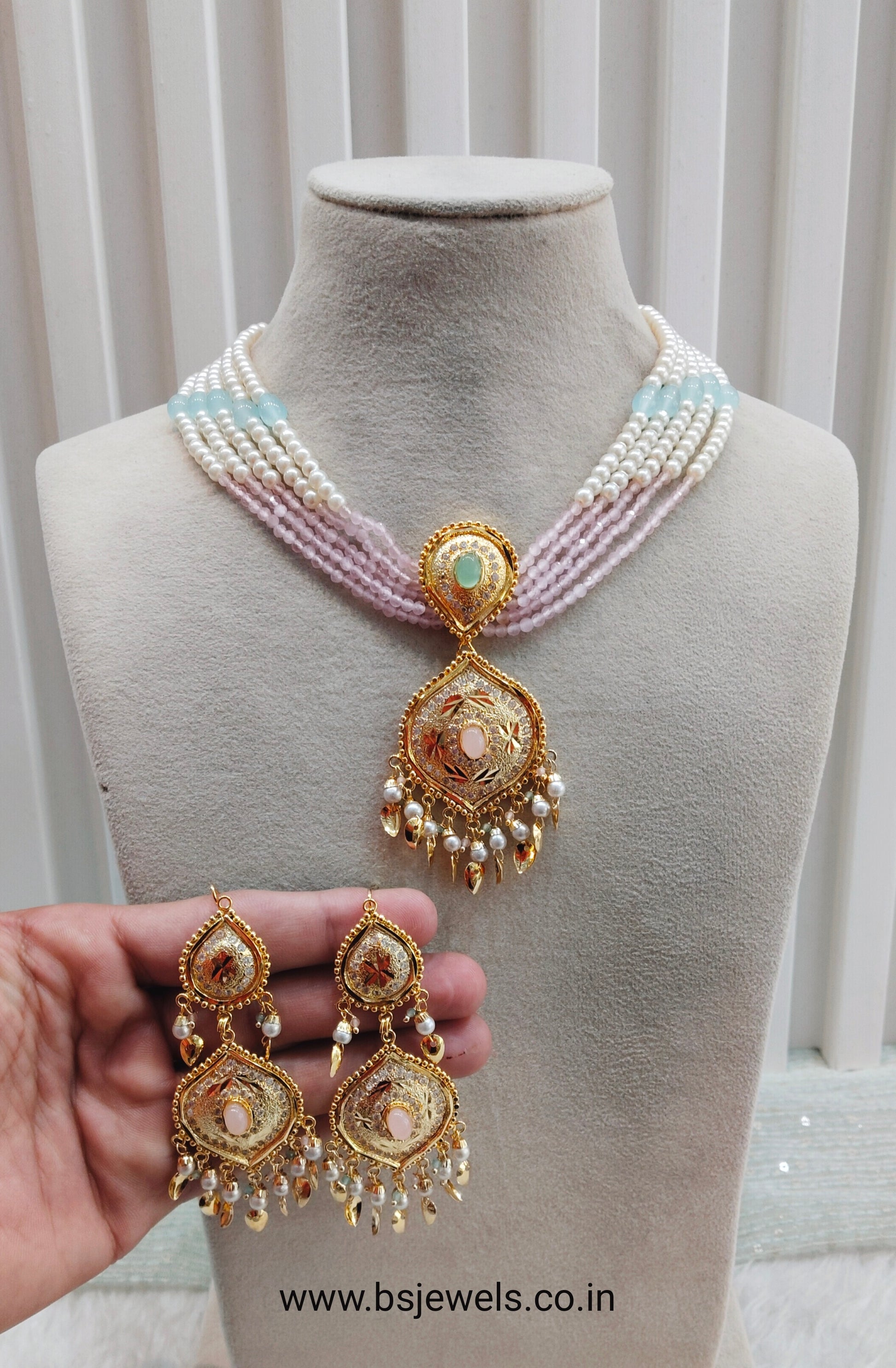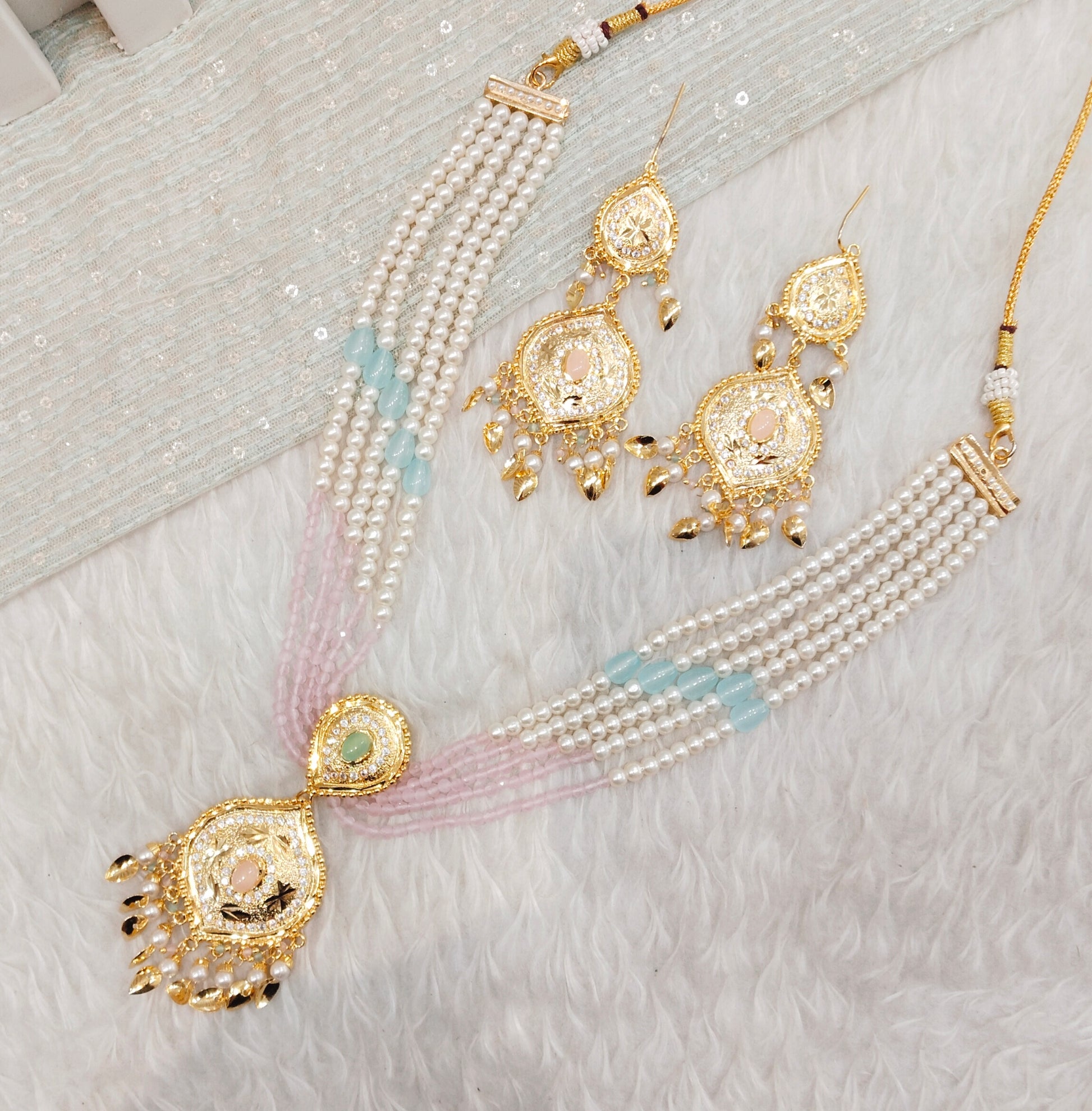 Mint Pink Gold Jadau Punjabi Style Necklace Jewellery Smith Set