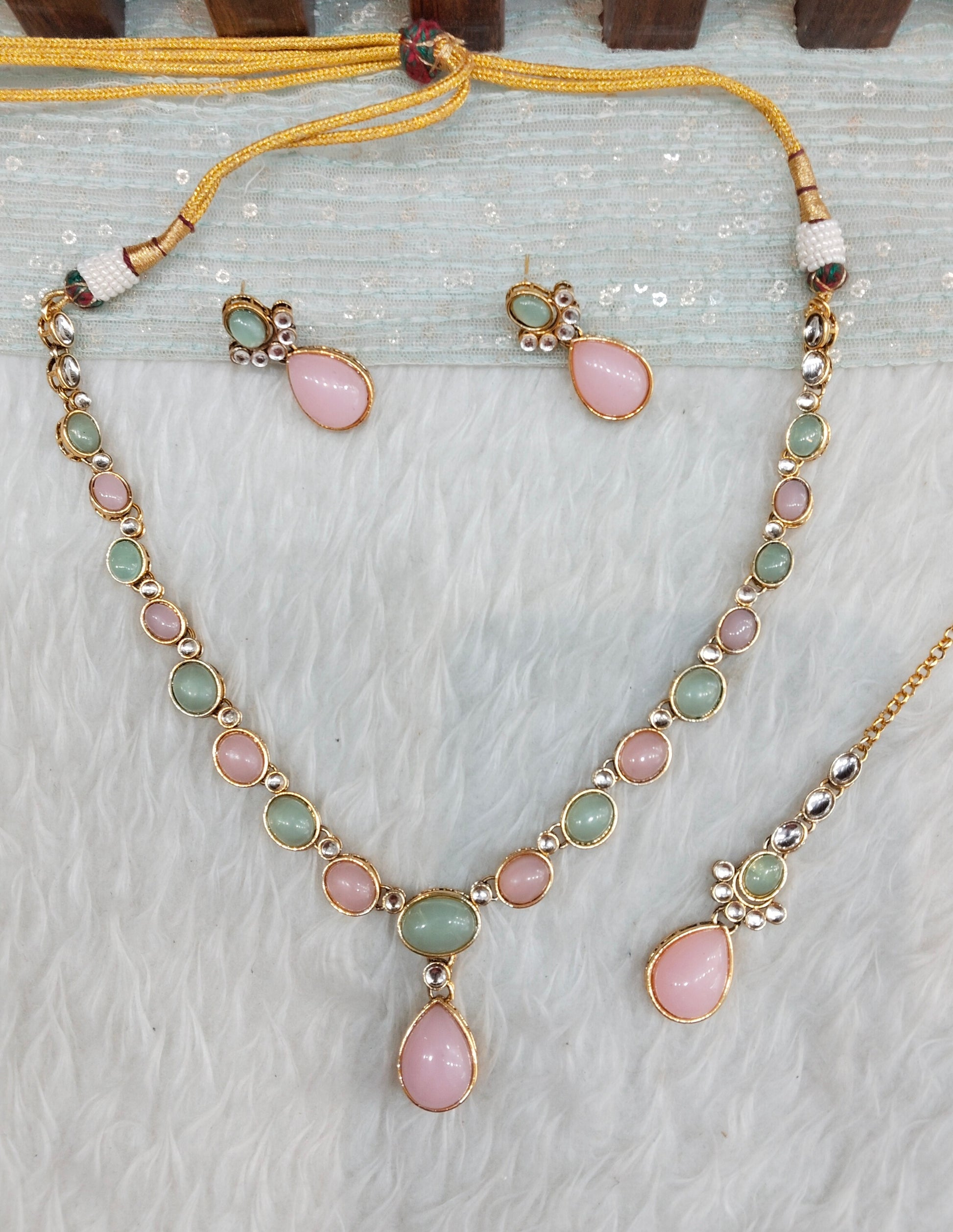 Mint Pink Gold Kundan Necklace Jewellery Mahi Set