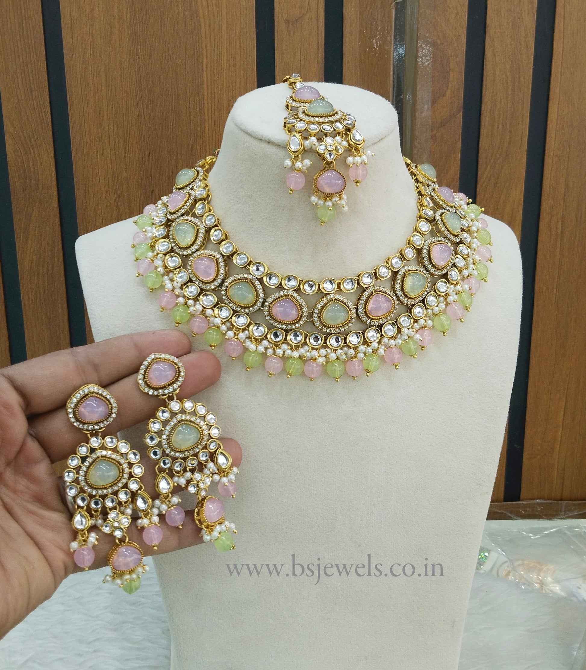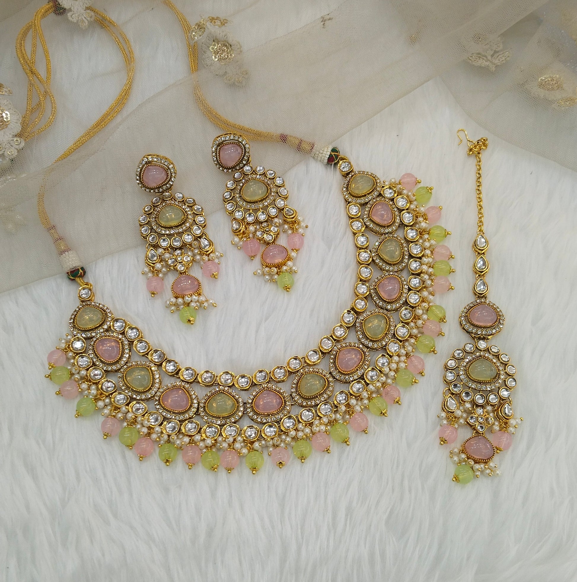Mint Pink Kundan Necklace Jewellery Ehimay Set