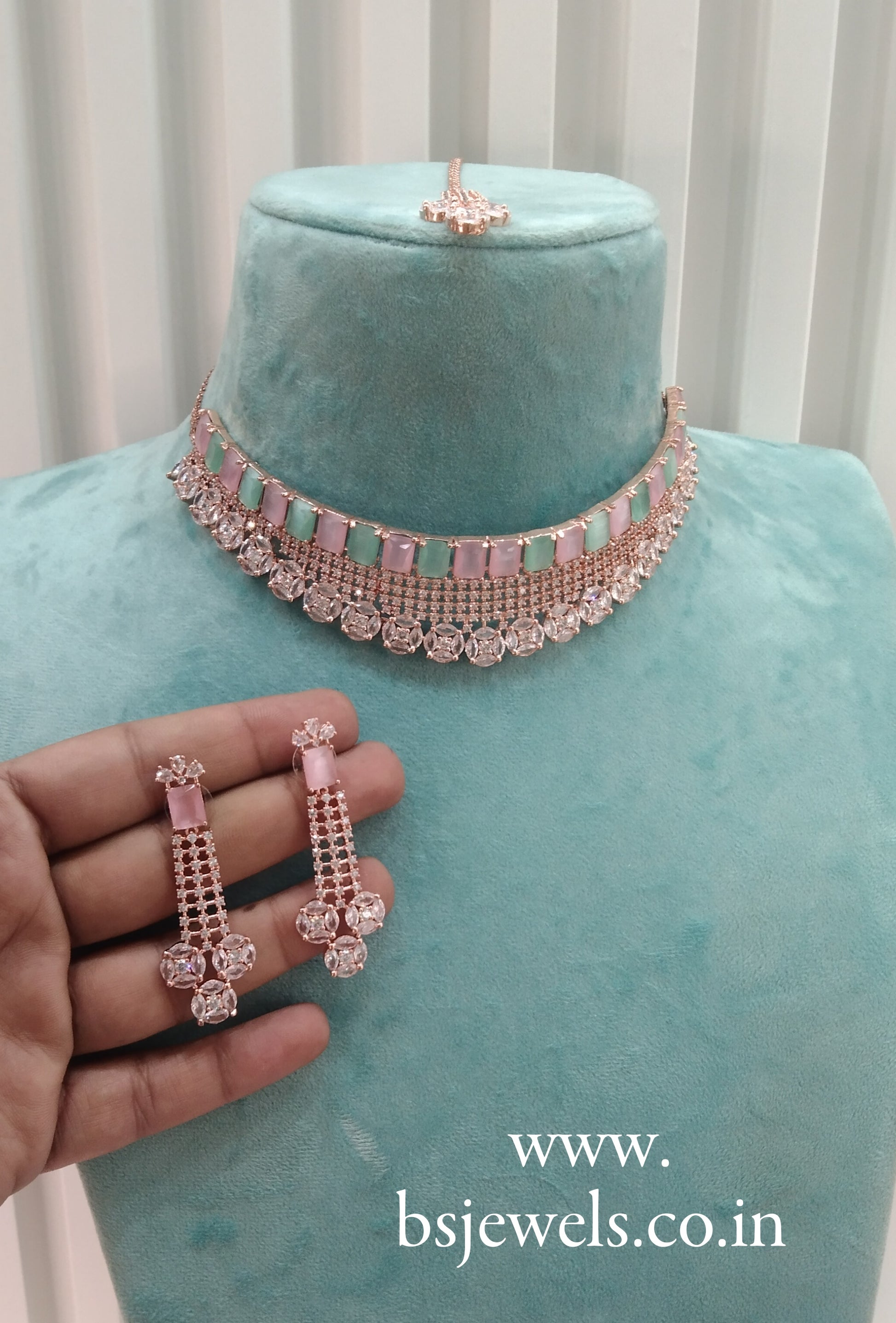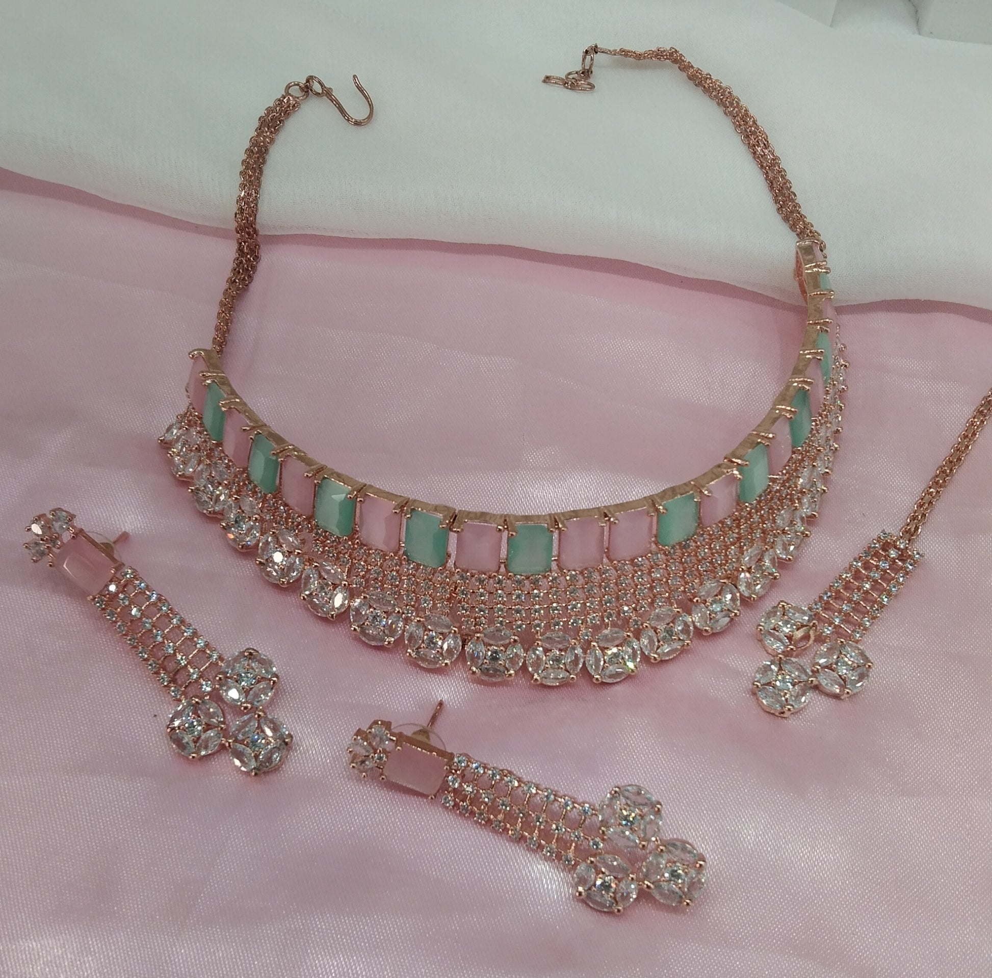 Mint Pink Rose CZ Choker Jewellery Ankush Set