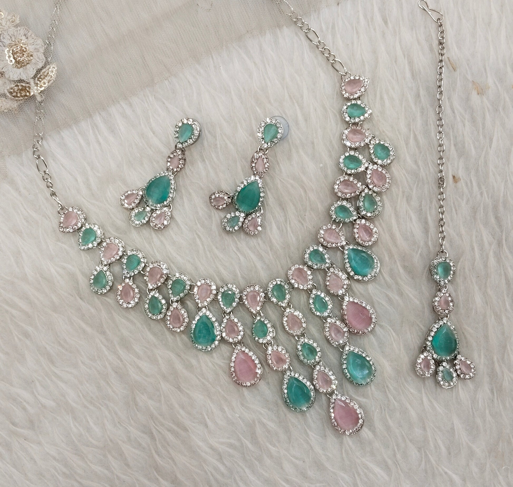 Mint Pink Silver Zircon Necklace Jewellery Shami Set