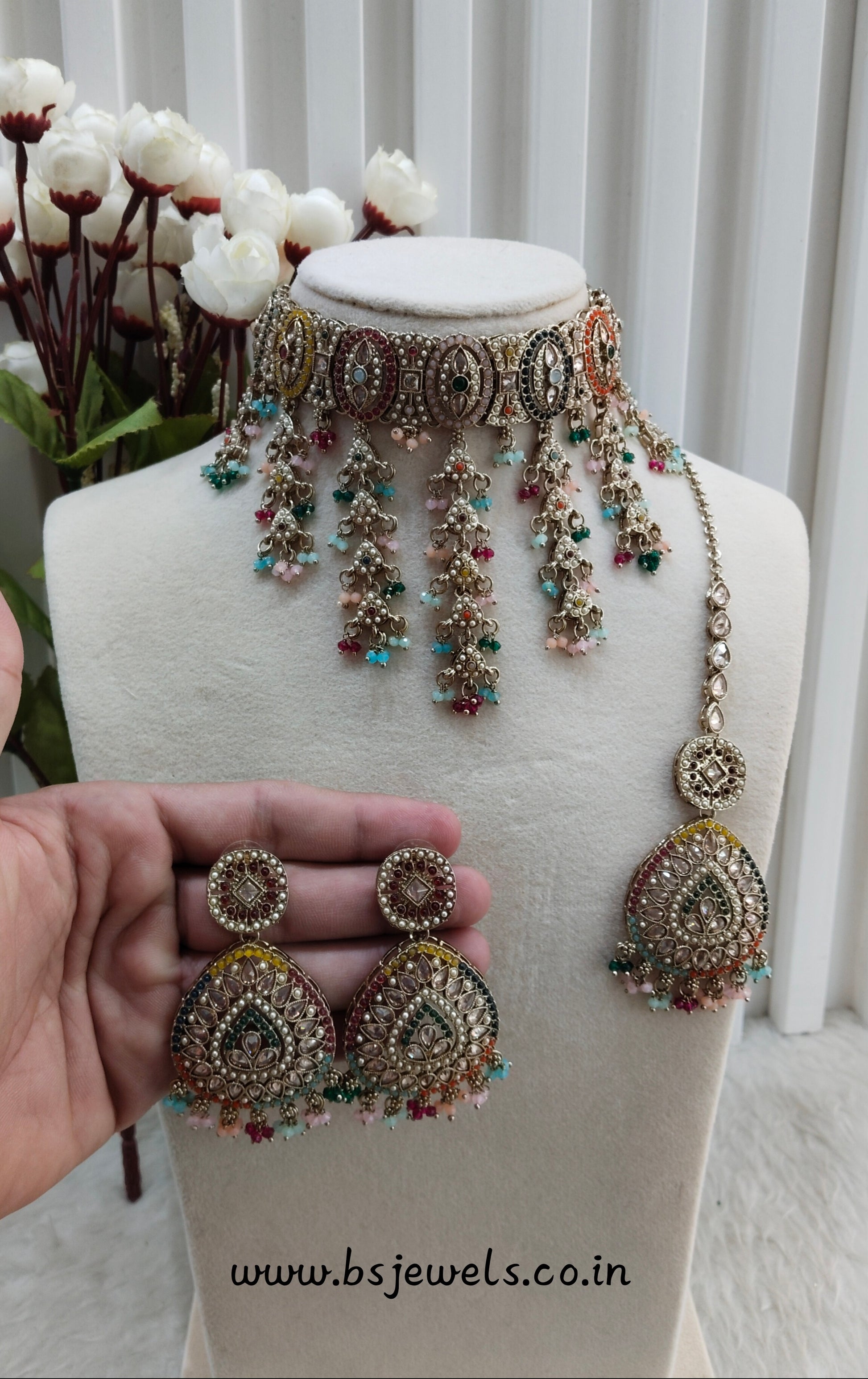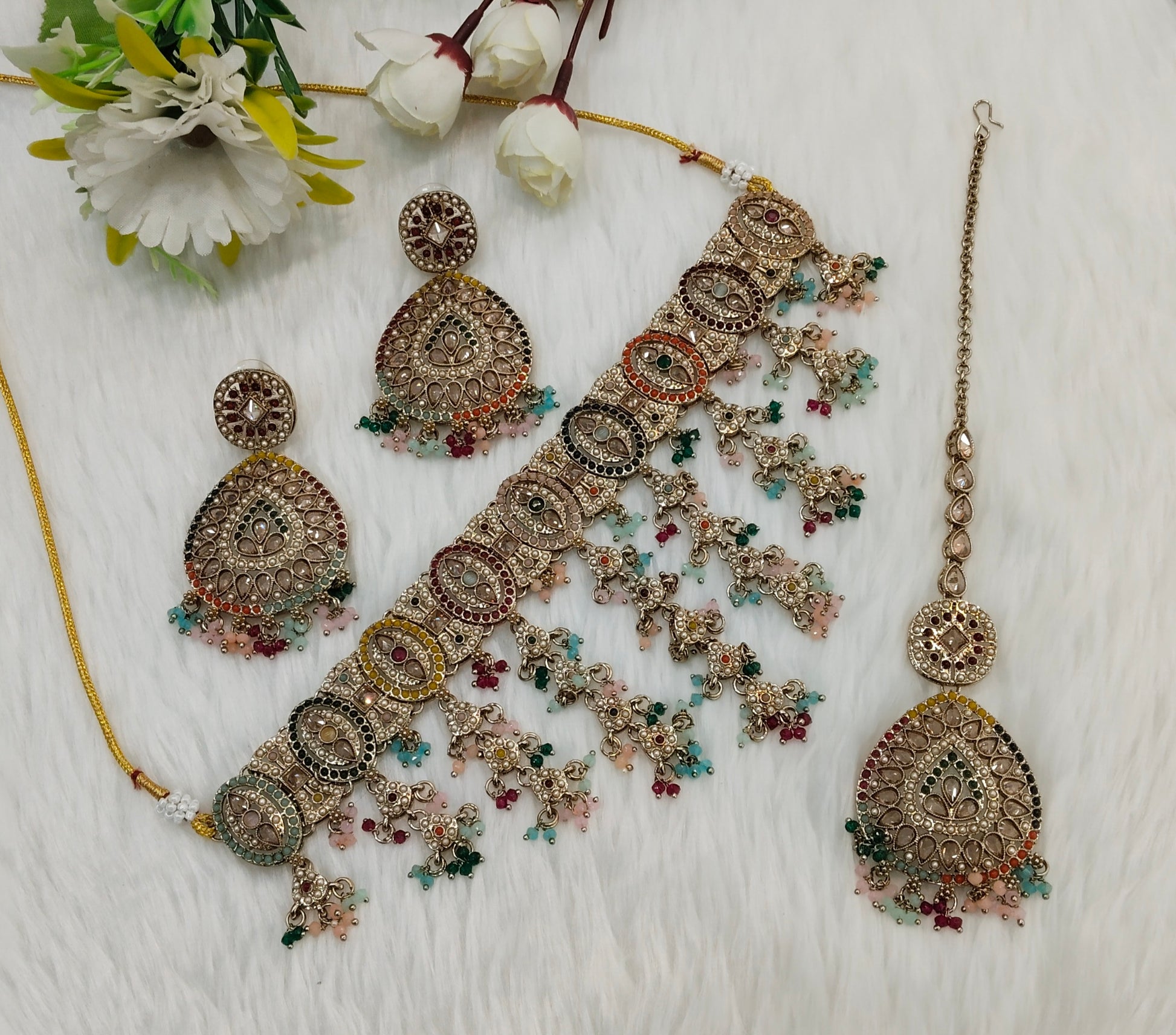 Multi Color Antique Gold Choker Jewellery Inder Set