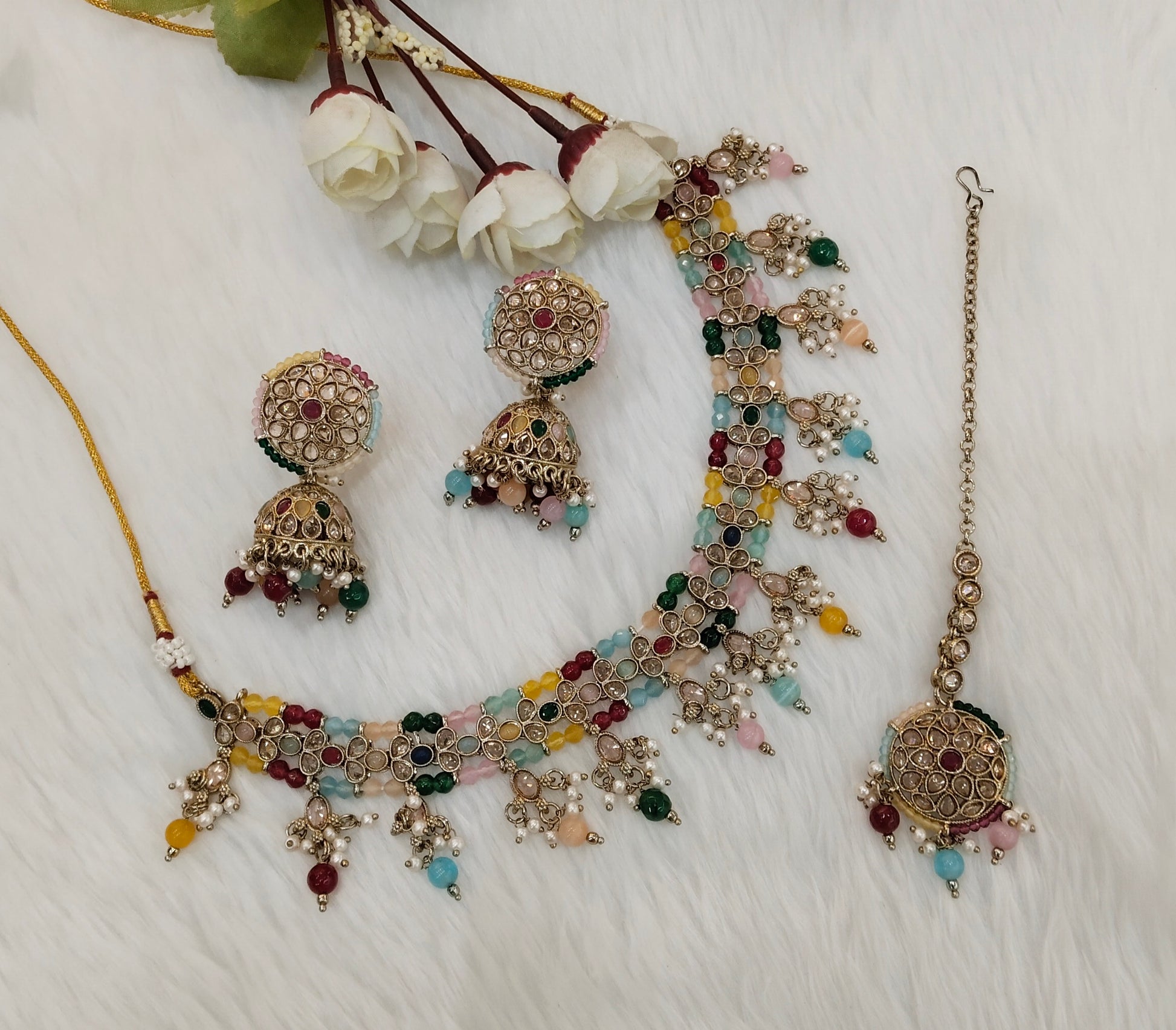 Multi Color Antique Gold Necklace Jewellery Gurjot Set