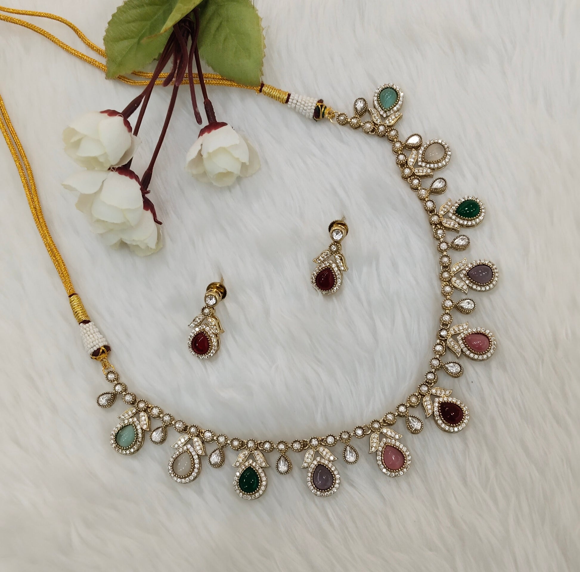 Multi Color Gold Moissanite Kundan Necklace Jewellery Barkat Set