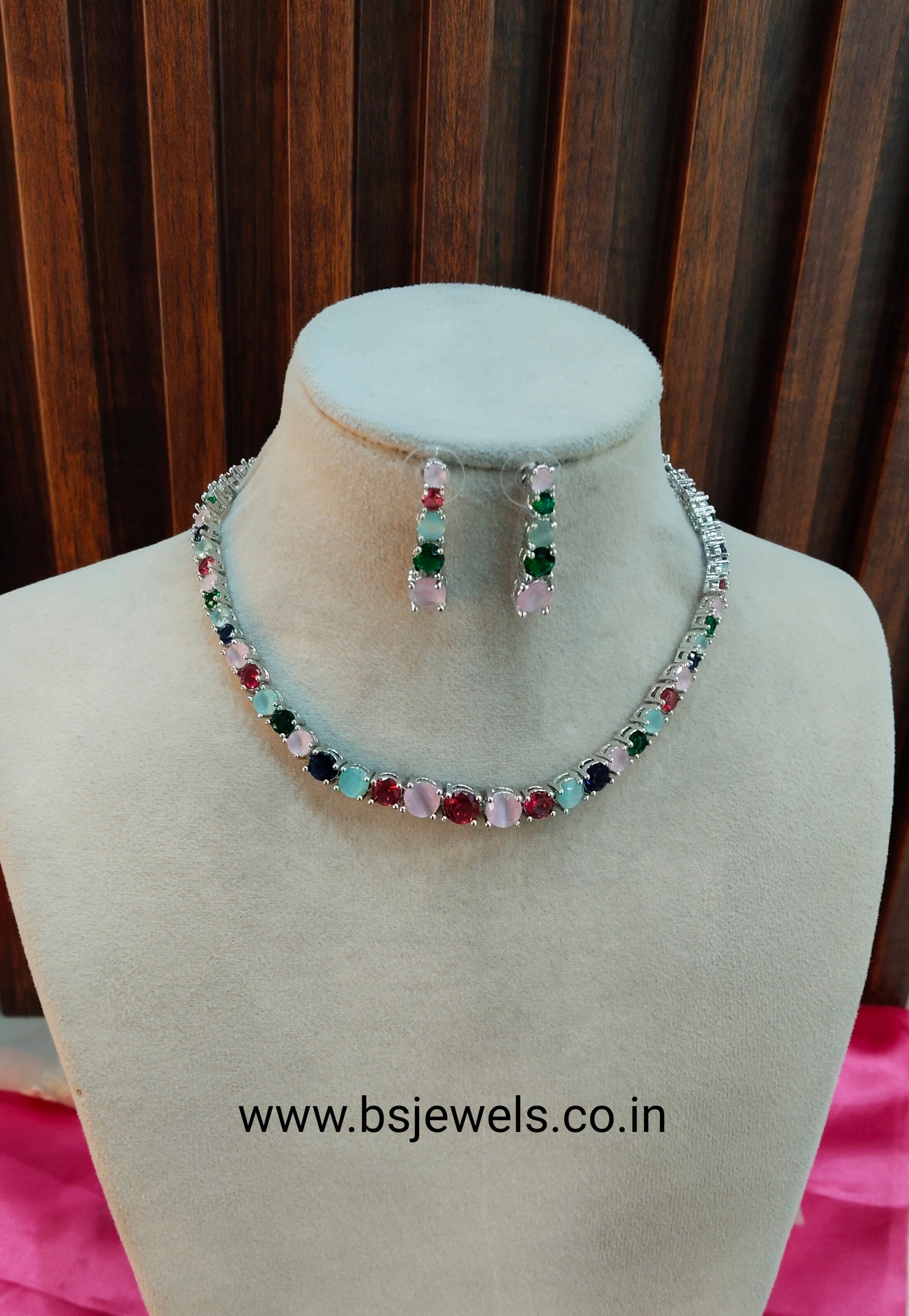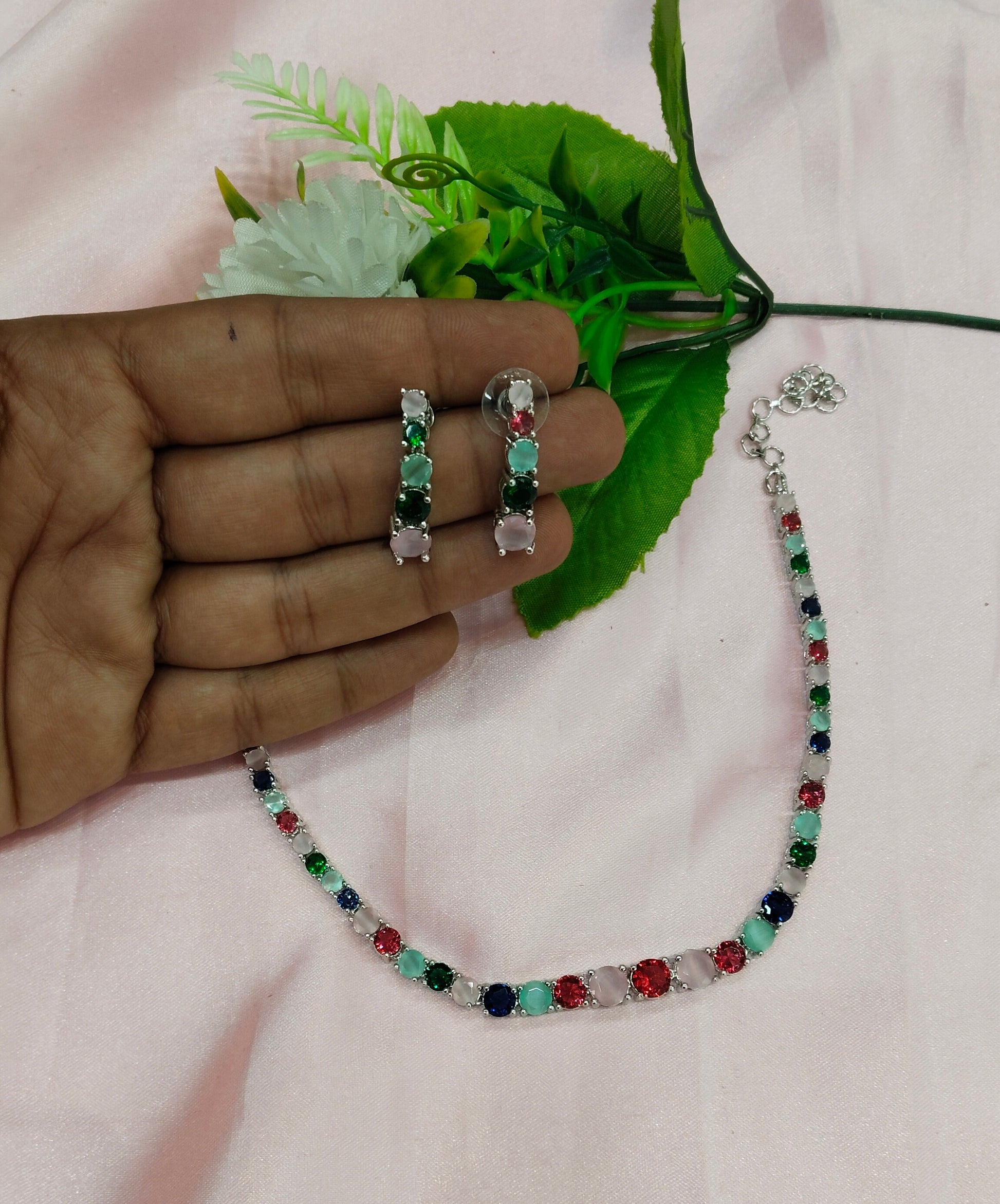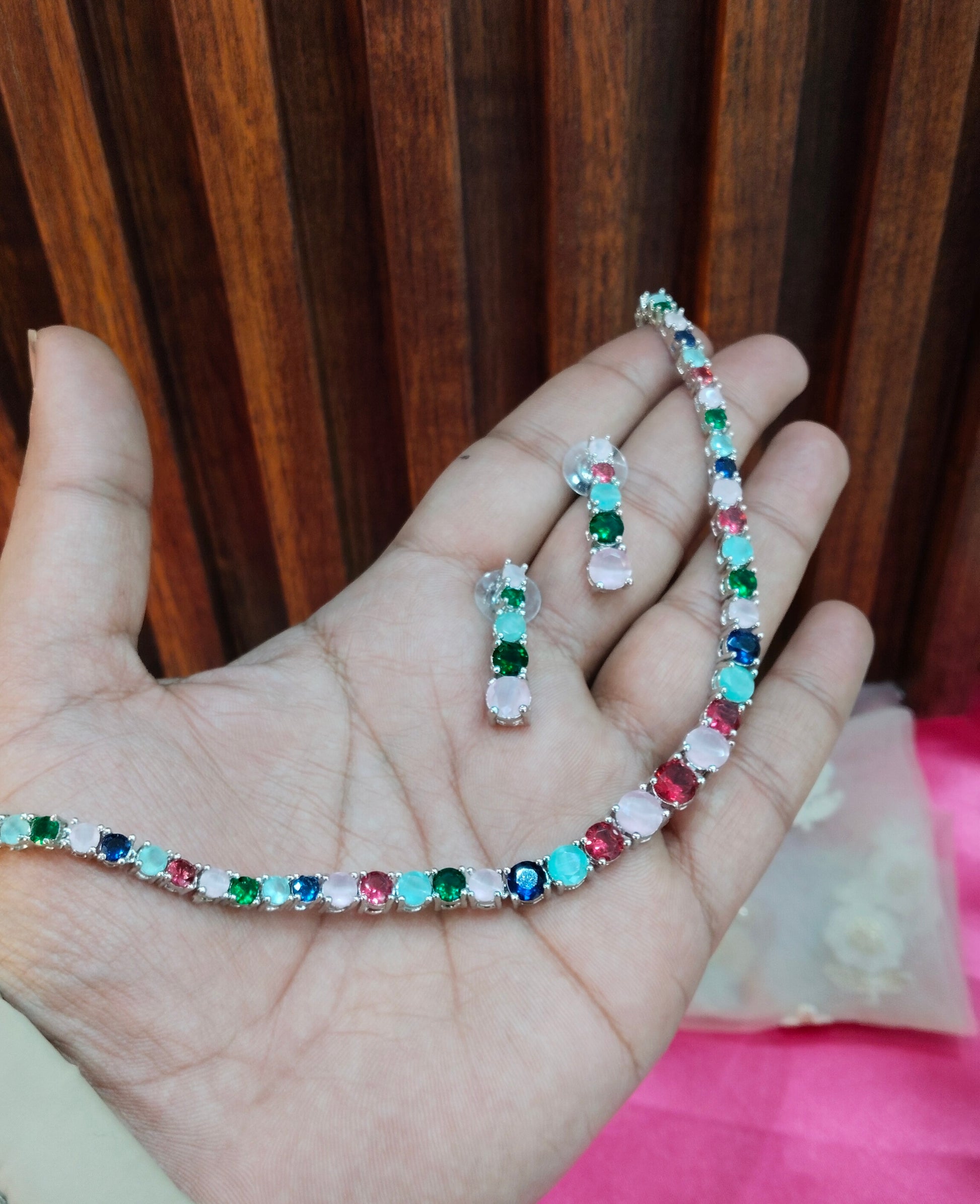 Multi Color Silver CZ Necklace Jewellery Dua Set