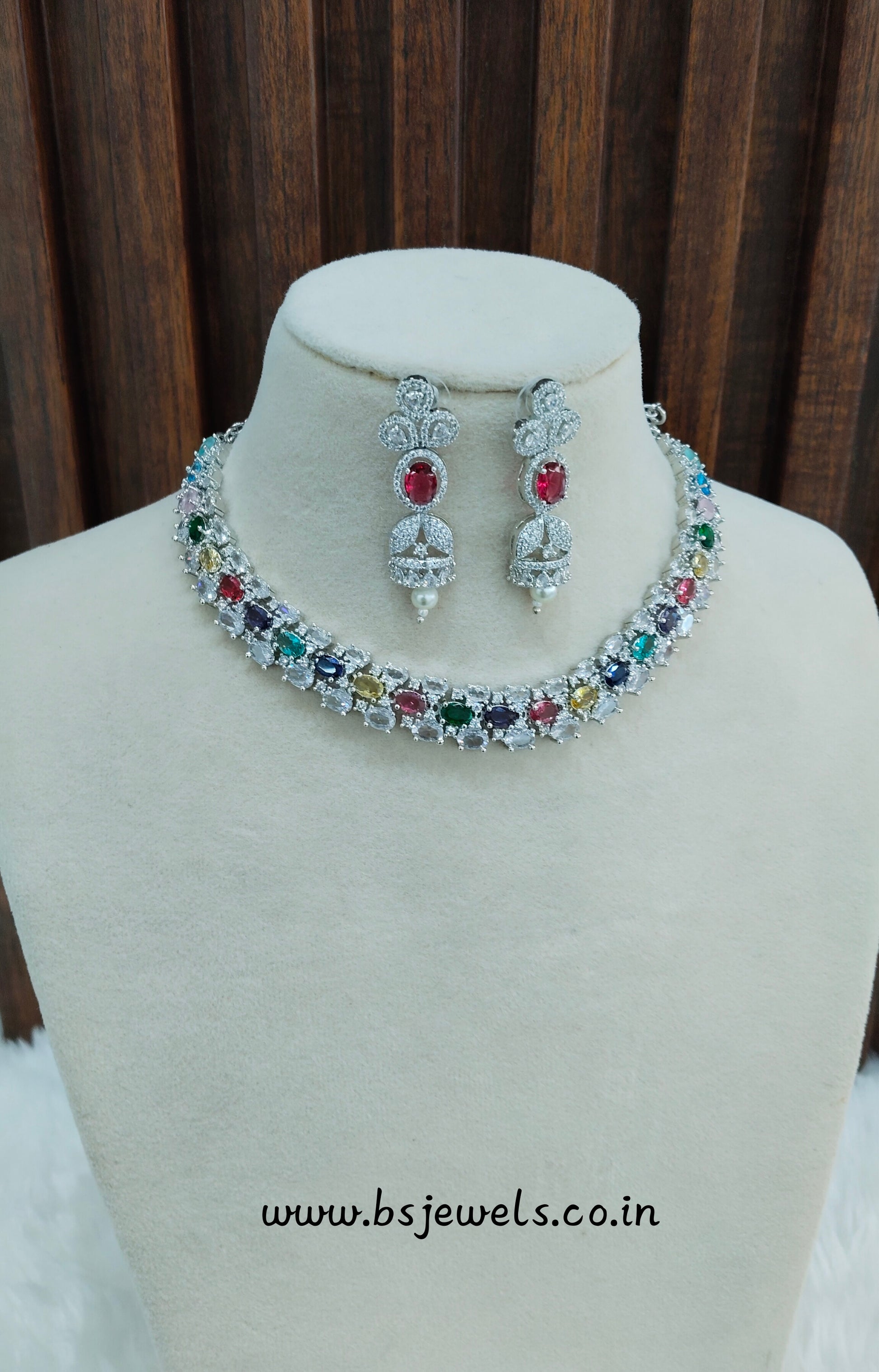 Multi Color Silver CZ Necklace Jewellery Honda Set