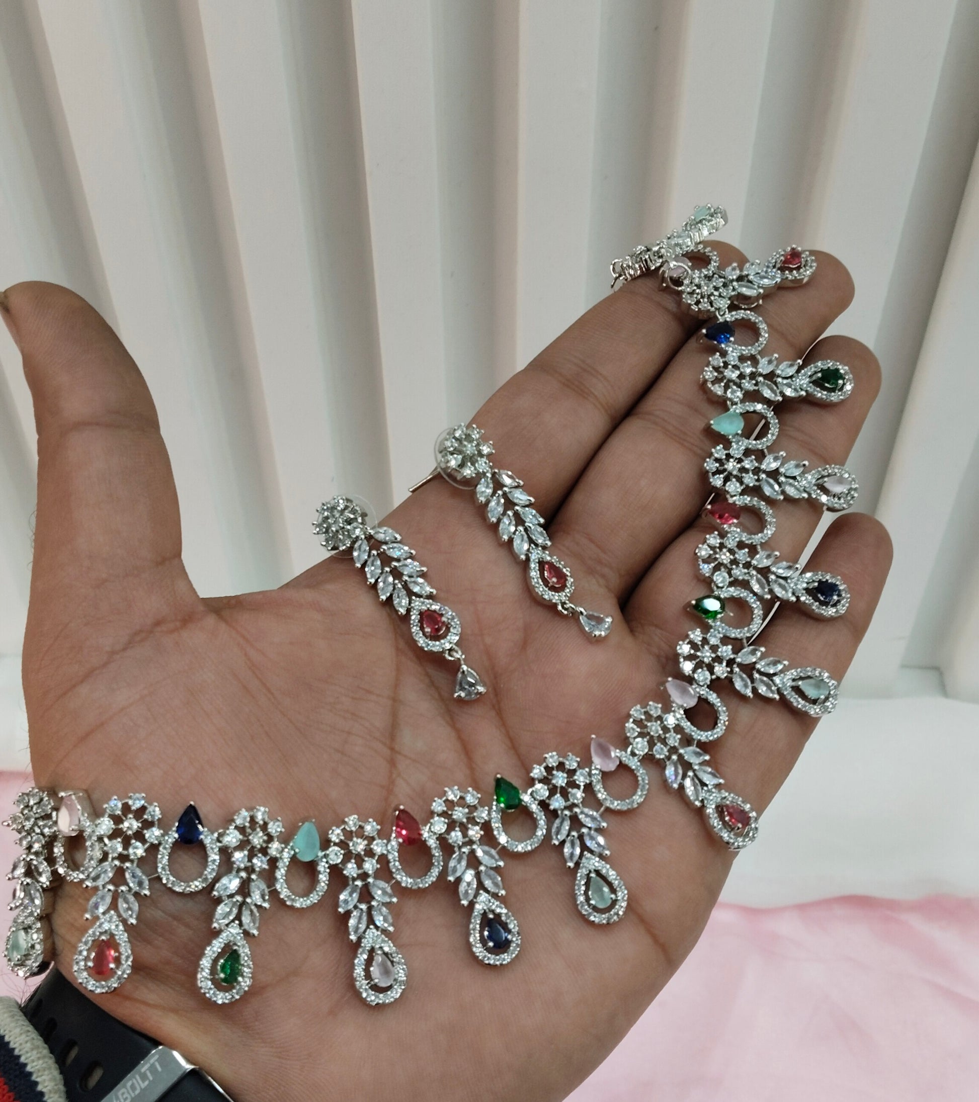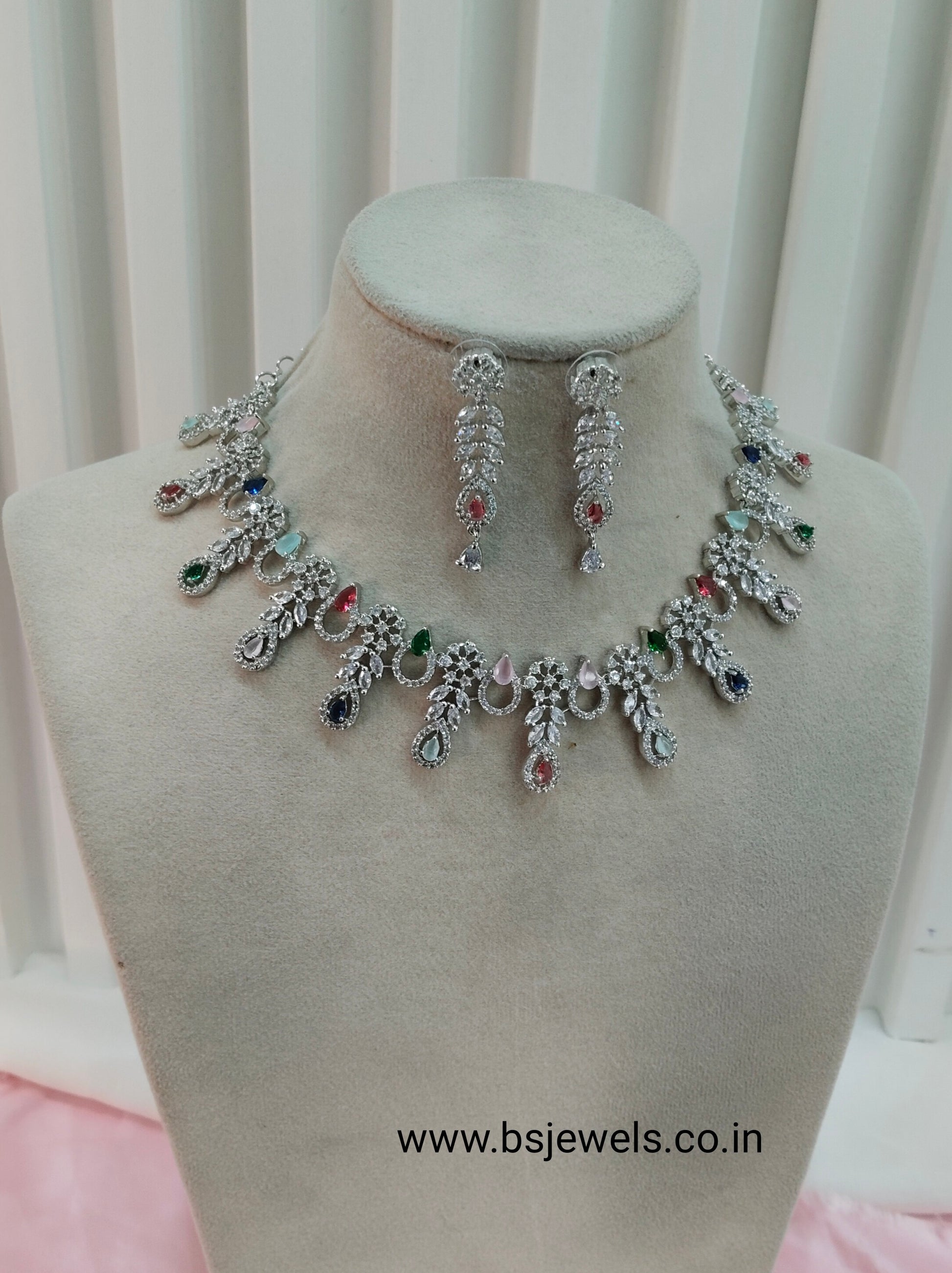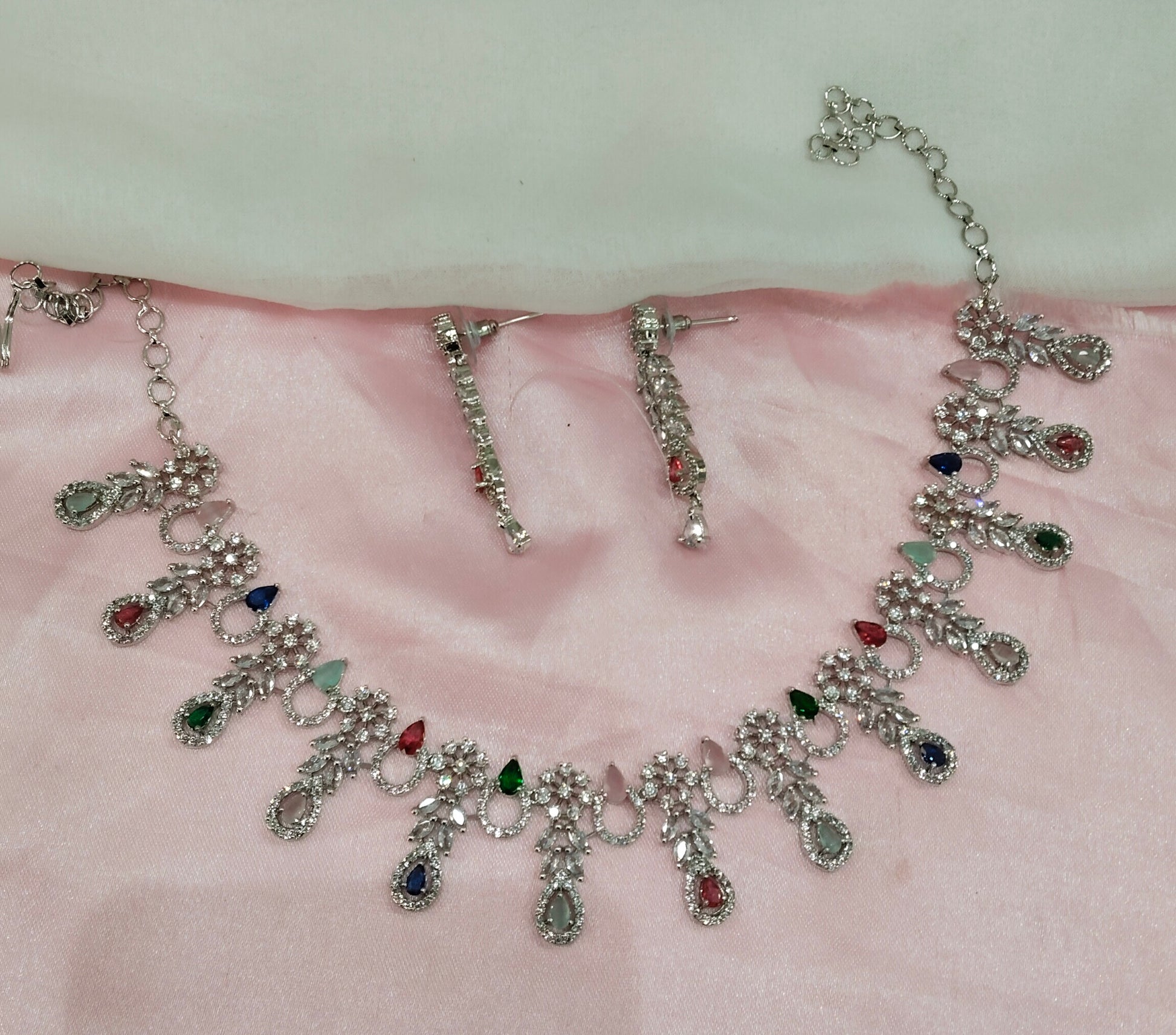 Multi Color Silver CZ Necklace Jewellery Ranjha Set