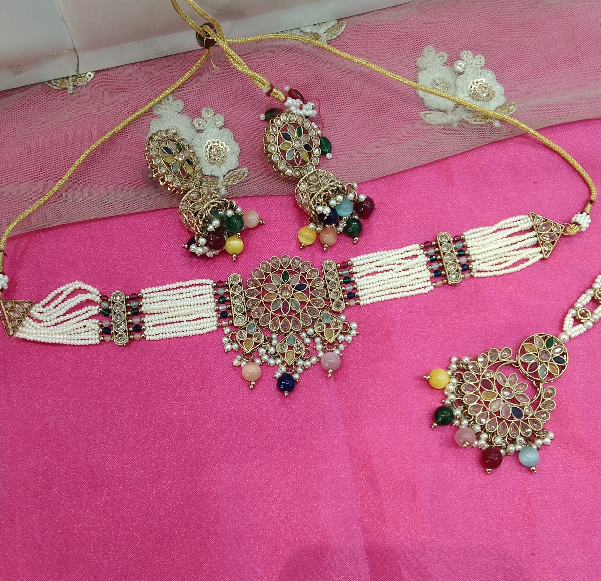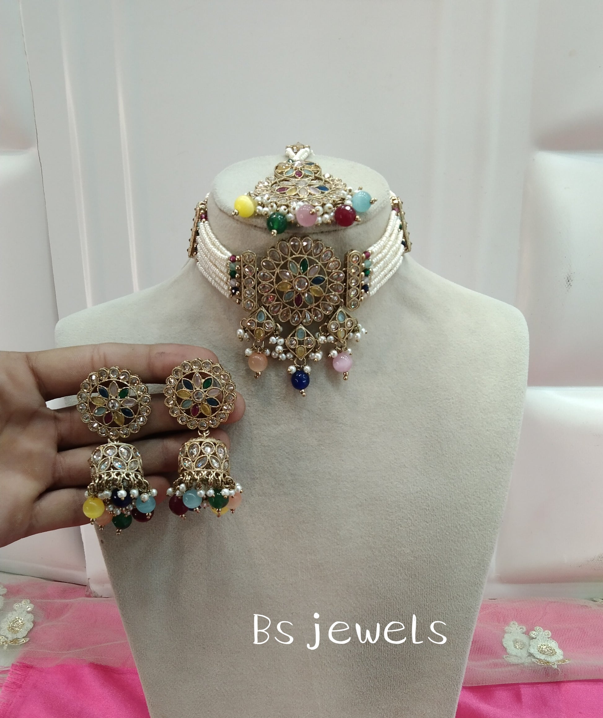 Multi Colour Champagne Stone Choker Jhumka Jewellery Alan Set