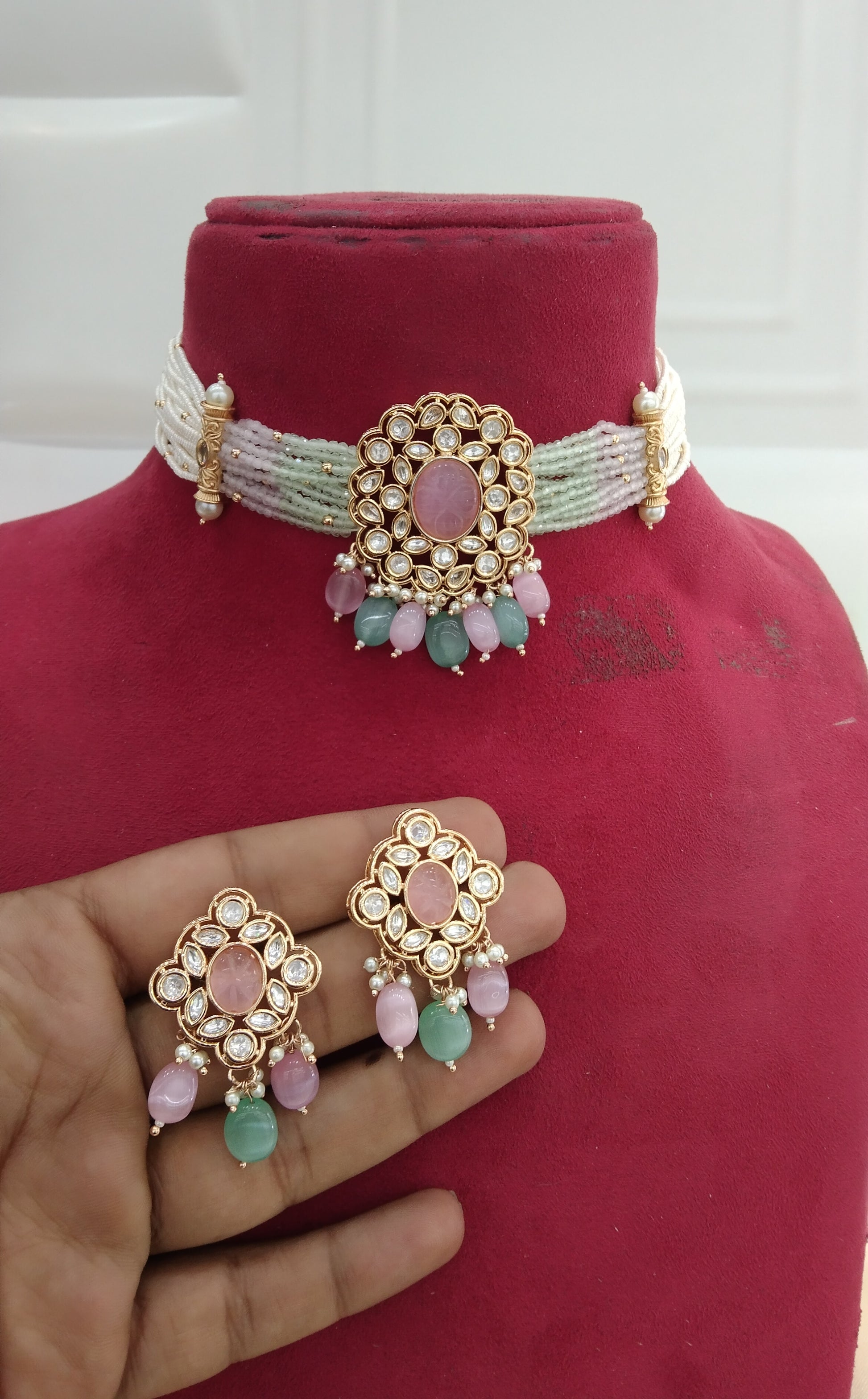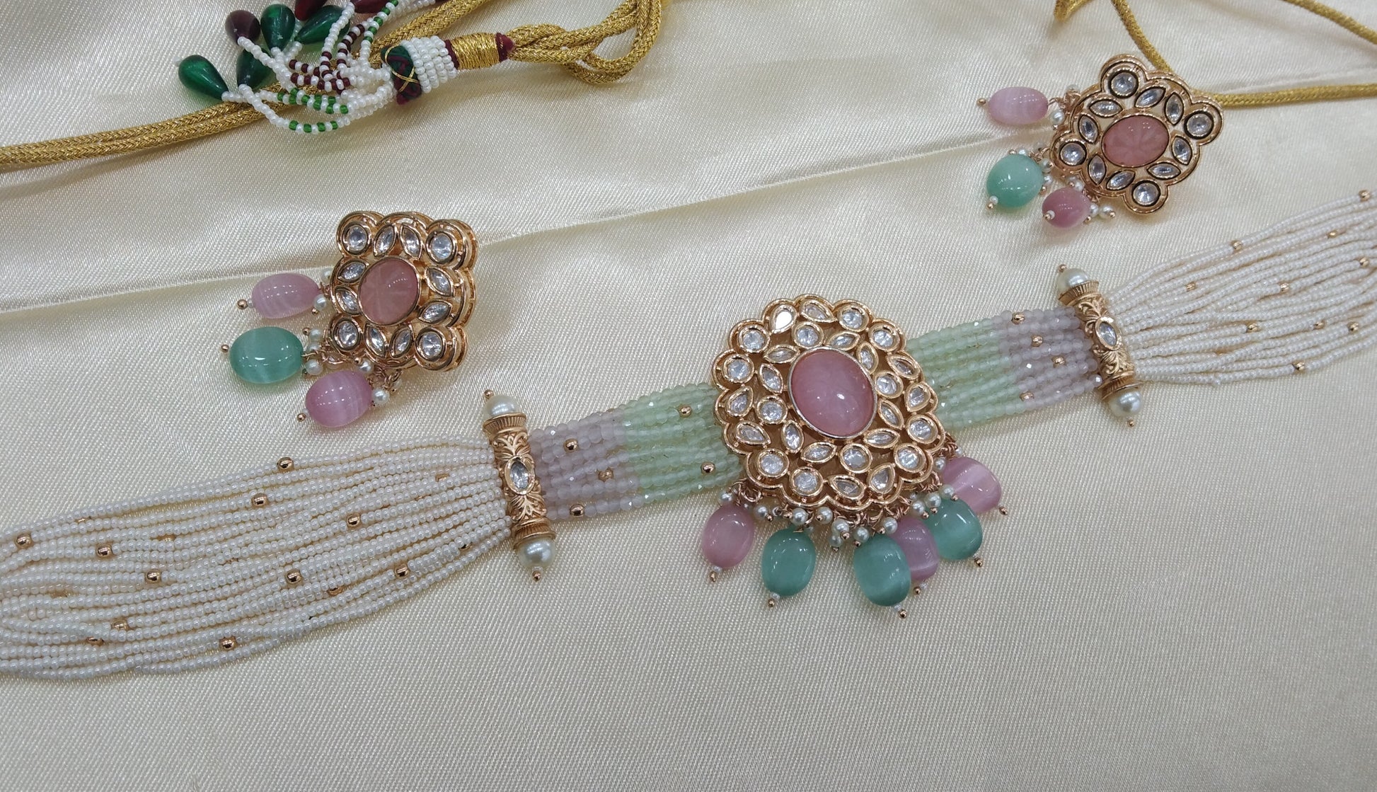 Nikk Sea Green Pink kundan Indian Choker Jewellery Set