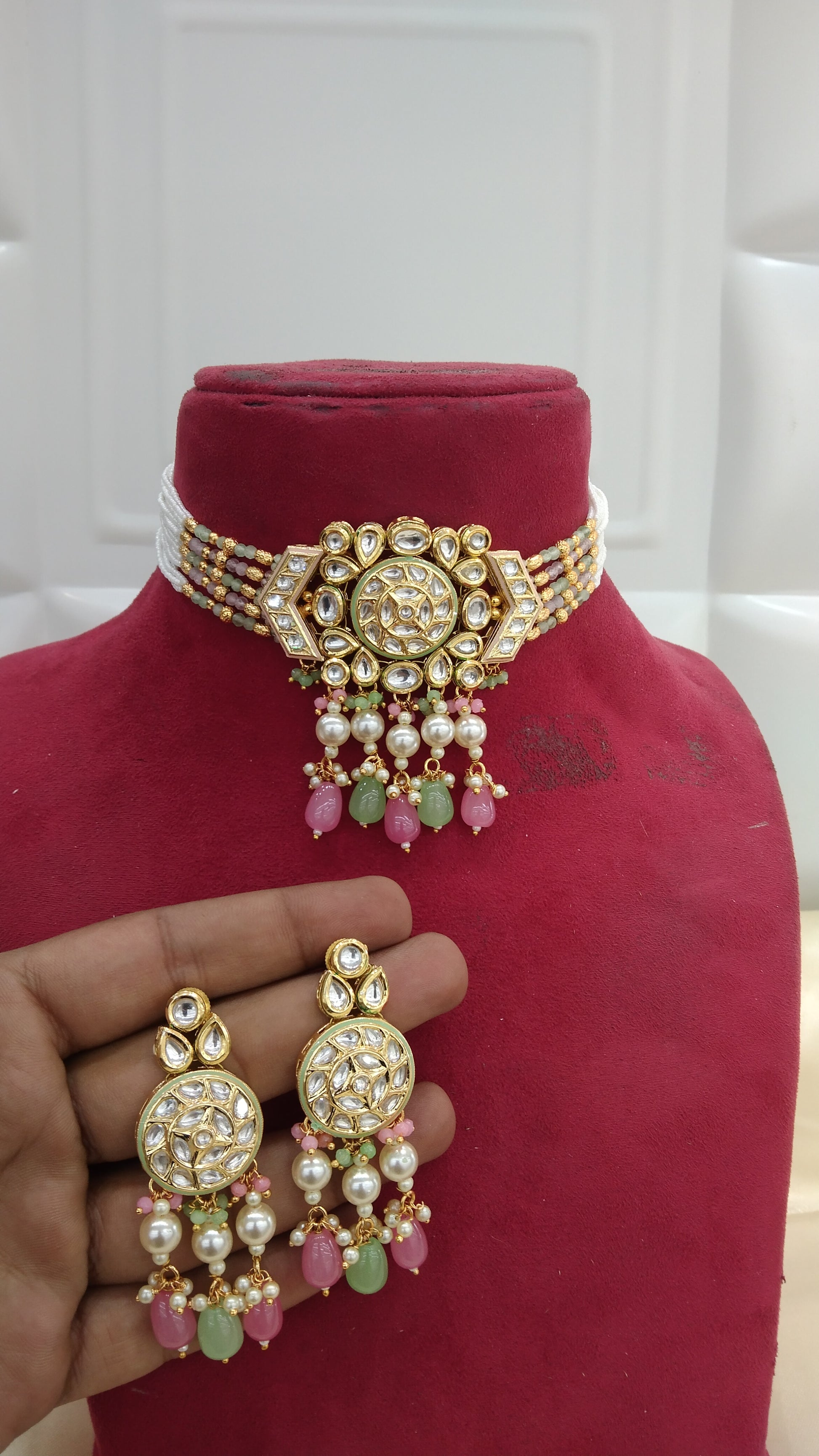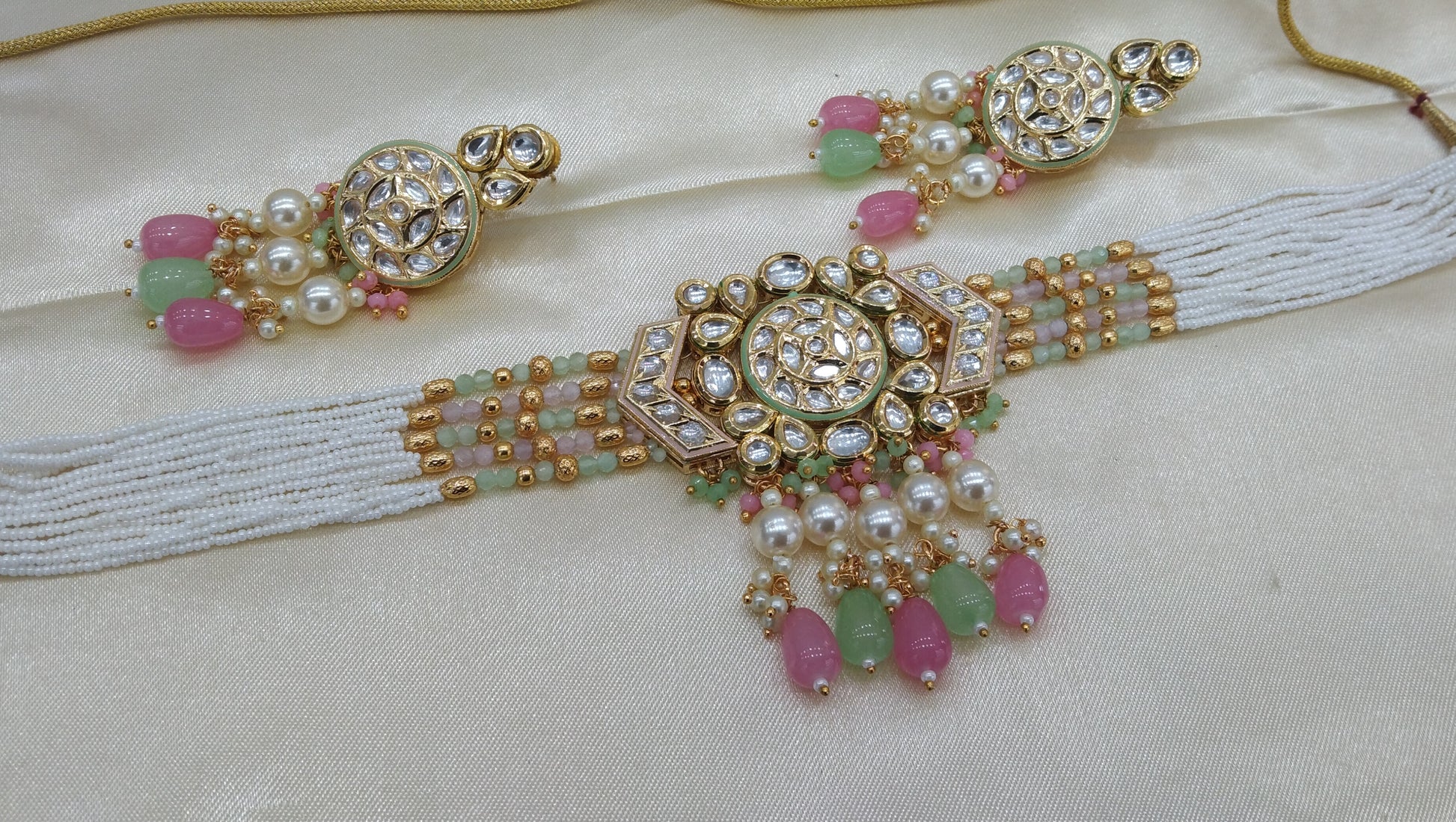 Nimo Pista Pink kundan Indian Choker Jewellery Set