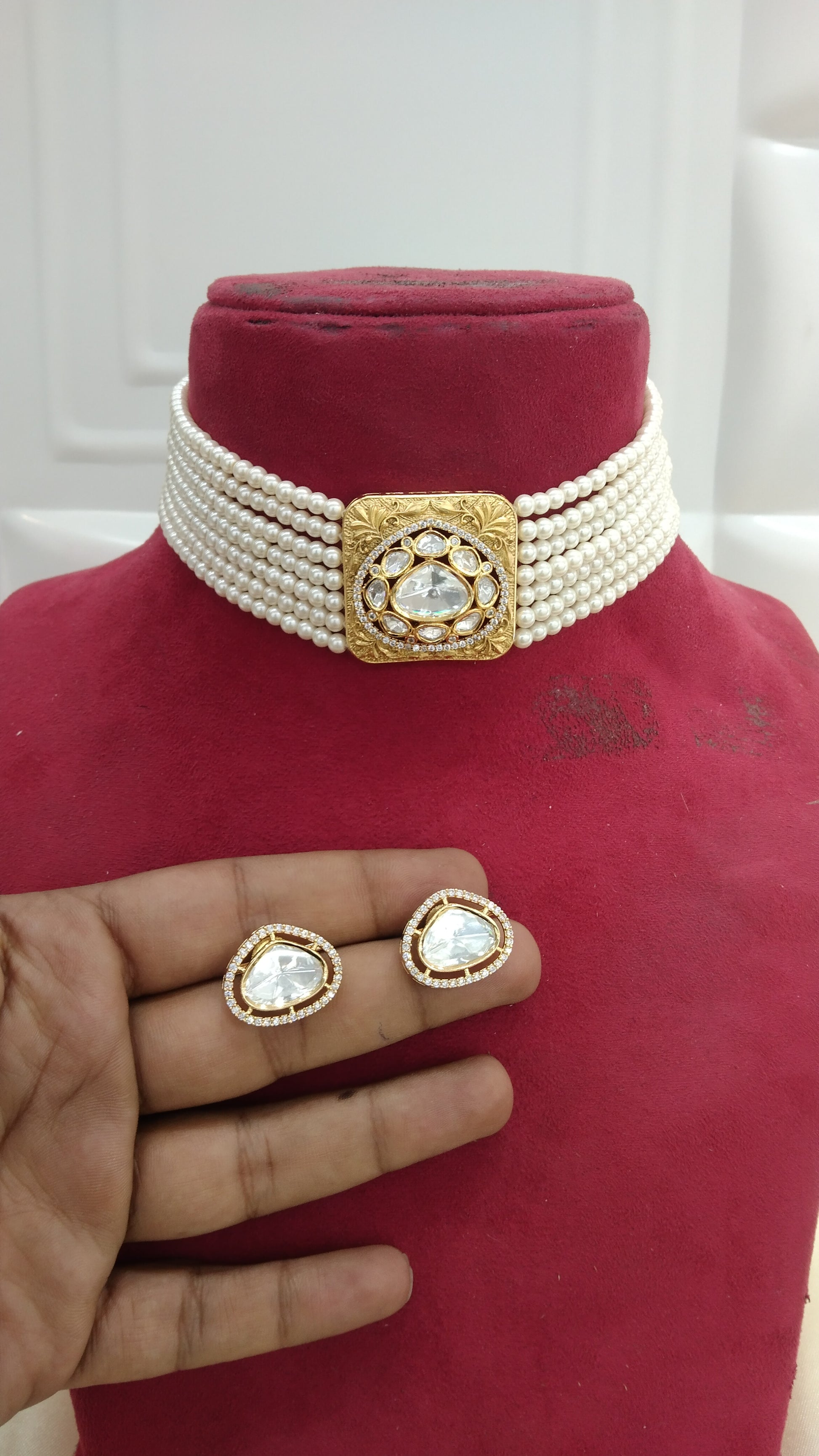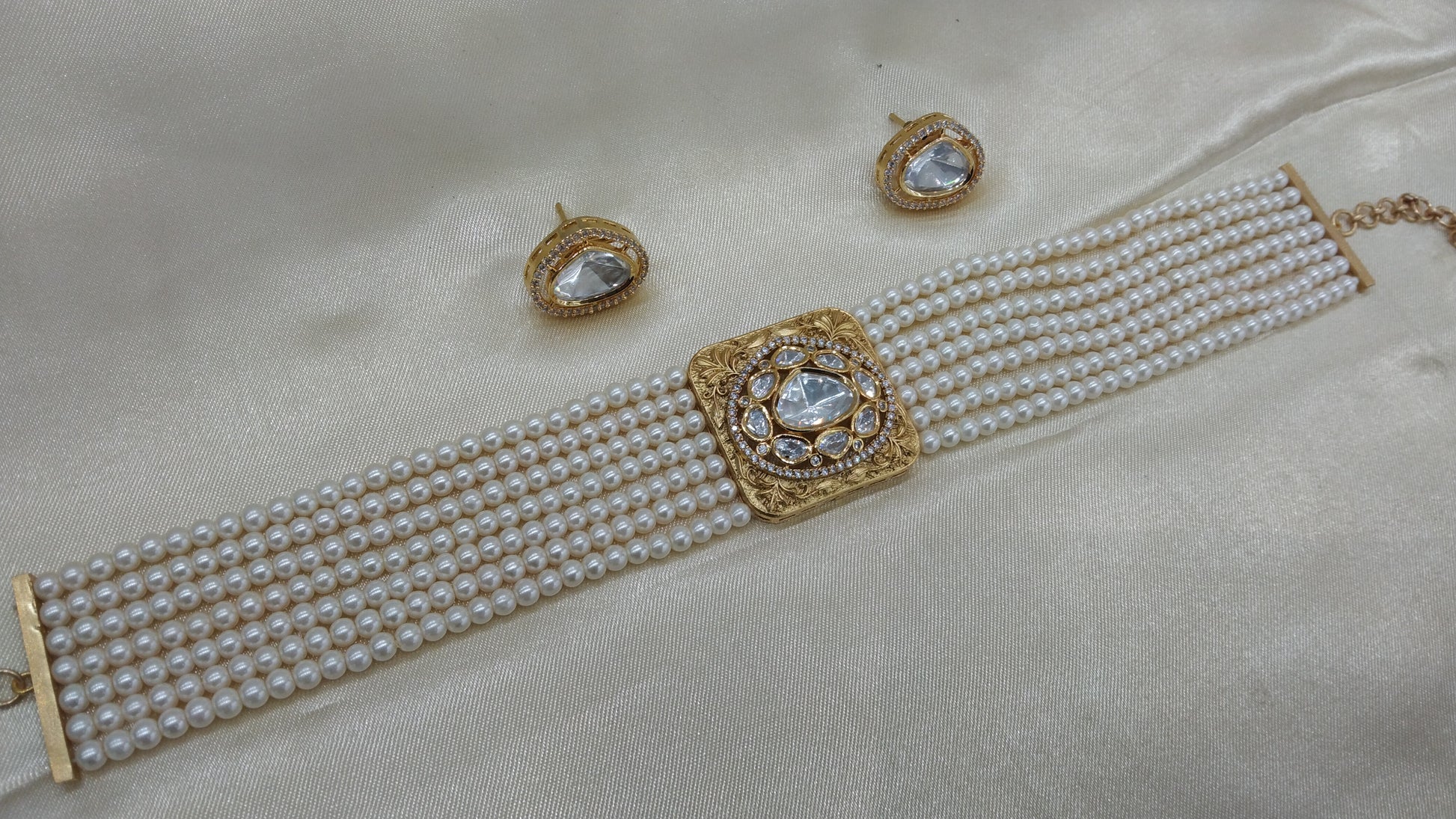 Nimo Gold white kundan Indian Choker Jewellery Set